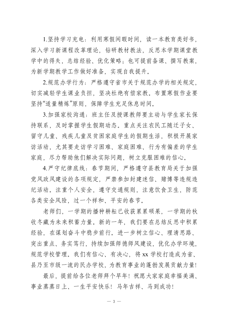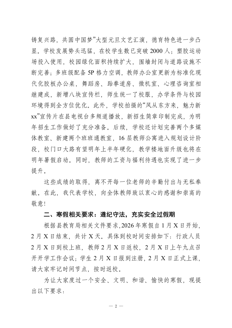 秋季学期寒假期末教师会议校长讲话:复盘工作、提要求,祝老师们寒假平安快乐各位老师:大家下午好!时光荏苒,本学期已顺利落幕。今天我们齐聚一堂,总结本学期各项工作,明确寒假期间的相关要求,为这一学期的工作画上圆满句号,也为新学期的启程做好铺垫。一、本学期工作复盘:凝心聚力,硕果盈枝本学期,在上级教育部门和董事会的正确指导下,学校全面贯彻党的教育方针,始终以教育教学质量为核心,强化教学研究与常规管理,狠抓师德师风建设与教师队伍培养,充分调动师生积极性,营造了优良的校风、教风与学风。全体教师秉持认真务实的工作作风,兢兢业业、履职尽责,发扬无私奉献、团结协作的精神,以“为人师表、教书育人”为准则,不断提升业务能力与教学热情。教学成效显著:九年级在全县调研考试中表现突出,为2026年中考奠定了坚实基础;多名师生在各级各类竞赛中斩获佳绩,彰显了学校的教学实力。小学部深耕素质教育,开设舞蹈、跆拳道、书法、英语口语外教、读书活动等特色课程,极大丰富了学生的学习生活,提升了学习兴趣。下学期,小学部还将增设经典诵读和信息技术课程,让学生在快乐中学习、在成长中进步。德育与校园建设亮点纷呈:成功举办“第四届田径运动会“同1