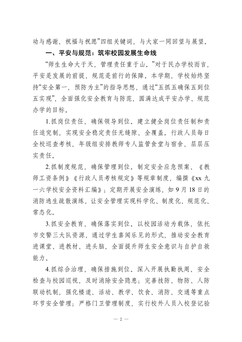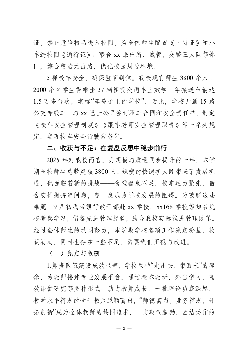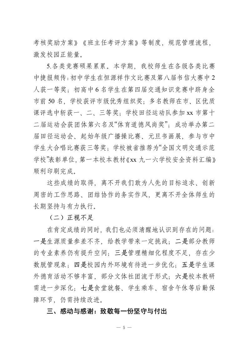 秋季学期寒假前教师会议校长讲话:平安规范是底线,有收获也有不足,感恩再出发各位老师:大家上午好!年味渐浓,紧张忙碌的本学期已近尾声,在全体教职员工的辛勤付出与通力协作下,学校各项教育教学工作圆满收官。这一学期,我们深化教改、开拓进取,创新管理机制,全力破解教育教学中的难题;老师们勤于钻研、乐于奉献,各处室工作人员相互配合、埋头苦干,在各自岗位上发光发热,于辛苦中收获成长,在奉献中感受快乐。在此,我代表学校董事会和校长会,向为学校发展默默耕耘、无私奉献的全体教职员工,致以最深深的谢意!也通过大家,向一直支持学校工作的教职员工家属们,送上诚挚的问候与美好的祝愿,祝大家身体健康、万事顺意!上周六,我们召开了学期工作总结会,各处室负责人全面复盘了本学期工作,既盘点了成绩亮点,也正视了存在的不足。四个小时的会议,大家精神饱满、畅所欲言,共同为学校的教育教学和后勤保障工作出谋划策。今天时间有限,我不再展开赘述,会后学校安排了酬劳宴,感谢大家一学期的辛劳,也请各位老师中午吃好喝好!回顾本学期的工作,我想用“平安与规范、收获与不足、感1