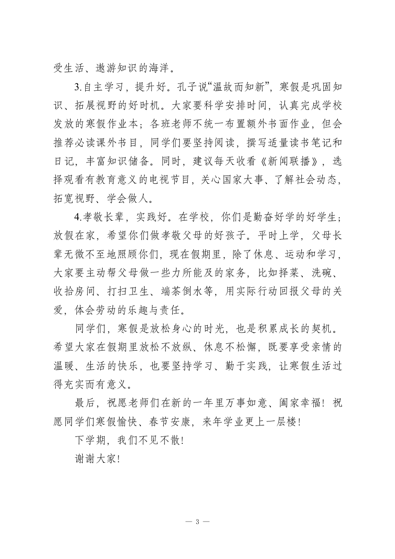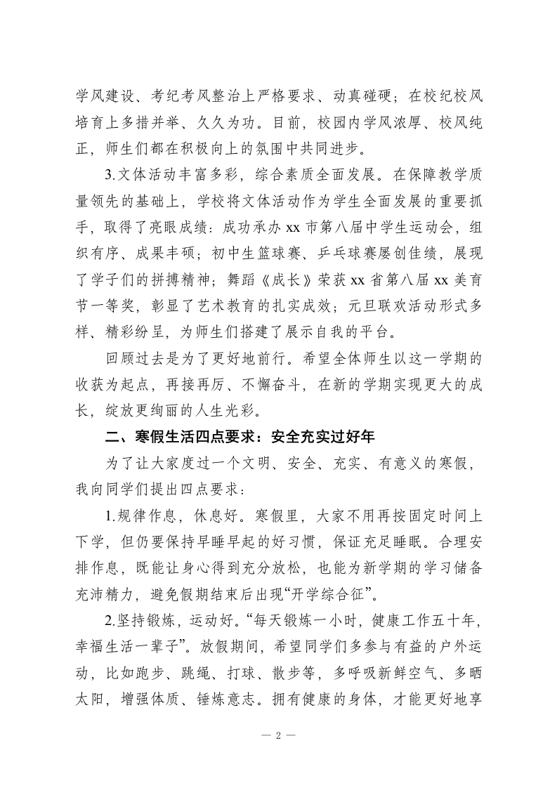 秋季学期寒假前校长总结讲话:盘点一学期成绩,给寒假生活提4点要求老师们、亲爱的同学们:大家上午好!时光匆匆,仿佛秋季开学的场景还在眼前,转眼间本学期就已圆满结束。从今天下午起,大家期盼已久的寒假正式开启,我和大家一样,满心都是欢乐与期待。这一学期,学校始终以“稳定、健康、持续发展”为核心,以提升教学质量为根本,以改革创新为动力,以完善校园硬件建设为支撑,全体师生励精图治、锐意进取,为学校提升办学品位、创建品牌学校打下了坚实基础。在此,我谨代表学校党支部、校委会,向辛勤耕耘、无私奉献的老师们致以衷心的感谢!向勤奋好学、奋勇争先、取得优异成绩的同学们表示热烈的祝贺!一、一学期工作回顾:在耕耘中收获成长1.校园环境提质升级,文化氛围愈发浓厚。经过前期的精心规划与打磨,学校遵循“净化、美化、人文化”原则,对校园绿化布局、校内道路、运动场及安全通道进行了深度改造。如今的校园,环境整洁优美,同学们讲文明、懂礼仪的意识显著增强,环境育人的效果日益凸显。2.教学质量稳步提升,学风校风持续向好。学校始终把“追求稳定优质的教育质量”作为发展核心,着力增强核心竞争力:扎实开展课堂有效性研究,优化教学方法、提升课堂效率;在1