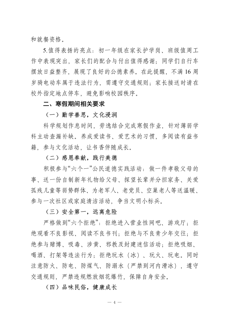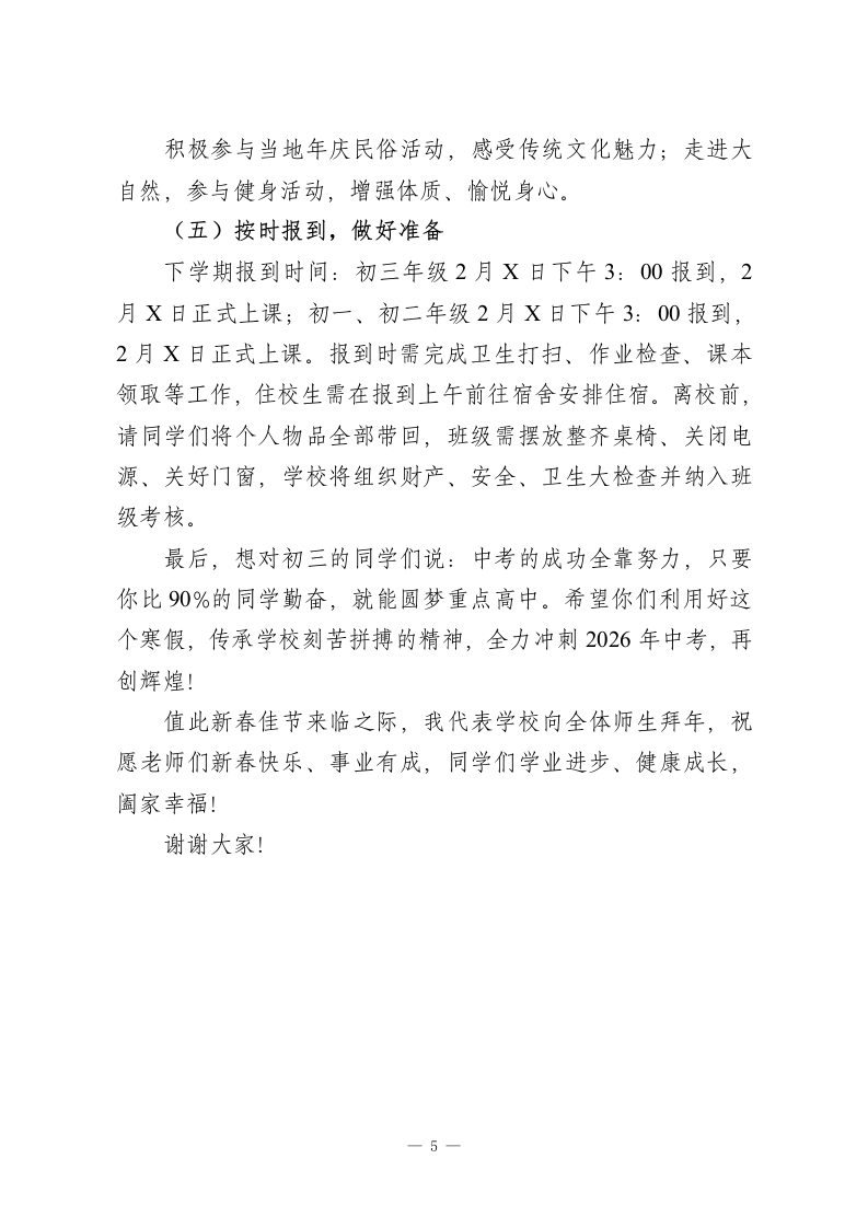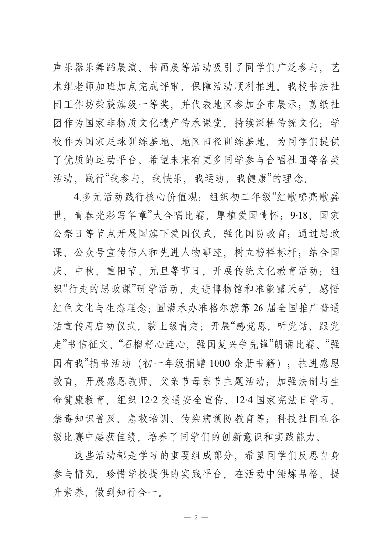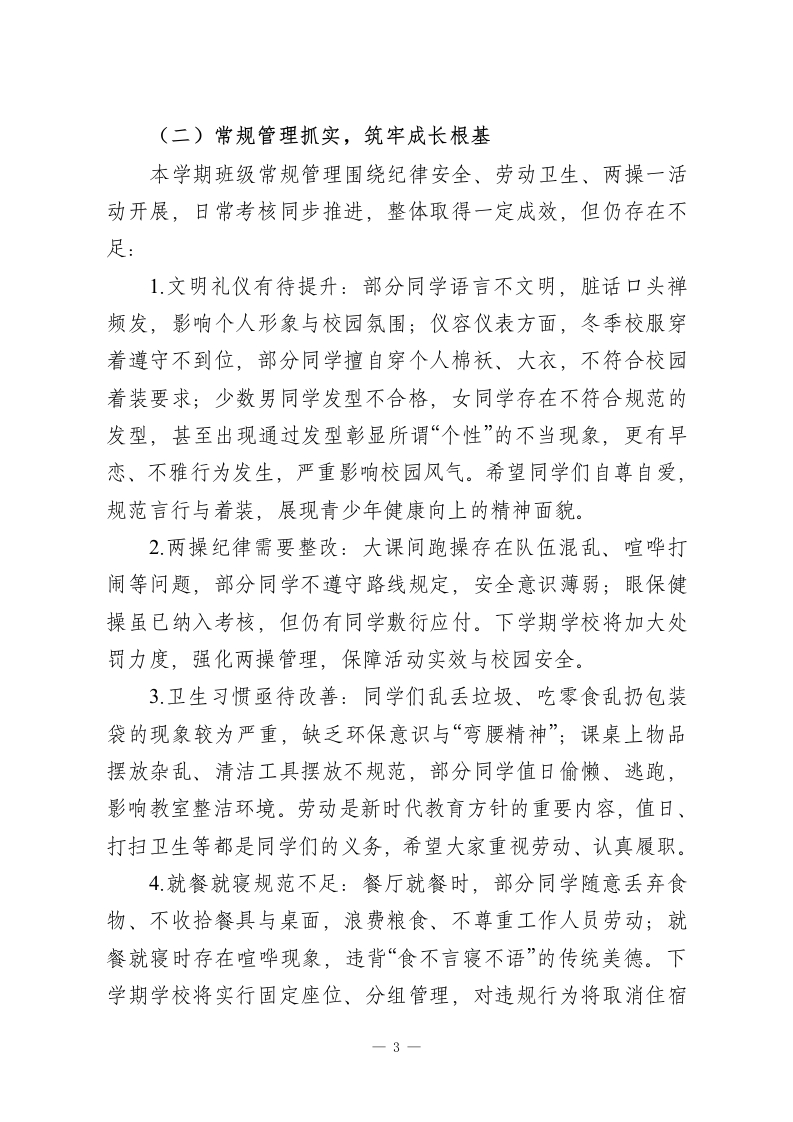 秋季学期寒假散学典礼初中德育副校长讲话:复盘成长、严守底线,平安快乐过寒假各位领导、老师们、同学们:大家下午好!回顾这一学期,同学们在校园里奋斗成长、收获进步,每一天都有新的蜕变。今天的散学典礼,是本学期最后一次集体集会,我想先和大家强调一点:学会聆听、保持安静是尊重他人的基本素养,也是自身教养的体现。希望大家珍惜这次集会,认真反思、用心感悟,把每一次集体活动都当成自我提升的机会。下面,我从德育工作复盘、寒假要求两方面和大家交流。一、本学期德育工作回顾(一)丰富德育活动,助力全面发展1.七年级新生军训圆满完成,经过严格训练,各班班风正、学风浓,同学们精神风貌焕然一新。2.成功举办第三十一届田径运动会暨首届“力量杯"”师生运动会。运动场上,同学们奋勇拼搏、赛出风格,开幕式上舞蹈社团的啦啦操、学生会的特色表演赢得全场好评。期间虽因宣传视频内容有过小插曲,但同学们敢于表达诉求的态度值得肯定,同时也提醒大家,表达诉求要选择智慧、官方的方式,避免引发不必要的问题。3校“体艺节”精彩纷呈,拔河、万米接力、“金话桶”演讲、