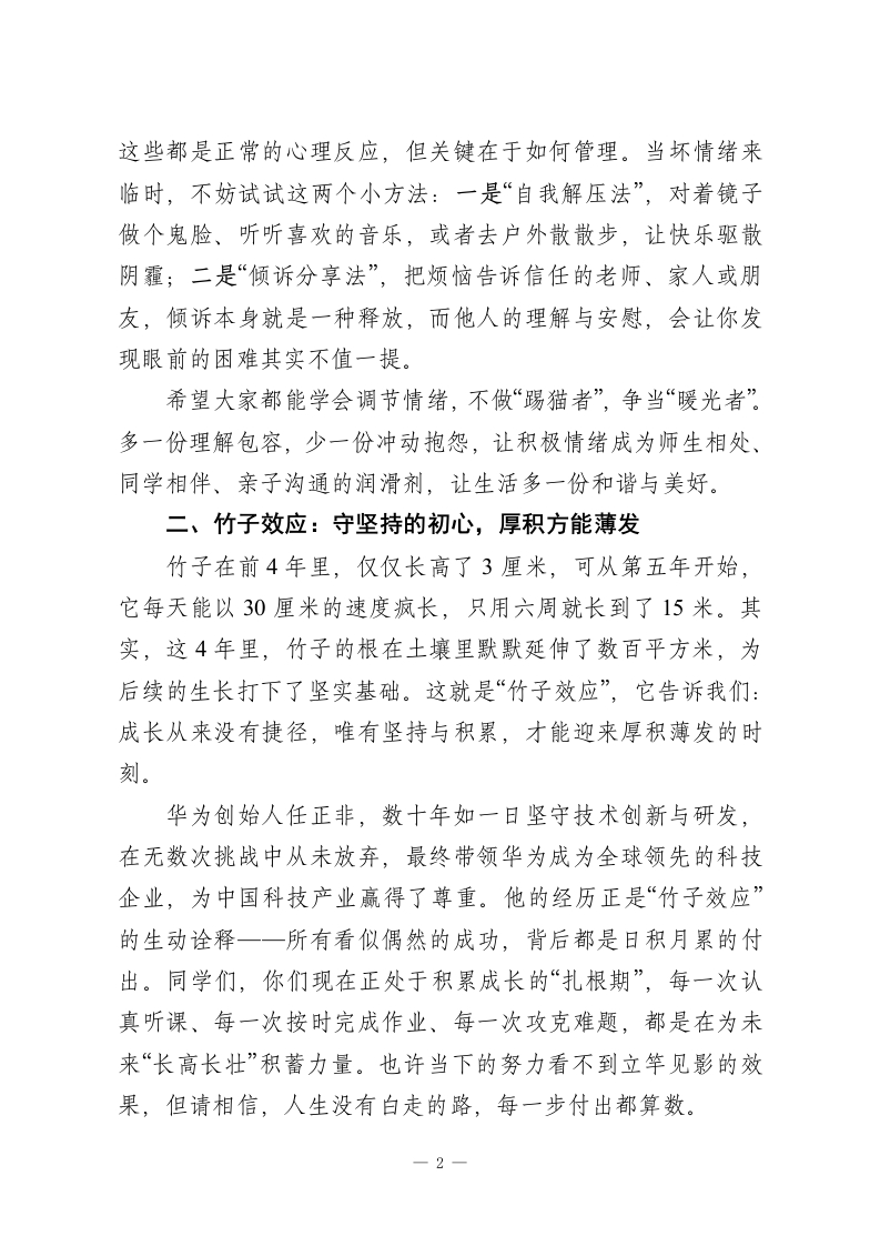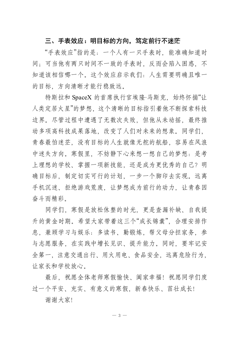 秋季学期寒假散学典礼校长讲话:3个成长锦囊,陪你过寒假、迎新春老师们、同学们:大家下午好!金龙辞旧岁,瑞雪迎新春。紧张充实的学期已圆满落幕,愉快的寒假即将开启。回顾这一学期,校园里处处洋溢着奋斗的气息:早自习的朗朗书声、课堂上的专注眼神、课间的文明嬉戏、活动中的尽情绽放,每一幕都见证着大家的成长与进步。全校师生凝心聚力、锐意进取,用实际行动书写着学校的精彩篇章。在此,我代表学校,向勤奋努力、天天向上的全体同学表示热烈祝贺!向辛勤耕耘、无私奉献的全体老师致以衷心感谢!今天的散学典礼,我想送给大家三个“成长锦囊”,也就是三个富有启示的效应,希望能为大家的寒假生活和未来成长指引方向。一、踢猫效应:做情绪的主人,传递温暖与包容“踢猫效应”讲述了这样一个故事:一位男士在公司被老板批评后,回家把气撒在调皮的儿子身上;儿子受了委屈,转头踢了地上的猫;受惊的猫跑到街上,导致卡车司机紧急避让时撞伤了路边的孩子。这个故事告诉我们,消极情绪就像多米诺骨牌,一旦失控,就会引发连锁反应,伤害他人也伤害自己。成长路上,我们难免会遇到失落、紧张、愤怒等情绪:被老师批评时的沮丧、考试前的焦虑、和朋友闹矛盾时的烦躁…1