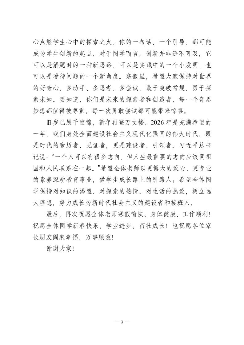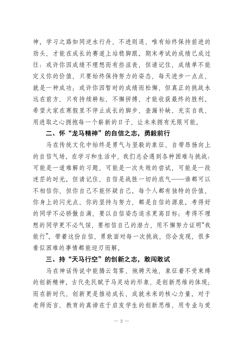 秋季学期寒假散学典礼校长讲话:承马之三志,赴春之新程亲爱的老师们、同学们:大家下午好!从明天起,大家期盼已久的寒假就要正式开启了。此刻,我的心情和大家一样,满是欢乐与期待。2026将至,提前祝愿全体师生马年吉祥、新春快乐、万事顺意!回望这一学期,校园里处处是奋斗的身影,时时有成长的惊喜。老师们默默耕耘、潜心教学,同学们勤奋刻苦、积极向上,师生携手在成长路上稳步前行。本学期,学校以课堂教学为核心,狠抓教学常规与教学质量,各学科成绩均有不同幅度提升,收获了沉甸甸的成果。这份成绩来之不易,是每一位老师的辛勤付出、每一位同学的不懈努力换来的。“一份耕耘,份收获”,我为大家的坚持与进步感到骄傲和欣慰,也相信在下一学期,全体师生再接再厉,学校的教育教学工作必将再创佳绩!马,是中华民族传统文化中极具象征意义的意象,承载着昂扬向上的精神品格。它所蕴含的进取、自信、创新三种核心特质,正是我们成长路上最珍贵的精神养分。今天的散学典礼,我想借“马之三志”与大家共勉,希望大家带着这份精神力量,在寒假里充实自我,在新的一年里奋勇争先。一、秉“策马扬鞭”的进取之志,笃行不怠马向来以奔腾向前的姿态示人,象征着永不停歇的进取精一1
