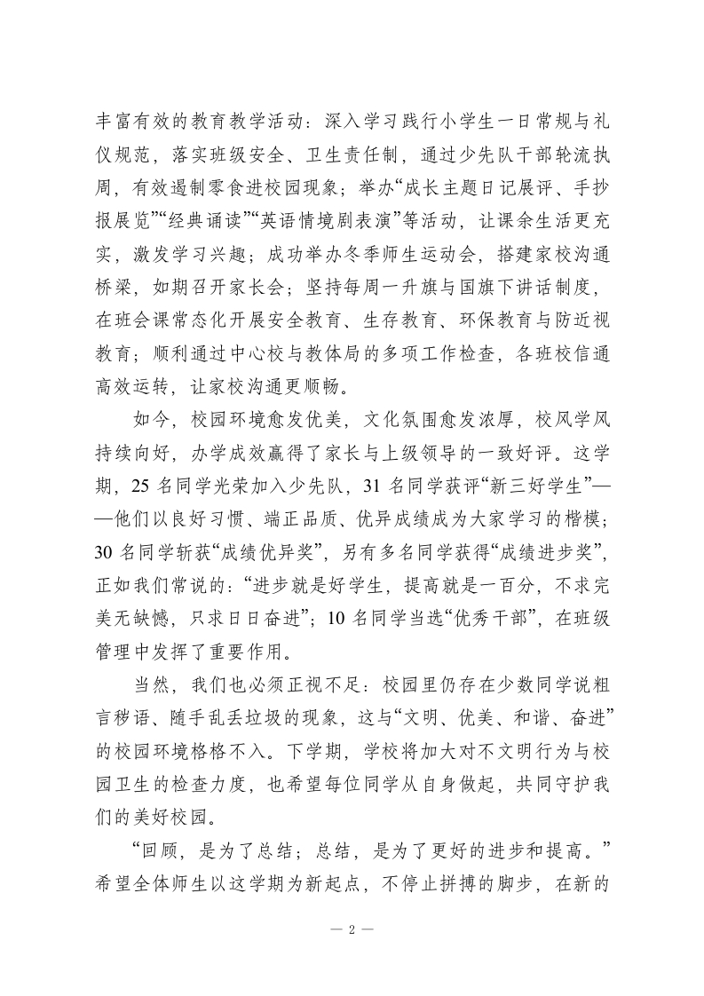 秋季学期寒假散学典礼校长讲话:复盘过往促成长,平安喜乐过寒假老师们、同学们:上午好!回望本学期,每一天都镌刻着我们的奋斗足迹,每一刻都见证着彼此的成长蜕变。清晨的教室里,书声琅琅唤醒校园:课间的走廊上,文明游戏、安全休憩蔚然成风:课堂上,大家专注倾听、积极思考;课后,认真作业、工整书写成为常态;校园外,同学们诚实守信、文明有礼、爱护公物。全体师生兢兢业业、积极进取,从细节做起、从当下发力,教师们以专业践行使命,同学们以努力诠释责任,共同书写了这学期的精彩篇章。在此,我代表全体同学,向辛勤耕耘、无私奉献的老师们致以最衷心的感谢!也代表全体教师,向奋发向上、日日精进的同学们表示最热烈的祝贺!同学们,你们或许不会忘记:为了帮你们树立更高学习目标,老师一次次促膝长谈、给予信心;为了让你们扎实掌握知识,老师一遍遍耐心讲解,甚至延误了回家的脚步;为了帮你们养成良好习惯,老师谆谆教海,哪怕嗓音沙哑也不松懈;为了让基础薄弱的同学跟上进度,老师牺牲休息时间无偿补习。这点点滴滴的付出,都源于对你们未来的期许一一愿你们在充满竞争的时代里,凭借知识立足,拥有更广阔的天地。这一学期,学校在全体师生的共同努力下,开展了一系列1