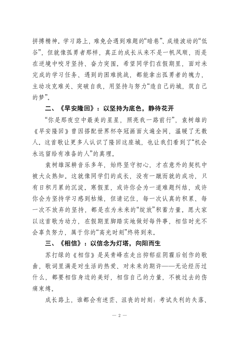 秋季学期寒假散学典礼校长讲话:勇敢、坚持、有信念亲爱的老师们、同学们:大家好!时光匆匆,本学期已圆满落幕。从明天起,期待已久的寒假就要正式开启了,我和大家一样,满心都是欢乐与对假期的憧憬。回望这一学期,每一天都镌刻着同学们的奋斗身影,每一刻都见证着大家的成长与收获。面对日常学习中的挑战,全体师生携手并肩,无论是课堂上的专注研讨,还是各类活动中的通力协作,都展现了蓬勃向上的精神风貌。在大家的共同努力下,学校在管理优化、校园文化建设等方面都取得了可喜的成绩,这一学期,注定成为我们共同的珍贵回忆。放假不是“放飞自我”的借口,更不是停下脚步的理由。假期是沉淀成长的契机,也是积蓄力量的时光。今天的散学典礼,我想分享三首曾在国际赛事中传递正能量的中文歌,与大家共勉,愿这些歌曲中的精神,能伴随大家度过一个有意义的寒假。一、《孤勇者》:以勇敢为铠甲,直面挑战“爱你孤身走暗巷,爱你不跪的模样”,陈奕迅的《孤勇者》至今仍能让很多同学随口哼唱。这首歌之所以能引发广泛共鸣,不仅因为旋律激昂,更因为背后藏着作者唐恬与癌症顽强抗争的励志故事。这首歌传递的,是绝境中不低头、低谷中不放弃的勇气与-1