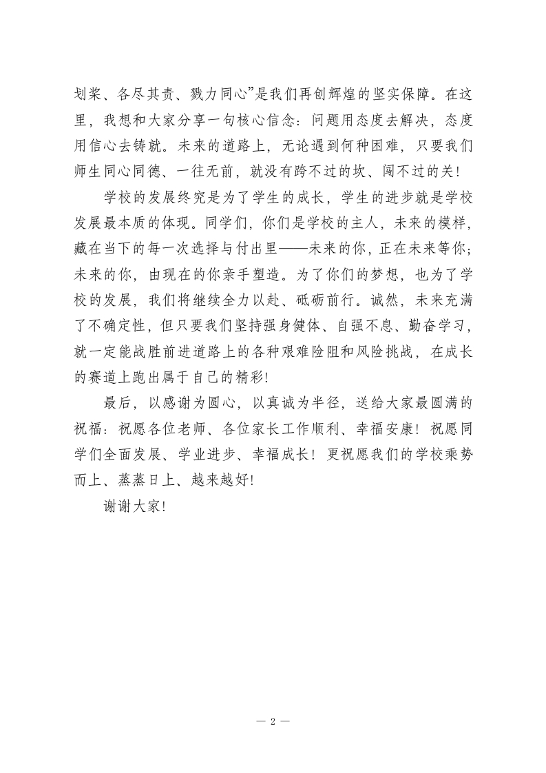 秋季学期寒假散学典礼校长讲话:有信心就有好态度,有态度就能解决问题各位家长、老师们,亲爱的同学们:大家下午好!岁聿云暮,新元肇启。值此辞旧迎新之际,我谨代表学校领导班子,向兢兢业业、无私奉献的全体教职员工,向刻苦学习、茁壮成长的同学们,致以最诚挚的问候和美好的新春祝福!也向本学期受到表彰的各位同学,送上最热烈的祝贺!回望本学期,全校上下始终坚守“安全为天、质量为本、责任为魂、学校为家”的工作指导思想,求真务实、开拓创新,积极探索符合我校特色的教育教学管理模式,各项工作均取得了突破性进展。老师们舍小家为大家,起早贪黑钻研教学、悉心辅导学生,用高尚的师德和精湛的智慧赢得了社会的广泛赞誉;学校管理机制高效运转,领导班子团结协作、锐意进取,校园文化建设亮点纷呈,年级管理各具特色,后勤服务保障有力,育人环境持续优化,教学质量再攀新高。最令人欣慰的是,全校师生精神面貌焕然一新,凝聚力、向心力不断增强,“再创辉煌”已成为每一位“xx人”的共同期盼与行动自觉!Xx学校在稳步前进、持续发展、不断蜕变,这早已是全社会的共识!2026年的曙光即将照亮前行之路。新的一年,我们既面临着难得的发展机遇,也肩负着改变自我、超越自我的时代挑战。“吾爱吾校、勇立潮头、行稳致远”是我们不变的座右铭,“众人1