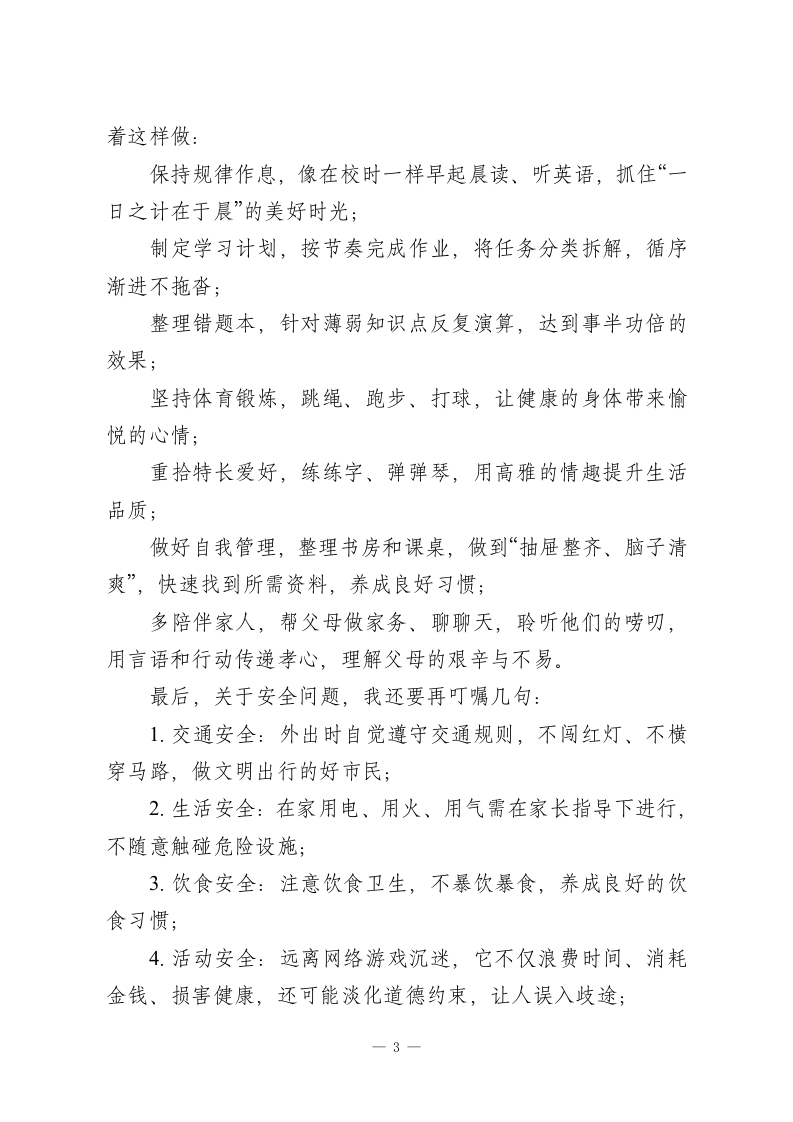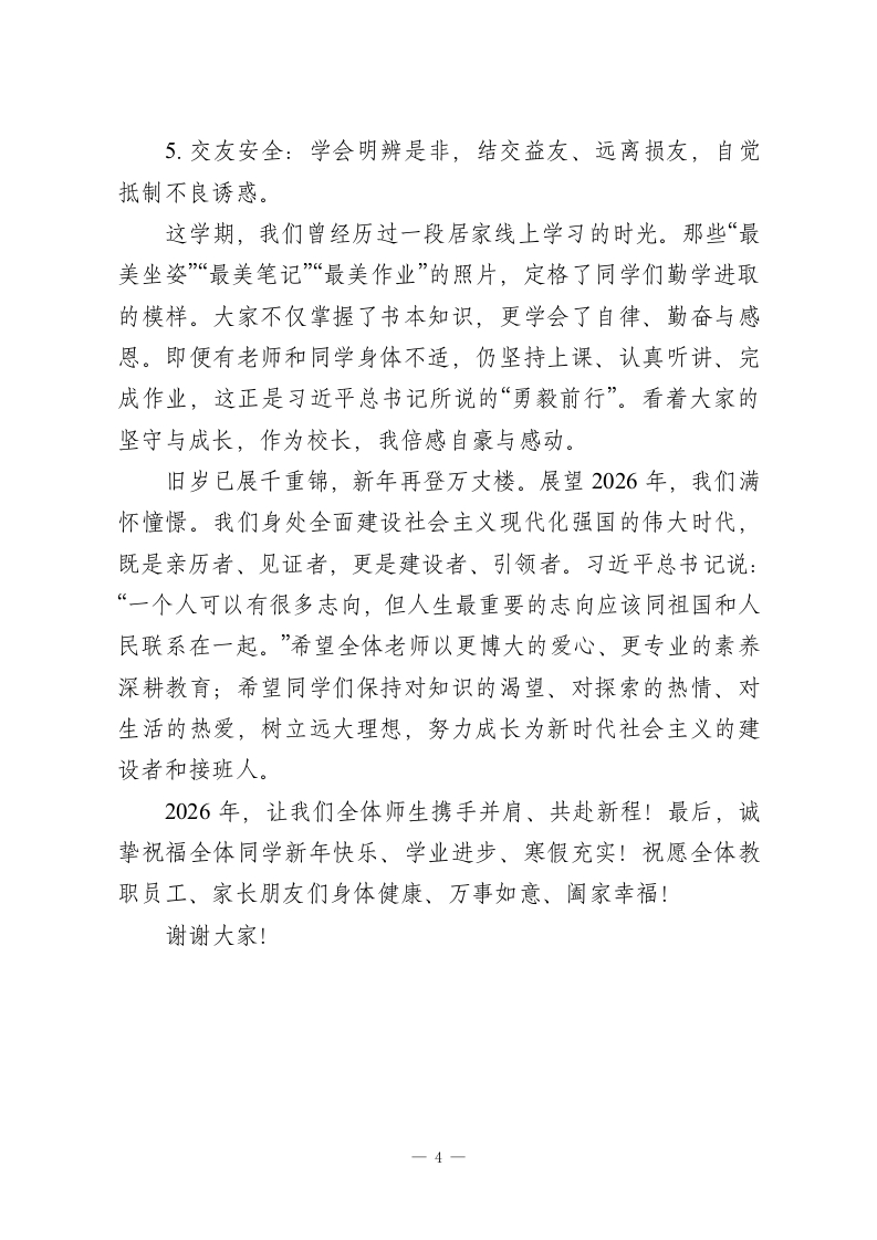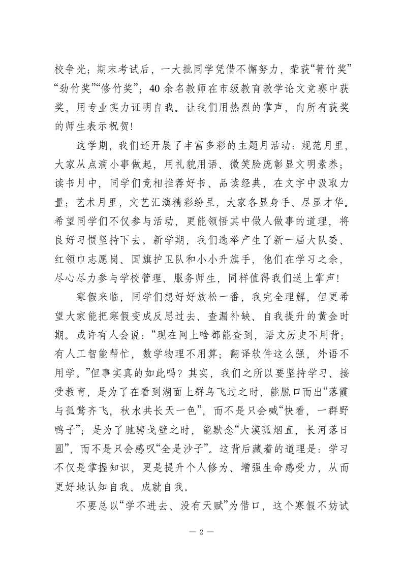 秋季学期寒假散学典礼校长致辞:带着希望过寒假,既要放松也要进步老师们、同学们:上午好!日月其迈,岁律更新。当Xx学校桂花树上,挂满同学们承载心愿的千纸鹤时,崭新的2026年已悄然临近,愉快的寒假也如期而至。翻看那些五颜六色的千纸鹤,字里行间满是真诚与期盼:有人盼新年成绩再攀新高,目标清晰;有人愿家人平安健康,心存感恩;有人祝学校愈发美好,爱校如家;也有人期待自己快快长大,迎接新变化。是啊,未来永远值得憧憬,而这份美好的希望,正是我们一路前行的不竭动力。时间记录坚实脚步,岁月镌刻奋斗足迹。回望2025年,国家发展硕果累累:国产大飞机迭代升级、新能源汽车技术领跑全球、航天探索不断刷新纪录、“奋斗者”号持续深潜探秘,中国制造在世界舞台绽放光彩。国货崛起、科技突破,处处都是日新月异的创造,无不彰显着中国自强不息的奋进精神。聚焦我们的校园,这一学期同样充满成长与收获。清晨的教室里,书声琅琅;课间的校园里,文明嬉戏;课堂上,同学们专注听讲、积极思考;课后,大家认真完成作业、主动查漏补缺。日复一日的坚持中,老师们的陪伴与帮助始终温暖有力。在全体师生的共同努力下,学校收获了诸多荣誉:获评x市校本教研先进校,学校团委荣获x省红旗团委称号;近百名同学在xx市中学生与社会作文比赛、英语能力竞赛中斩获佳绩,为-1