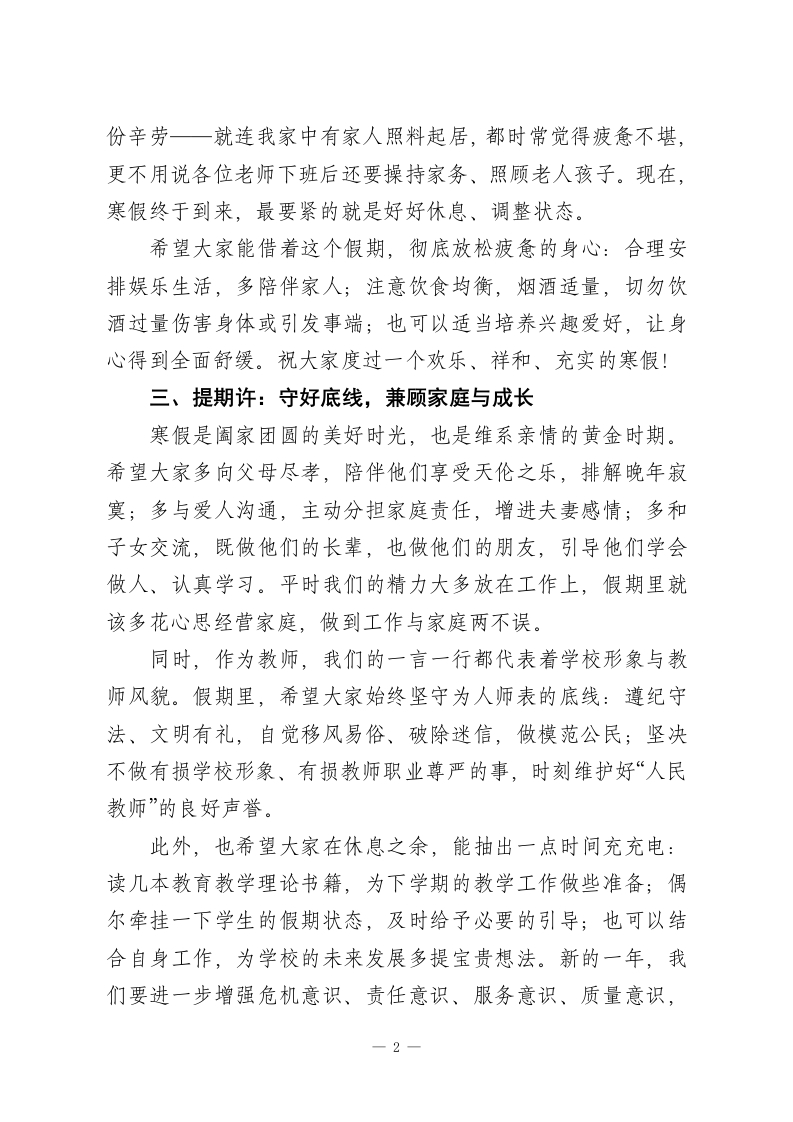 秋季学期末寒假教职工聚会校长讲话:寒假好好玩、顾好家、树好形象,校长的3个叮嘱各位老师:大家晚上好!借着放假前这场全校教职工聚会,我想和大家说几句心里话,也借此感谢大家一学期来对学校工作、班子工作以及我个人工作的理解与支持。一、致敬意:感谢每一份坚守与付出过去的这一学期,大家不仅圆满完成了日常教学任务,还积极配合学校推进各项阶段性工作,顺利达成了上级下达的各项指标。我亲眼见证了许多动人的瞬间:年轻老师为了不耽误教学,忍痛放下生病的孩子;不少老师带病坚守讲台,从未因身体不适而懈怠;还有太多老师天不亮就出门赶路,天黑透了才踏上归途。即便工作繁忙、压力重重,大家也毫无怨言,用实际行动诠释了教师职业道德的真谛。学校取得的每一项成绩、获得的每一次家长与社会的好评,都不是某一个人的功劳,而是我们这个集体凝心聚力、共同奋斗的结果。在这里,我代表学校,向每一位辛勤付出的老师,致以最深深的敬意!二、致问候:愿大家好好休整享假期一学期来,大家始终在忙碌紧张的节奏中奔波,我深知这一1