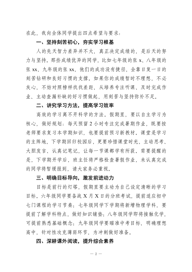 秋季学期期末考试总结表彰大会校长讲话:表彰优秀励初心,蓄力假期启新程各位老师、同学们:大家下午好!随着期末考试的圆满落幕,本学期也即将画上圆满句号。在全体师生的共同努力下,同学们严守考纪、诚信应考,用认真的态度完成了本学期的学业检验,真实反映了学习成果。今天,我们齐聚一堂,召开总结表彰大会,既要为优秀者喝彩,也要为未来的前行之路蓄力。首先,请允许我代表学校全体教师,向每一位勤奋耕耘、追求上进的同学致以亲切的问候!向在本次考试中取得优异成绩的班级和同学,致以最热烈的祝贺!经过严格评选,本次大会将表彰一批表现突出的学子:罗Xx等29名同学荣获二等奖,张xx等45名同学荣获三等奖,刘xx等21名同学获评进步奖,朱Xx等7名同学被评为优秀班干部,谢Xx等7名同学被评为优秀学生。此外,一等奖获奖同学将在现场进行颁奖,让我们用掌声向所有获奖同学表示祝贺!这份成绩的背后,离不开同学们的刻苦努力,更离不开老师们的辛勤付出。借此机会,我代表学校,向为同学们成长默默奉献、勤奋耕耘的全体教师,致以最衷心的感谢!老师们、同学们,总结表彰不是终点,而是新的起点。成绩揭晓后,我们既要肯定收获,更要反思不足。寒假将至,这既是放松休整的时光,也是查漏补缺、弯道超车的黄金时期。1