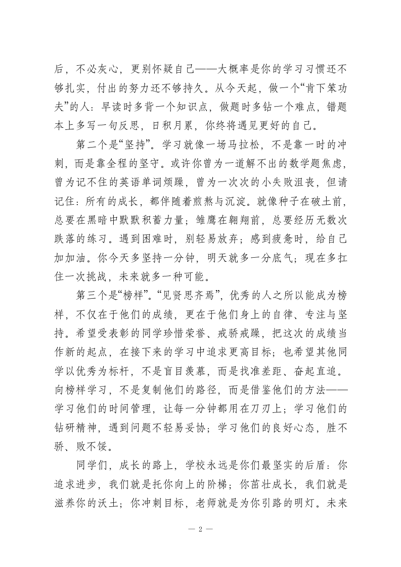 秋季学期期末考试总结表彰大会校长讲话:以勤奋筑根基,以拼搏赴新程亲爱的老师们、同学们:大家下午好!今天,我们欢聚一堂,隆重召开本学期期末考试总结表彰大会。首先,我代表学校全体教职工,向每一位勤奋进取、不懈拼搏的同学致以诚挚的问候!向在本次考试中脱颖而出的优秀班级和同学,致以最热烈的祝贺!一个学期的时光匆匆而过,课堂上的专注思考、自习时的默默耕耘、操场上的活力奔跑,都见证着大家的成长与蜕变。我欣慰地看到,同学们在这段旅程中收获满满:有的同学坚守集体荣誉,主动为班级贡献力量;有的同学品德为先,用礼貌与谦让温暖身边人;有的同学紧盯目标、勇攀高峰,用优异成绩证明实力;还有的同学不惧困难、迎难而上,在进步中突破自我。今天站上领奖台的,是众多优秀学子中的代表,但这份拼搏进取的精神,值得每一个人学习。在这里,我想和大家分享三个成长关键词:第一个是“勤奋”。古往今来,所有成功的背后,都离不开日复一日的刻苦付出。科学家凌晨实验室的灯光,文学家案头堆积的手稿,奥运健儿赛场下的千百次训练,都在诉说着同一个道理:天赋或许能给你起点,但勤奋才能决定你的终点。人的先天智力差异并不大,那些成绩优异的同学,未必是最聪明的,但一定是最勤奋、最会坚持的。如果此刻你的成绩暂时落1
