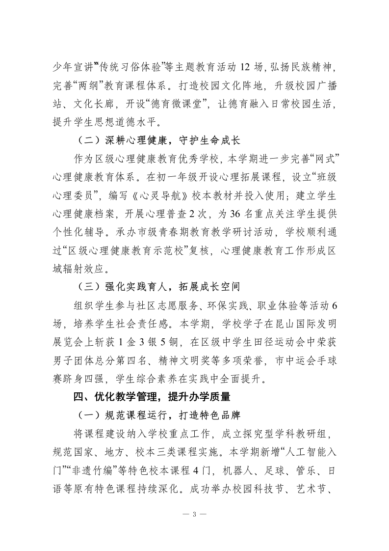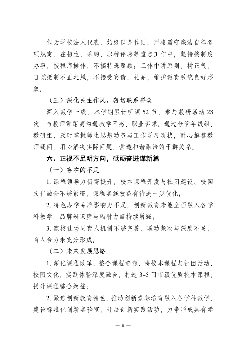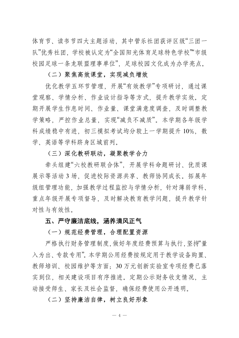 秋季学期校长述职报告:把校园打造成大家都舒心的地方,让老师教得开心、学生学得快乐尊敬的各位领导、各位老师:大家好」自任职以来,我始终坚守教育初心,秉持“让学生体验成长快乐、让教师享受职业幸福、让学校充满智慧温馨”的办学理念,以营造“和谐幸福校园”为核心抓手,在教育改革浪潮中坚定素质教育方向,推动学校内涵发展。本学期已近尾声,现将本学期履职情况、廉洁自律表现及未来规划汇报如下,请予评议。一、锚定发展愿景,夯实办学根基(一)科学谋划蓝图,引领内涵发展牵头制定学校《2025-2028年发展规划》,确立“创新育人、特色兴校”核心方向,申报区级重点课题《幸福校园视角下初中内涵发展长效机制构建研究》,从“环境优化、管理创新、师资提质、教学增效、德育润心”五大维度推进学校可持续发展。结合办学实际,明确以“创新教育”为特色品牌,以新基础教育理念为引领,以创建区域优质学校为目标,细化年度工作清单,确保各项规划落地见效。(二)深化民主管理,凝聚发展合力坚持“民主治校、开门办学”,本学期召开教代会2次,审议通过《教师专业成长激励办法》《校园特色课程建设方案》