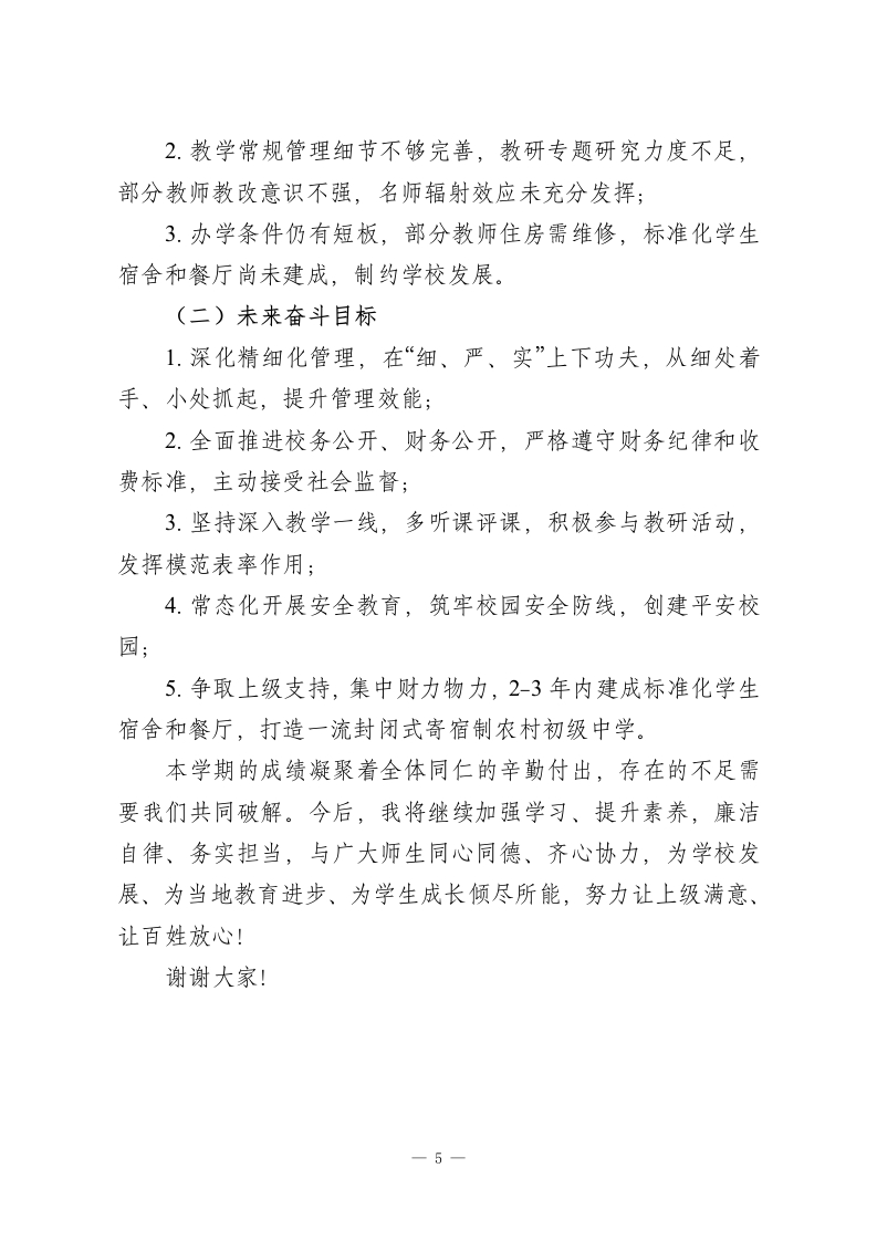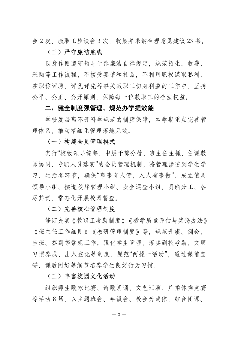 秋季学期校长述职报告:围着“办好人民满意的教育”干,实实在在做事尊敬的各位领导、人大政协同志、各位家长、全体老师:大家下午好!首先,向前来参会、支持学校工作的各位表示崇高的敬意和衷心的感谢!本学期已圆满结束,在镇政府的大力支持、教育局的亲切指导下,在全校教职工的同心协力下,学校顺利完成各项工作任务,办学质量稳步提升。现将本学期履职情况、工作成效及未来规划汇报如下,请予评议。一、修身立德强素养,以身作则树标杆作为校长,我始终坚守“堂堂正正做人、坦坦荡荡做事、扎扎实实工作、兢兢业业从教”的准则,把办好人民满意的教育作为初心使命。(一)强化理论武装坚持每天学习政治理论与教育教学业务知识,深入领会党的教育方针和政策要求,不断提升政治敏锐性、决策科学性和管理合理性。带头参加各类政治学习和业务培训,将科学发展理念融入学校管理全过程,始终以集体利益为重,从大局出发谋划工作。(二)坚持民主治校严格执行民主集中制,落实校务公开、财务公开制度,重大事项经班子集体研究决定,不独断专横、不以权谋私。推行以人为本的管理模式,倾听教职工心声,团结依靠全体师生,形成“心往一处想、劲往一处使”的良好氛围。本学期召开教代1