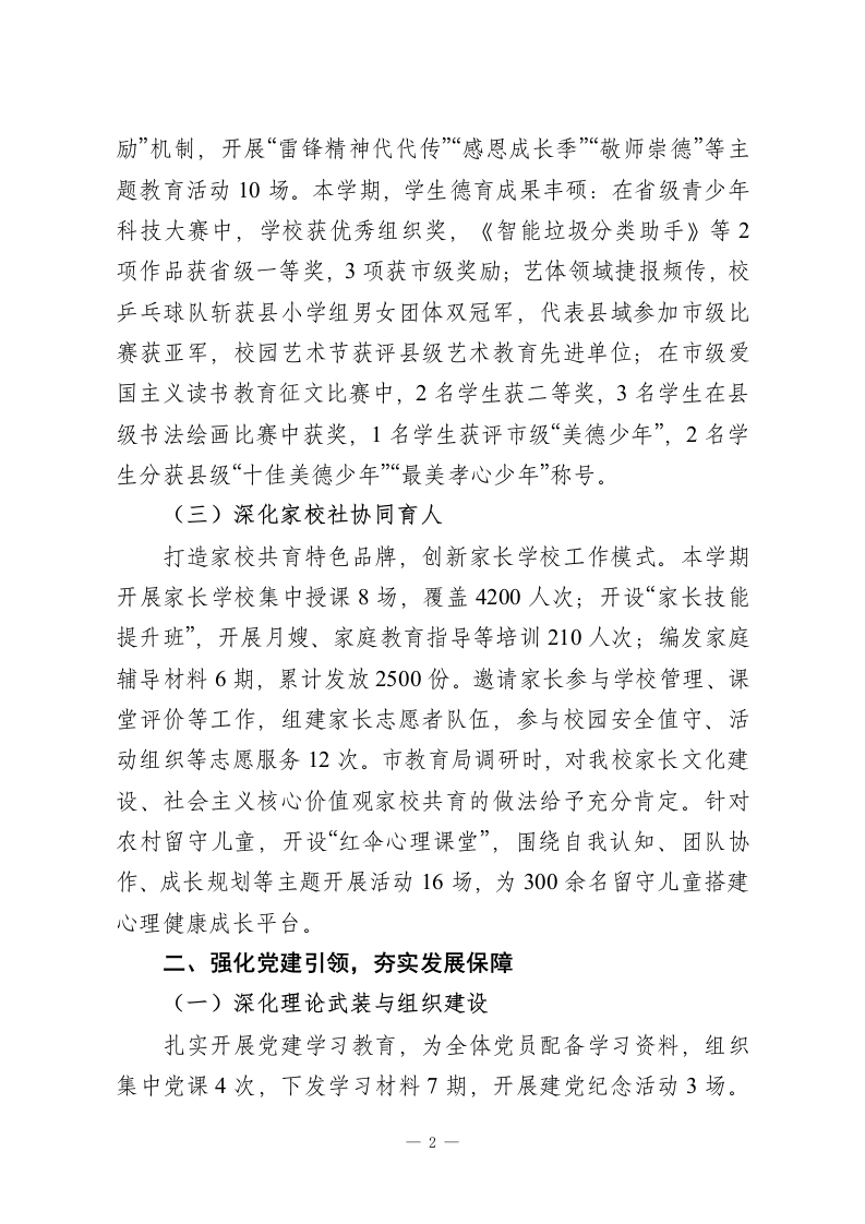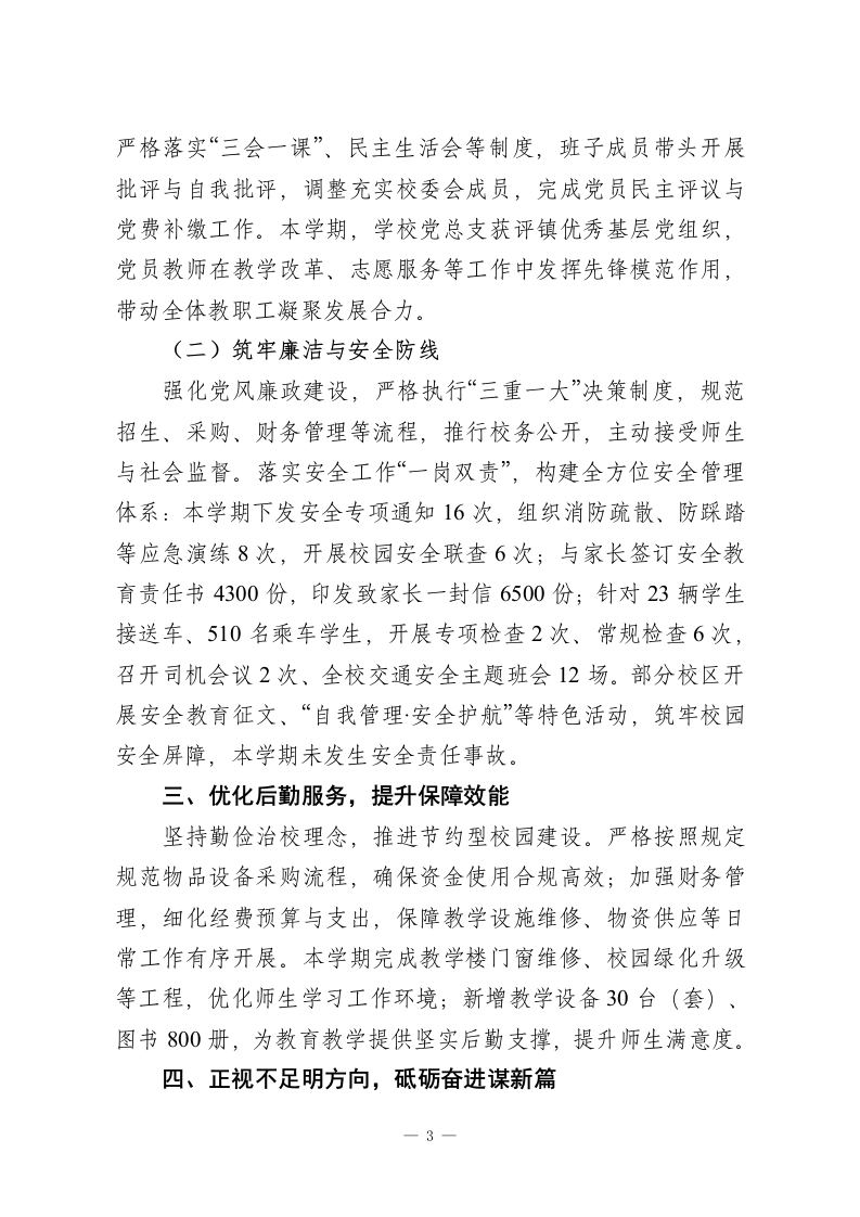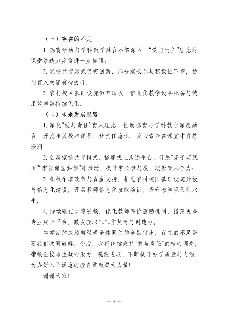 秋季学期校长述职报告:以爱为魂守初心,以责为纲促发展尊敬的各位领导、各位老师:大家好!本学期已圆满落幕。本学期,在上级教育主管部门的悉心指导下,在全体教职工的奋力拼搏与社会各界的鼎力支持下,学校以“爱与责任”为核心理念,锚定内涵发展目标,借教育综合督导评估、义务教育均衡发展深化建设的契机,打造特色亮点、破解发展难题,圆满完成了学期初制定的各项工作任务。现将本学期履职情况、廉洁自律表现及未来规划汇报如下,请予评议。一、深耕“爱与责任”文化,筑牢育人根基(一)打造浸润式校园文化围绕“让爱与责任同行”核心理念,推动校园环境文化升级。全体师生共同参与展板设计、墙壁文化打造,让每一处空间都传递育人温度。教师层面聚焦“三爱四责”教育,通过师德讲堂、先进事迹分享等活动,强化“爱自己、爱学生、爱学校”的职业情怀,树立“对学生当下负责、对成长负责、对终身发展负责”的育人担当;学生层面深化“五爱四责”教育,培养爱祖国、爱校园、爱师长、爱父母、爱自己的情感,强化对自我、集体、家庭、社会的责任意识,让爱与责任融入日常言行。(二)构建多元化德育体系以立德树人为根本,形成“课堂渗透+实践活动+校园文化”三位一体的德育平台。推行学生“自我教育、自我管理、自我激一1
