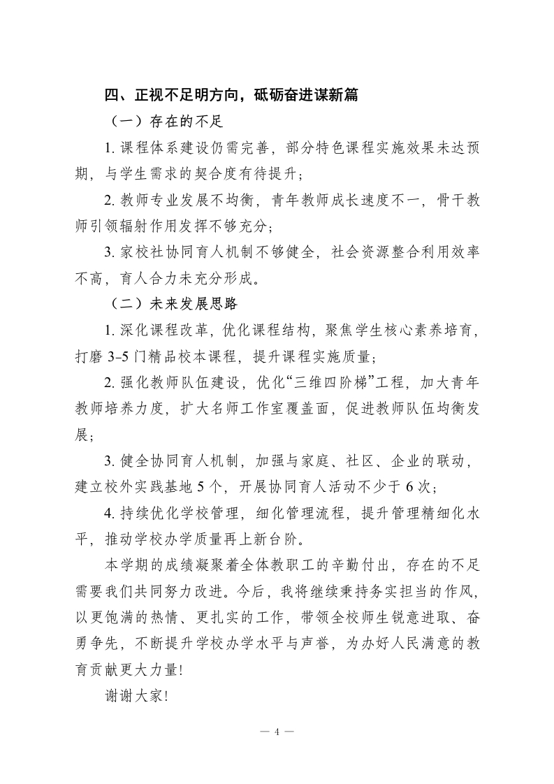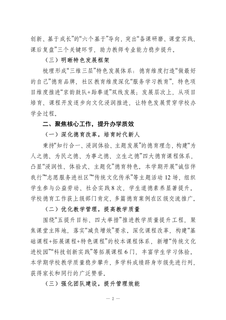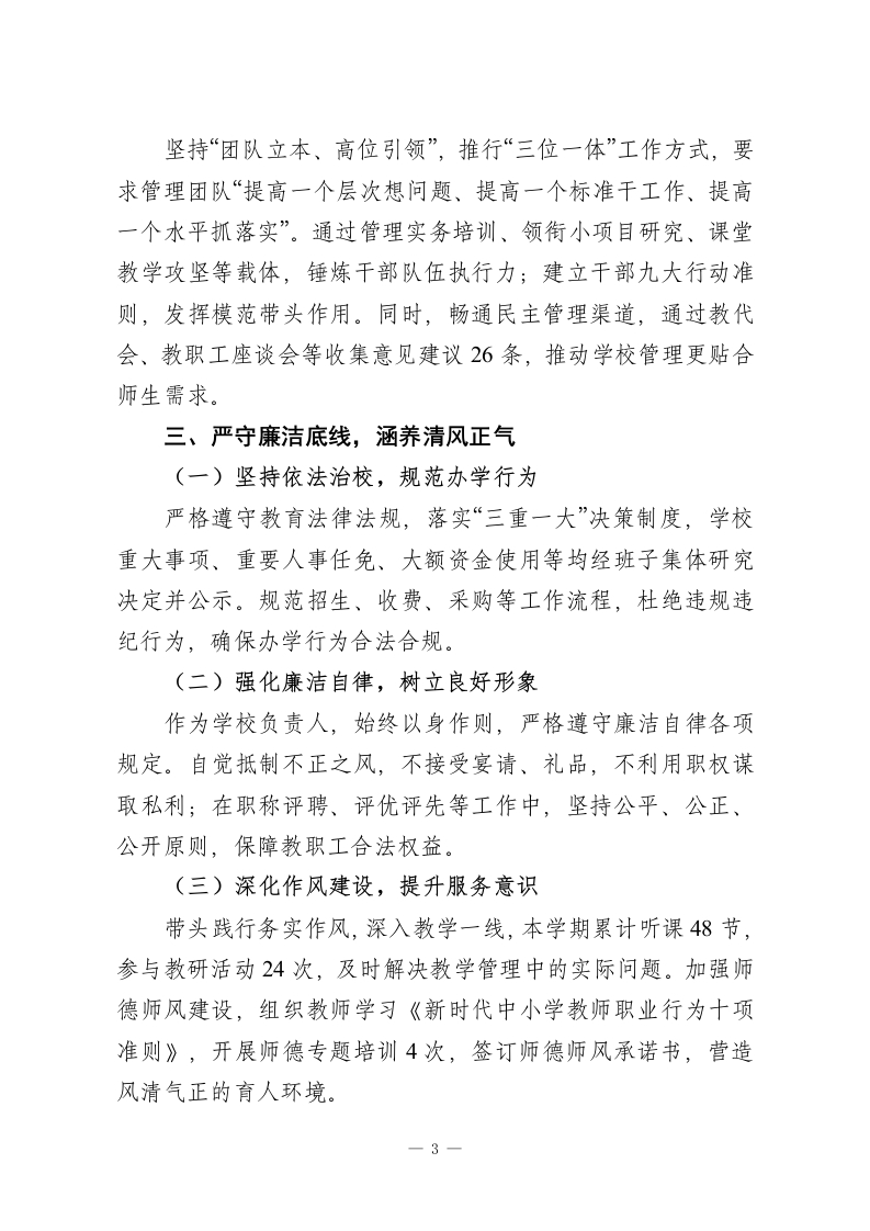 秋季学期校长述职述廉报告:以理念为引提质效,以实干为基促发展尊敬的各位领导、各位老师:大家好!本学期已顺利收官。本学期,在上级教育主管部门的正确指导下,我始终秉持“理念先行、注重校本、务实求效”的工作原则,围绕“质量、特色、服务”三大核心主题,带领全校教职工深化教育教学改革,推进学校管理科学化、精细化,圆满完成了各项工作任务。现将本学期履职情况、廉洁自律表现及未来规划汇报如下,请予评议。一、深耕办学理念,夯实发展根基(一)完善办学思想体系进一步丰富学校“五为本”办学理念内涵,明确“为学生提供成人、成长、成功的多元平台,提升学习生活品质,为终身发展奠基”的核心目标,确立“适位发展、可持续发展、特色发展”三大路径。结合新时期教育要求,优化学校科学管理“三维六面”结构,聚焦民主、专业、质量、执行力、特色、文化六大维度,推动管理效能全面提升。(二)构建教师成长体系深化教师专业发展“三维四阶梯”工程,以“需求驱动、专业合作、支持保障”为三大维度,通过“新秀教师孵化、骨干教师培养、学科带头人培育、名师领航”四阶梯建设,加速教师队伍成长。搭建“专业学习、案例分析、行动研究、实践反思”四大平台,强化“基于学情、基于课标、基于问题、基于实效、基于-1-