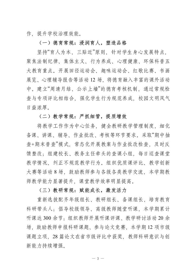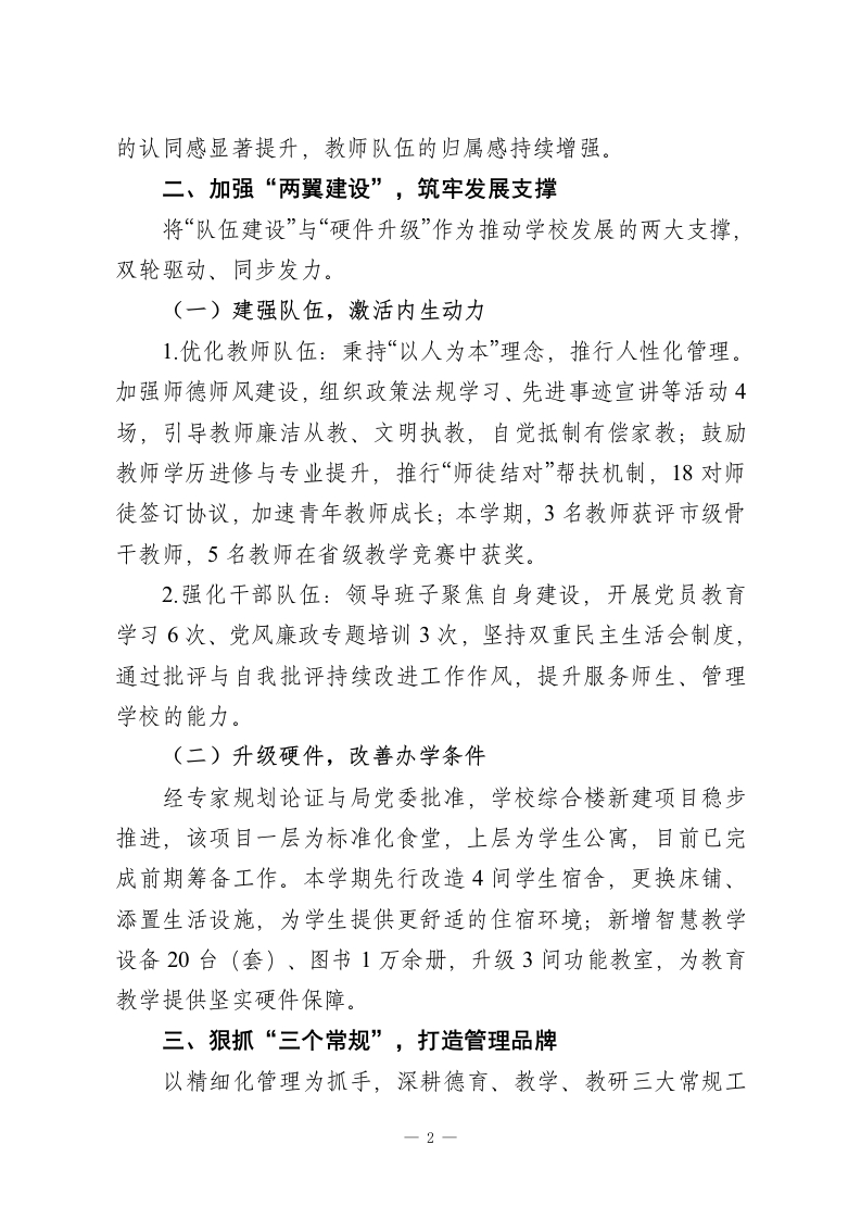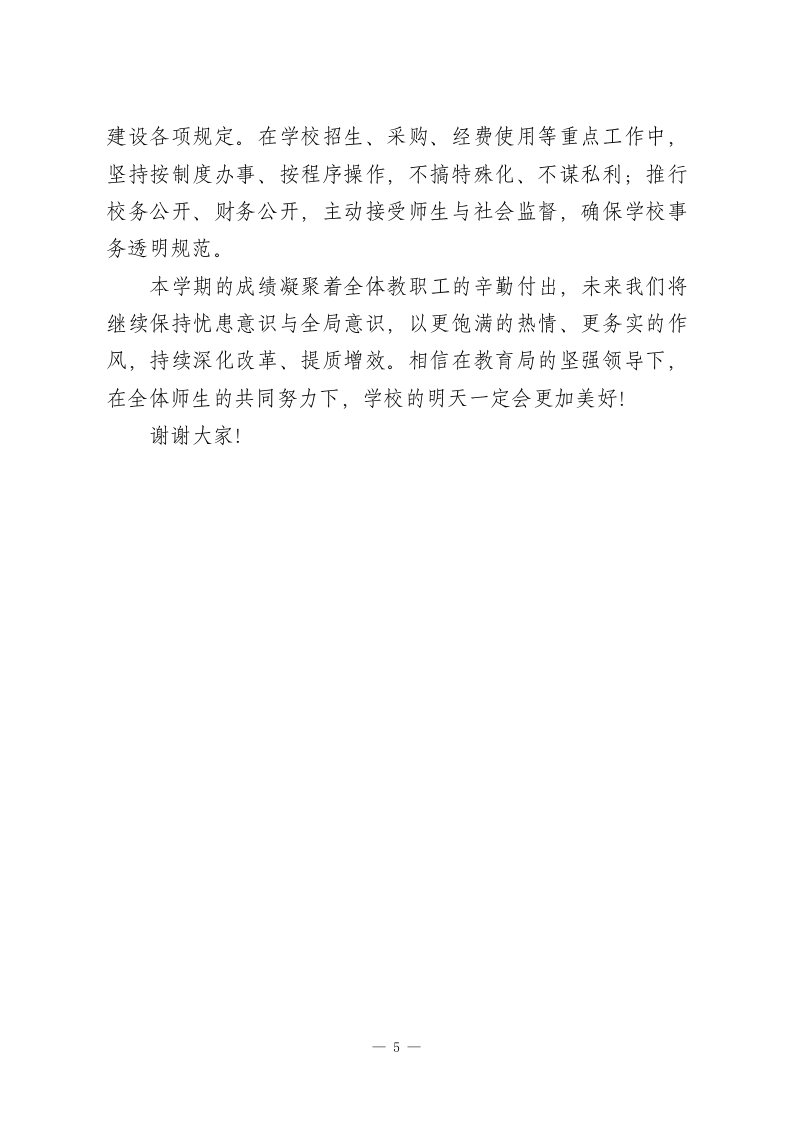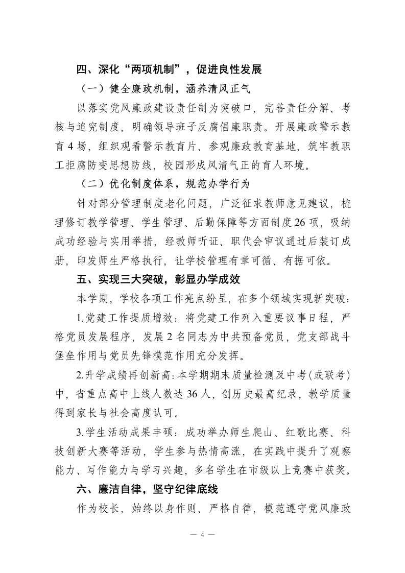 秋季学期校长述职述廉报告:抓核心、强基础、严常规,实现三大突破尊敬的各位领导:大家好!本学期已圆满收官。本学期,在教育局的正确领导下,学校全面贯彻党的教育方针,紧扣“高质量发展”主线,以“突出一个核心、加强两翼建设、狠抓三个常规、深化两项机制”为工作思路,凝心聚力、务实笃行,圆满完成各项工作任务,实现了办学质量的稳步提升。现将本学期履职情况、廉洁自律表现及工作成效汇报如下,请予评议。一、突出“一个核心”,坚守办学初心始终把“创办人民满意的教育”作为核心目标,贯穿学校工作全过程,端正办学思想、规范办学行为。(一)聚焦多方需求,提升满意度从家长、学生、教师三个层面精准发力:对家长,严格落实义务教育收费政策,杜绝乱收费,全力提升教学质量,让家长放心;对学生,扎实推进素质教育,平等对待每一位学生,杜绝体罚与变相体罚,为学生提供生动活泼、全面发展的成长环境;对教师,持续改善办公条件与福利待遇,搭建和谐宽松的专业发展平台,让教师在职业成长中收获成就感与幸福感。(二)务实推进工作,赢得广泛认可全体教职工凝心聚力、勤奋进取,用实际行动践行教育初心。本学期,学校规范办学、提质增效的举措得到社会各界广泛尊重,家长满意度调查好评率达95%以上,学生对校园生活1