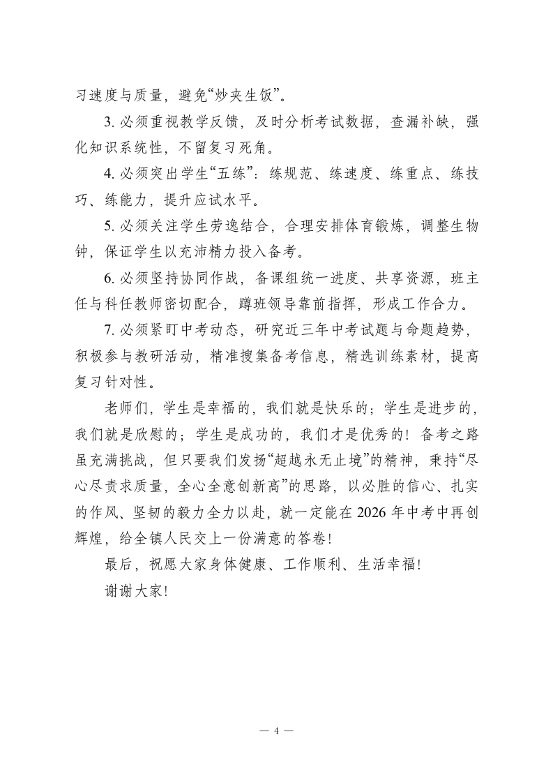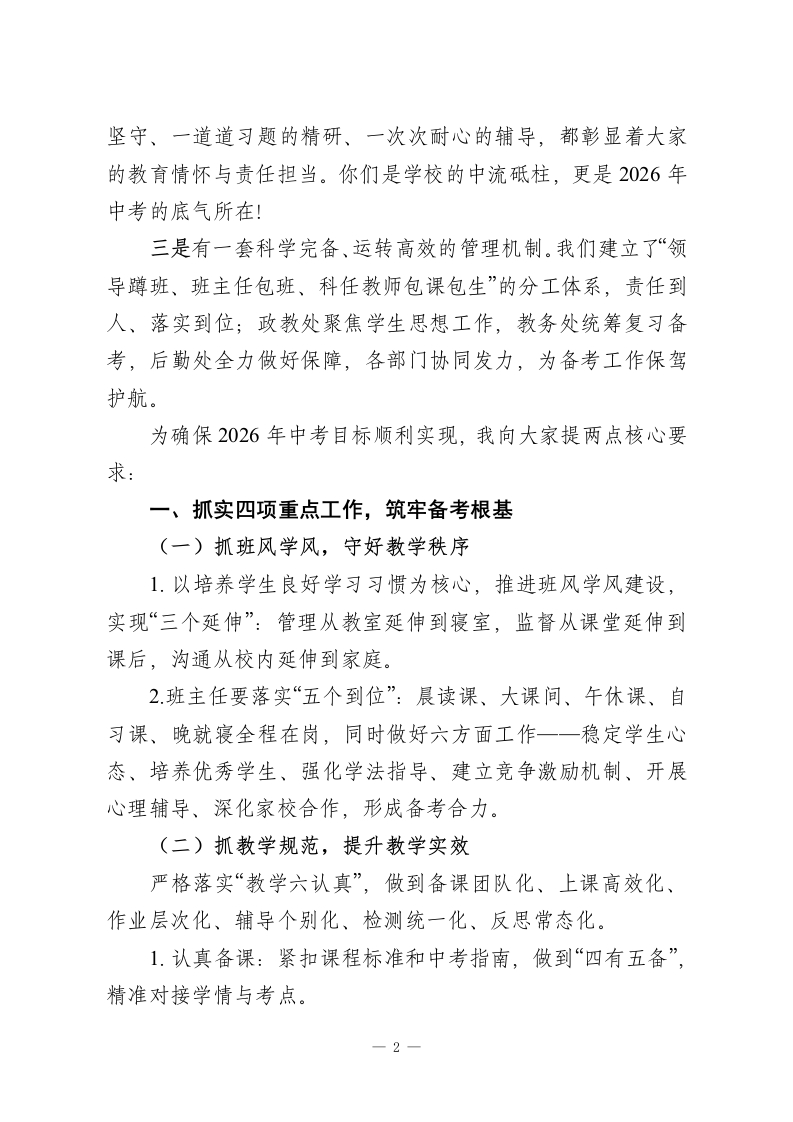 秋季学期中考备考教师会议校长讲话:学生成功才是我们优秀,99天加油干尊敬的各位领导、亲爱的老师们:大家下午好!首先,我要向XX中学的领导和九年级全体教师致以诚挚的感谢!2025年中考,我镇取得了骄人的成绩,各科成绩在全市名列前茅;去年年底的期未考试中,我们更是斩获全市第五的好名次。这份成绩的背后,是大家的辛勤付出与无私奉献,值得我们所有人骄傲!时光飞逝,2026年中考复习备考已进入关键阶段,距离考试仅剩99天。新的任务、新的目标已摆在我们面前,为了让每一位学生都能考出理想成绩,为了实现我镇中考“稳居全市第一”的目标,今天我们齐聚一堂,召开这场中考备考动员会,凝聚共识、明确方向、部署任务。回顾过往,我们之所以能屡创佳绩,核心在于三大优势:一是有一支经验丰富、务实高效的领导队伍。李XX校长、李XX主任等领导,都是毕业班教学出身,深谙复习备考的关键环节,管理既有力度又有温度。在他们的带领下,九年级师生精神面貌昂扬向上,学生学习态度、状态和成绩均稳步提升,为备考工作奠定了坚实基础。二是有一支师德高尚、敬业奉献的教师团队。我们的老师始终以校为荣,与学生心连心,对待工作有闯劲、有干劲、有拼劲,对待学生有爱心、有耐心、有细心。无数个清晨深夜的一1