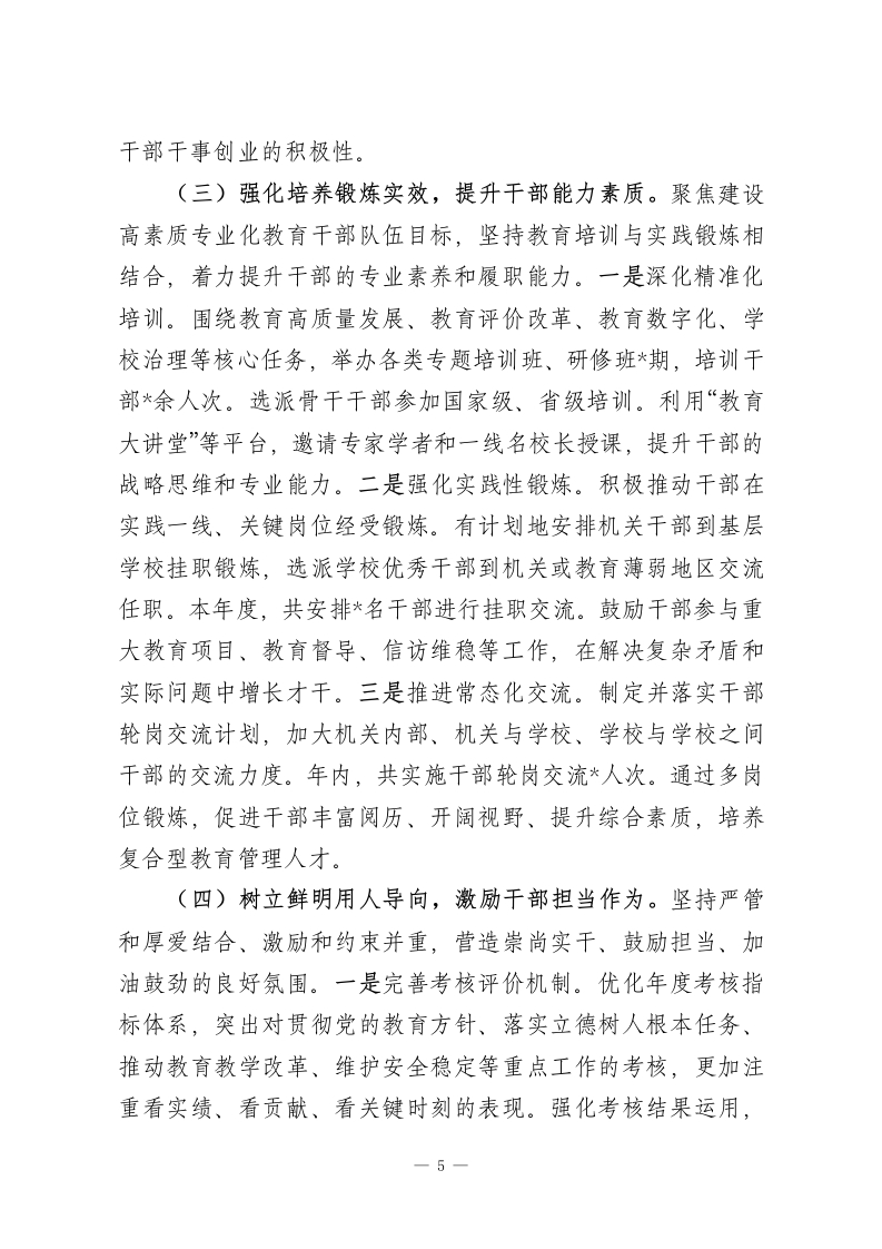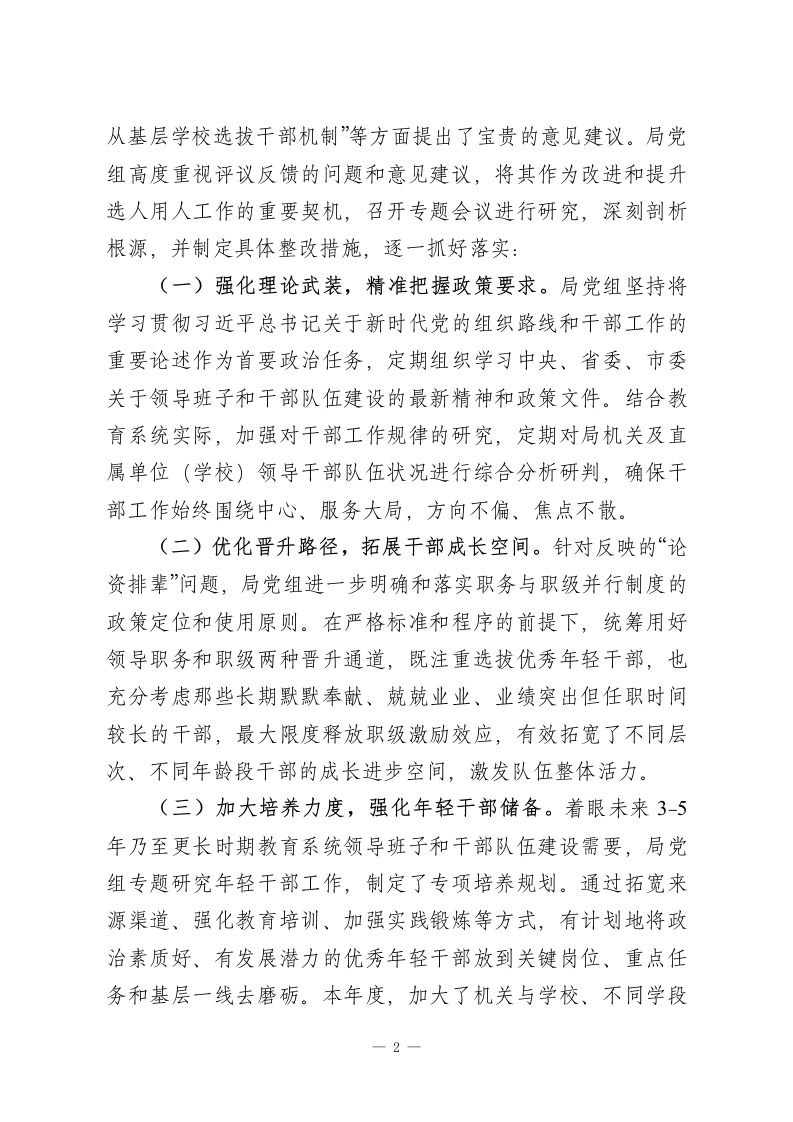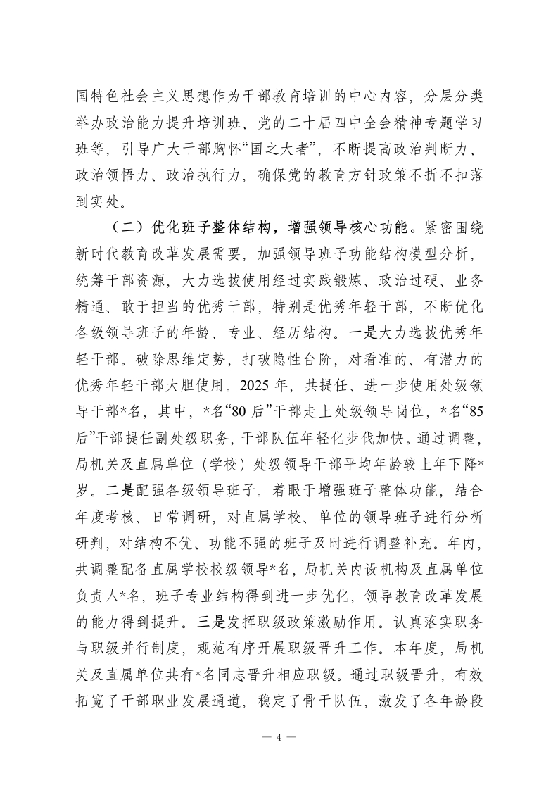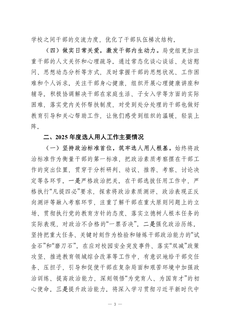 市教育局党组2025年度选人用人工作报告2025年,在市委的坚强领导下,市教育局党组坚持以习近平新时代中国特色社会主义思想为指导,深入学习贯彻党的二十大和二十届三中、四中全会精神,全面落实新时代党的组织路线,紧紧围绕全市教育事业发展大局,严格遵循新时代好干部标准,认真贯彻落实中央、省委、市委关于干部队伍和领导班子建设的各项决策部署,不断优化干部队伍结构,激发干部队伍活力,努力建设一支政治过硬、适应新时代要求、具备领导教育现代化能力的高素质专业化干部队伍,为加快推进我市教育事业高质量发展、办好人民满意的教育提供了坚强的组织保证和人才支撑。一、关于2024年度“一报告两评议”反映问题的整改落实情况2025年初,我局严格按照要求开展了2024年度干部选拔任用工作“一报告两评议”。根据市委组织部反馈的评议结果,在“选人用人工作总体评价”“从严管理监督干部”等方面,评价为“好”的比率均高于全市平均值,体现了局系统干部对选人用人工作的总体认可。同时,评议也客观指出了存在的问题,其中“激励担当作为用人导向不鲜明,论资排辈情况依然存在”一项,反映比率略高于系统平均值。此外,存在个别新提拔干部民主评议结果为“不认同”的情况。参加评议的同志还就“加强年轻干部轮岗交流和实践锻炼“强化事业为上、人岗相适的选人原则“完善—1