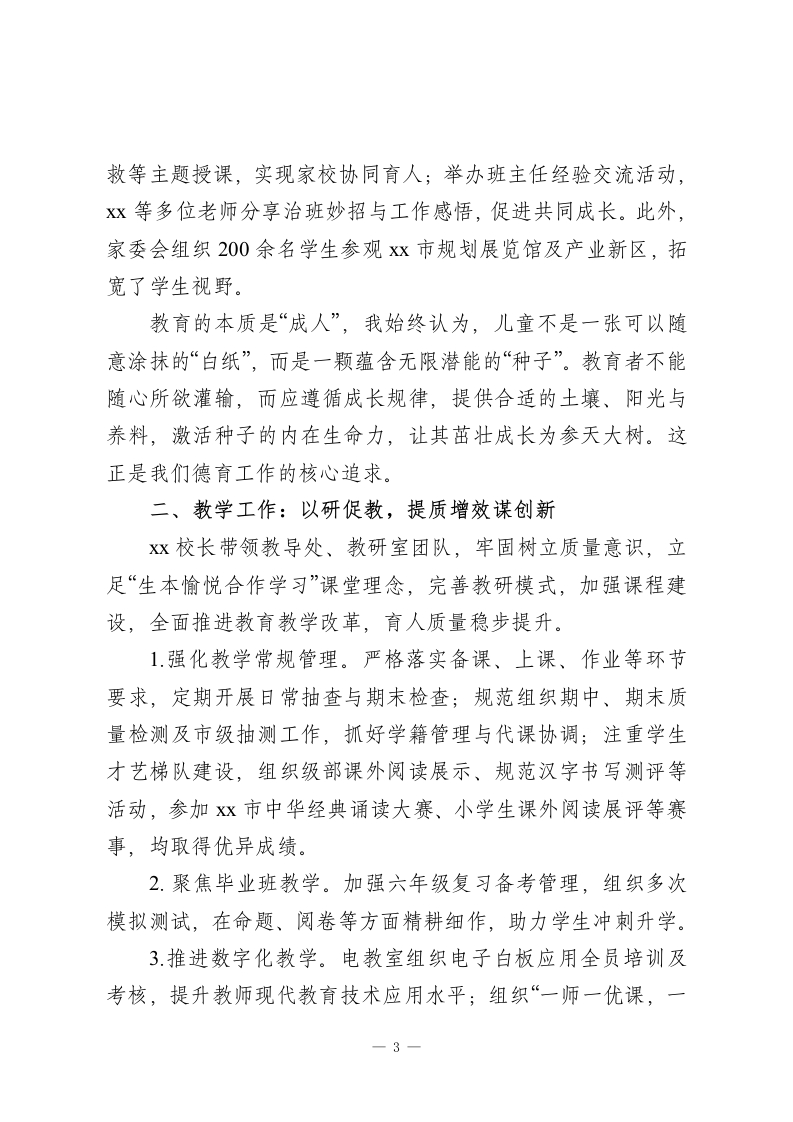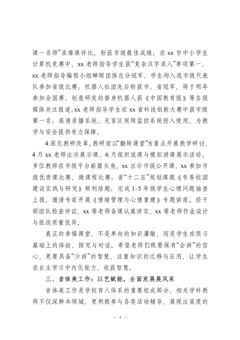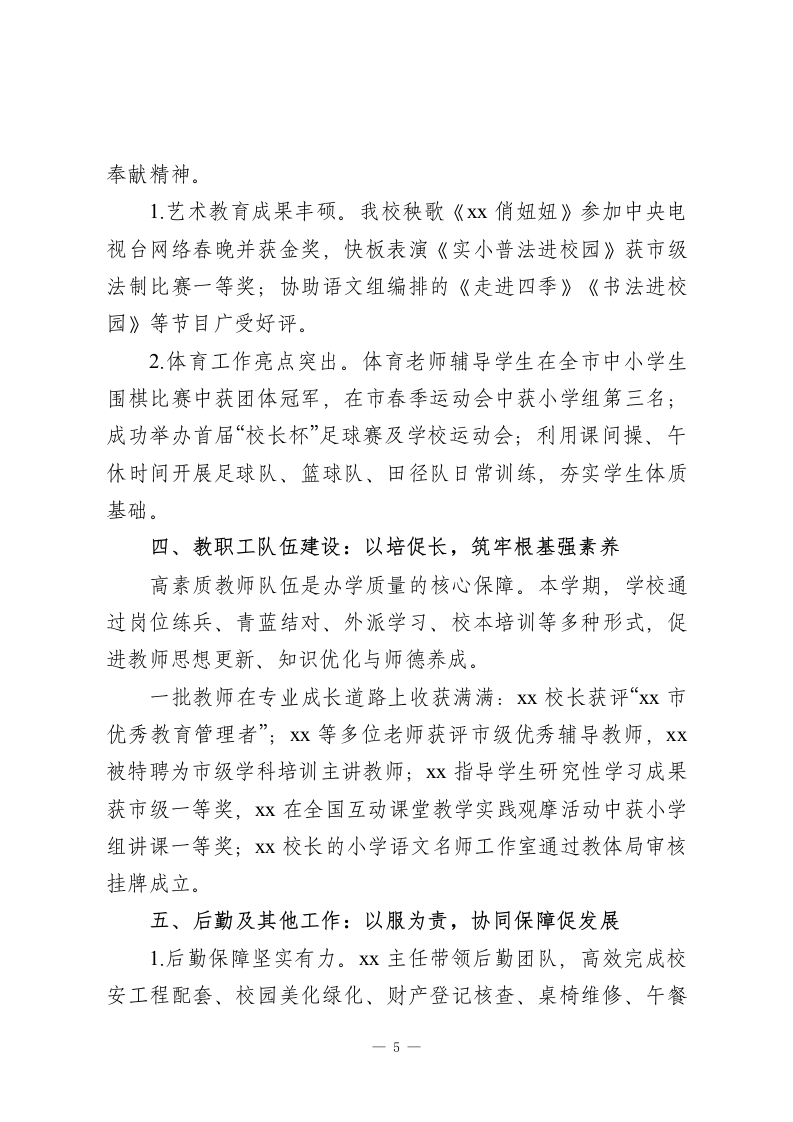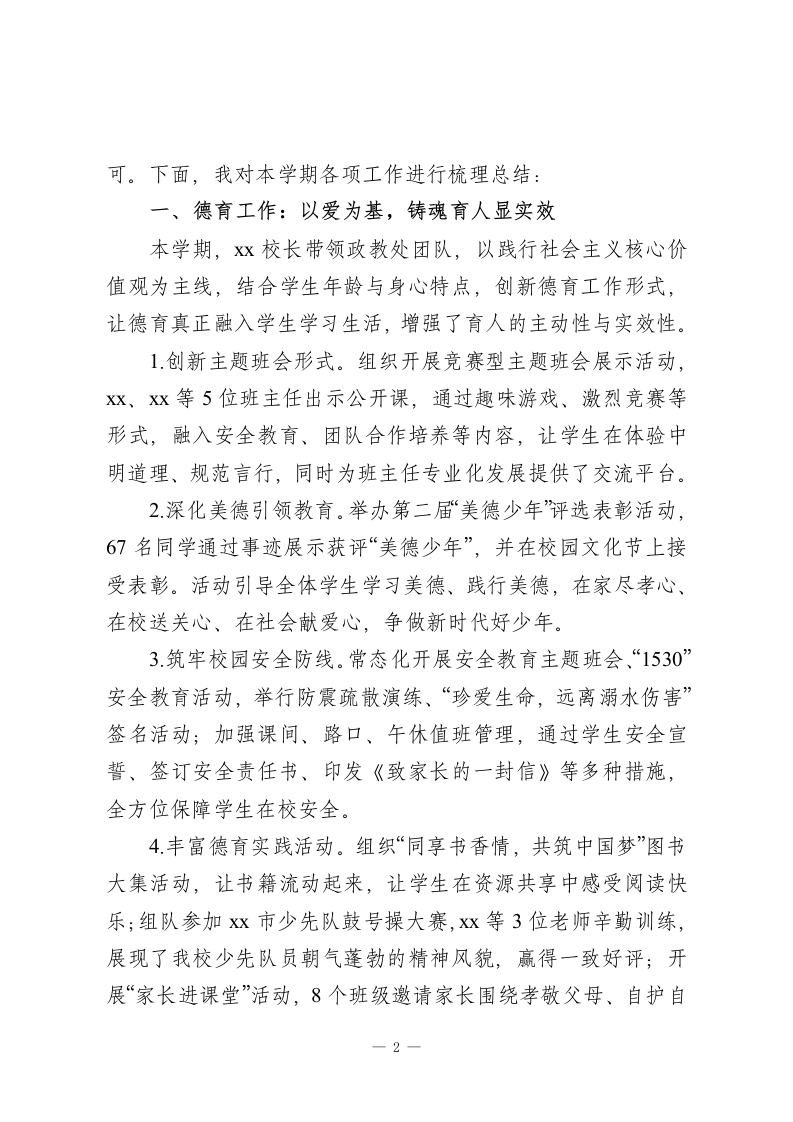 小学2025-2026学年秋季学期期末全校教师大会校长讲话:凝心聚力结硕果,砥砺奋进再扬帆各位老师:大家下午好!时光荏苒,本学期已圆满落幕,愉快的寒假即将开启。回首这一学期,尽管时光紧凑,但全体教职工凝心聚力、真抓实干,各项工作扎实推进,亮点纷呈、硕果累累。今天召开本次大会,一是与大家共同盘点本学期的收获与成长,复盘不足与改进方向;二是部署假期相关工作,确保大家度过一个安全、充实、愉快的假期。刚才,学校对本学期表现突出的优秀团队和个人进行了表彰,在此,我代表学校向大家表示最衷心的祝贺!希望大家珍惜荣誉、再接再厉,在未来的工作中再创佳绩。本学期,我校始终秉承“办人民满意的学校”宗旨,以提升办学质量为核心,以促进学生全面发展为目标,以强化教师队伍建设为支撑,在规范办学、德育创新、教学改革、特色发展等方面精准发力,取得了一系列亮眼成绩:学校先后荣获“xx市中小学机器人比赛优秀组织奖“xx市数字智慧校园建设先进单位”“Xx市教育体育工作先进单位”“全国中小学陶艺作品展示优秀组织奖”等多项荣誉;成功承办“xx市小学英语新课标教材网络培训会“Xx市‘一对一’数字化应用现场会“xx市小学生课外阅读展示活动”等多项市级活动,得到上级领导与同行的高度认1