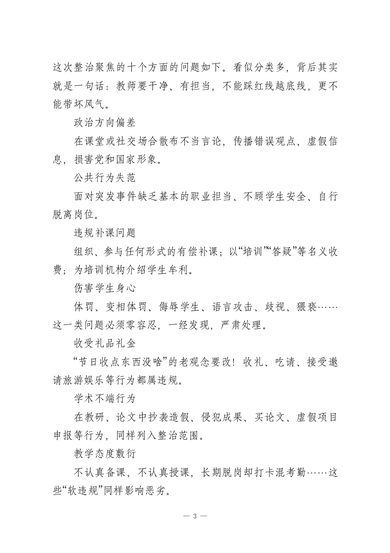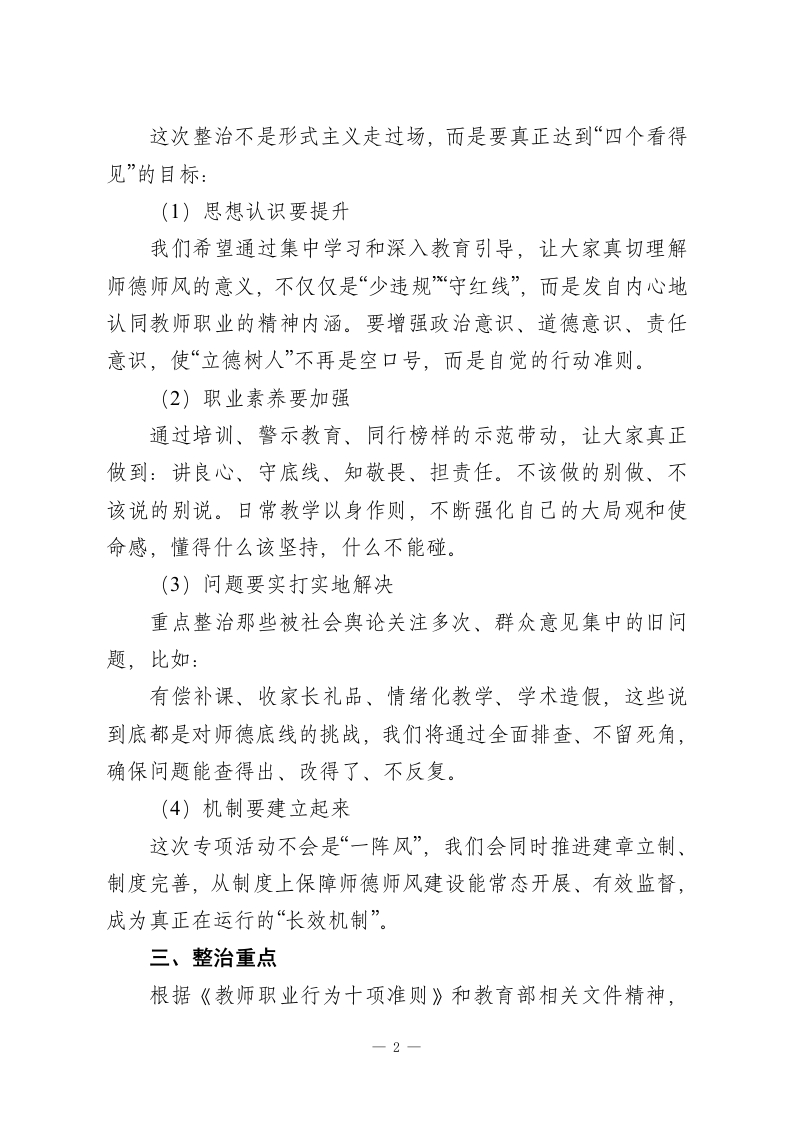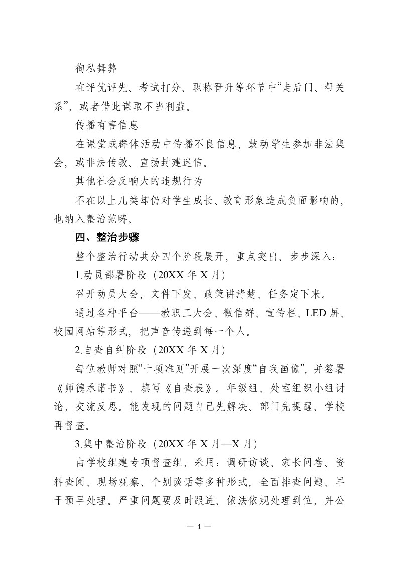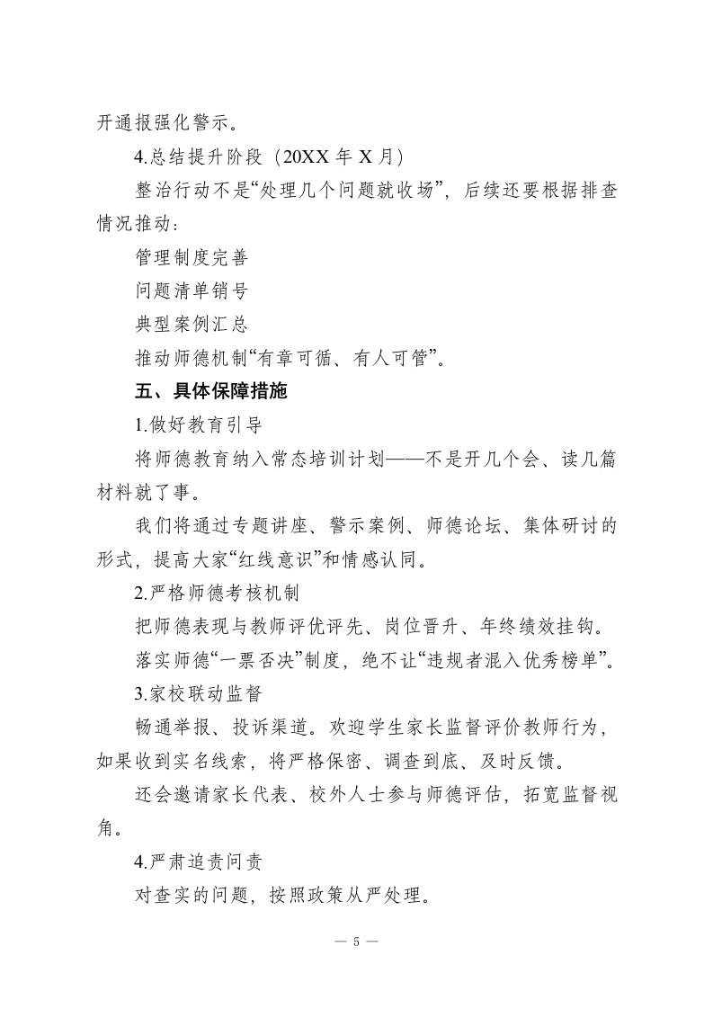 小学学校关于开展师德师风突出问题专项整治行动的实施方案(2026年修订)为进一步落实党中央对教育工作和教师队伍建设的一系列新要求,认真贯彻习近平总书记有关教师队伍建设的重要论述精神,同时也为回应群众关切、强化教师职业形象,我校决定开展一次全员参与的师德师风突出问题专项整治行动。我们希望通过这项整治,让师德真正立起来、严起来,让“教书育人”不仅挂在嘴上,更扎根在行动中。一、指导思想本次专项整治的出发点很明确:教育是托举未来的事业,而教师,是这个系统中最关键的人。我们将坚持把师德师风作为评价教师最核心的标准,以“四有”好老师为目标(有理想信念、有道德情操、有扎实学识、有仁爱之心),围绕当前师德建设中存在的各种现实问题,拿出解决办法和实际行动。在推进过程中,我们坚持几个原则不动摇:问题导向,发现什么改什么:目标导向,想达到具体什么效果;结果导向,注重整治实效。同时,讲明政策、立清底线,加强教师的自律意识,还要靠制度和监督机制跟得上。最终目的是,努力建设一支业务过硬、人格可靠、孩子喜欢、家长放心、社会认可的高质量教师队伍,为办好人民满意的教育提供根本保障。二、行动目标一1