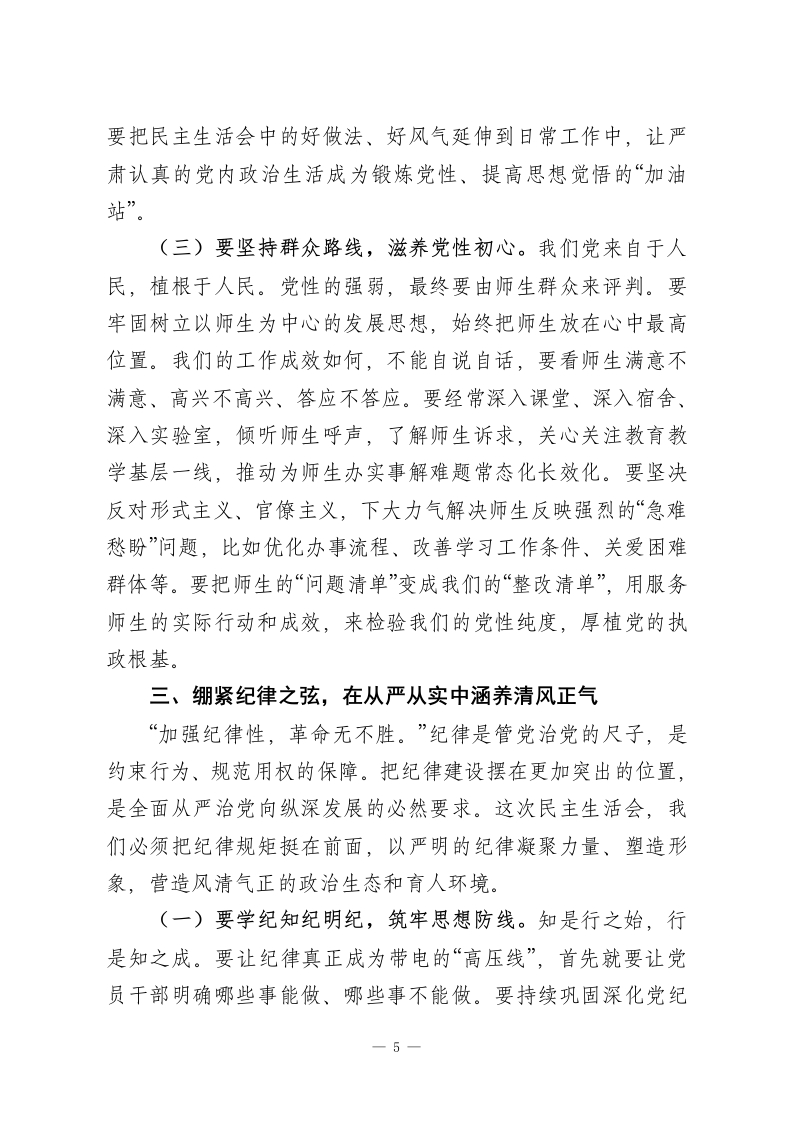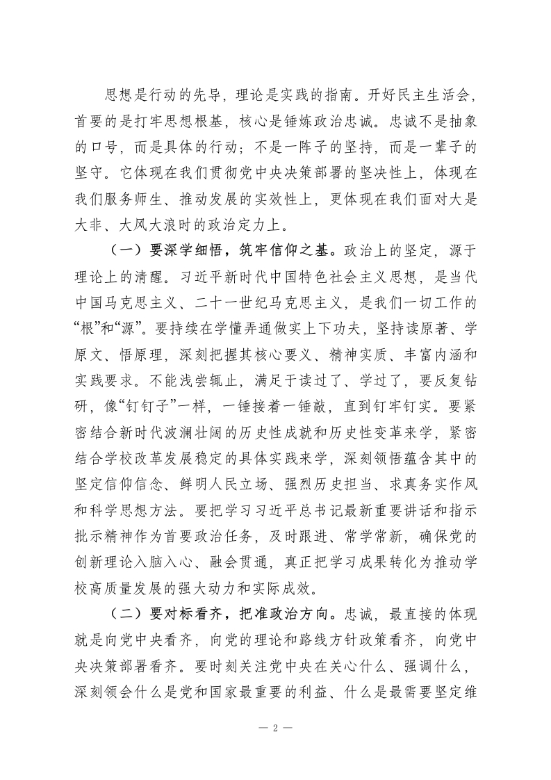 校党委书记在主持2025年度党委领导班子民主生活会会前集体学习暨党委理论学习中心组2026年第一次集中学习上的讲话同志们:今天,我们利用一天时间,举行2025年度党委领导班子民主生活会会前集体学习暨党委理论学习中心组2026年第一次集中学习。这次学习,主题鲜明、内容重要、意义特殊。主要目的是深入学习领会习近平总书记在中共中央政治局民主生活会上的重要讲话精神,全面贯彻落实党的二十届四中全会精神,进一步统一思想、深化认识,为接下来高质量开好校党委领导班子民主生活会打牢坚实的思想基础。刚才,我们传达学习了习近平总书记充满力量、温暖人心的二○二六年新年贺词,班子成员紧扣会议主题,围绕“政治忠诚”、“党性修养”、“自我革命”、“作风建设常态化长效化”等核心内容,结合分管领域和工作实际,逐一作了深入、坦诚的交流发言。大家谈认识、摆问题、剖根源、明方向,体现了对党忠诚的政治态度和求真务实的工作作风,达到了预期效果。这既是一次扎实的理论学习,也是一次深刻的党性锻炼,更是一次触及灵魂的思想预热。下面,结合大家的学习交流和我个人的思考,我讲四个方面的意见,与同志们共同探讨、共促共进。一、铸牢忠诚之魂,在固本培元中把稳思想之舵