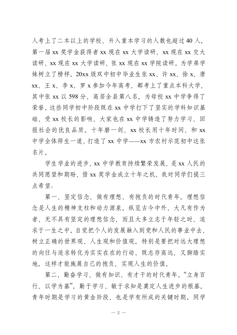 校长在奖学金颁奖仪式上发表讲话,借奖学金成立10年之机,对同学们提了三点希望尊敬的各位家长,老师们,同学们:上午好!今天,我们在这里隆重集会,举行xx中学第十届xx奖学金颁奖仪式。首先,请允许我代表xx中学支部、行政和全体教职员工向在今年中考取得优异成绩并获得xx奖学金的25名同学表示最热烈的祝贺!向辛勤耕耘、无私奉献的学校全体老师表示最衷心的感谢!向重视教育,鼎力支持、配合学校教育的学生家长致以诚挚的问候!今年中三毕业考试,xx中学再创佳绩。总分476.35,居全区第一名,升入Xx中学Xx班5人,职高分流后90人参加中考,升入高中有88人,升学率高达97.8%,xx片区600分以上12人,双中占4人。综合教育质量各项指标进行评比,不出意外,Xx中学位列Xx片区第一。这些成绩是Xx中学全体师生的智慧和汗水的结晶。Xx实验中学Xx校长,从事教育事业,热爱教育事业,将xx实验中学办得红红火火,蒸蒸日上。同时也将关注的目光投向西部的孩子。从20xx年至今,Xx校长设立奖学金已满10个年头,因明年奖学金已到学校账户,至今共出资22万元,已获奖人数达250人,其中已有七届175人已参加高考,绝大多数