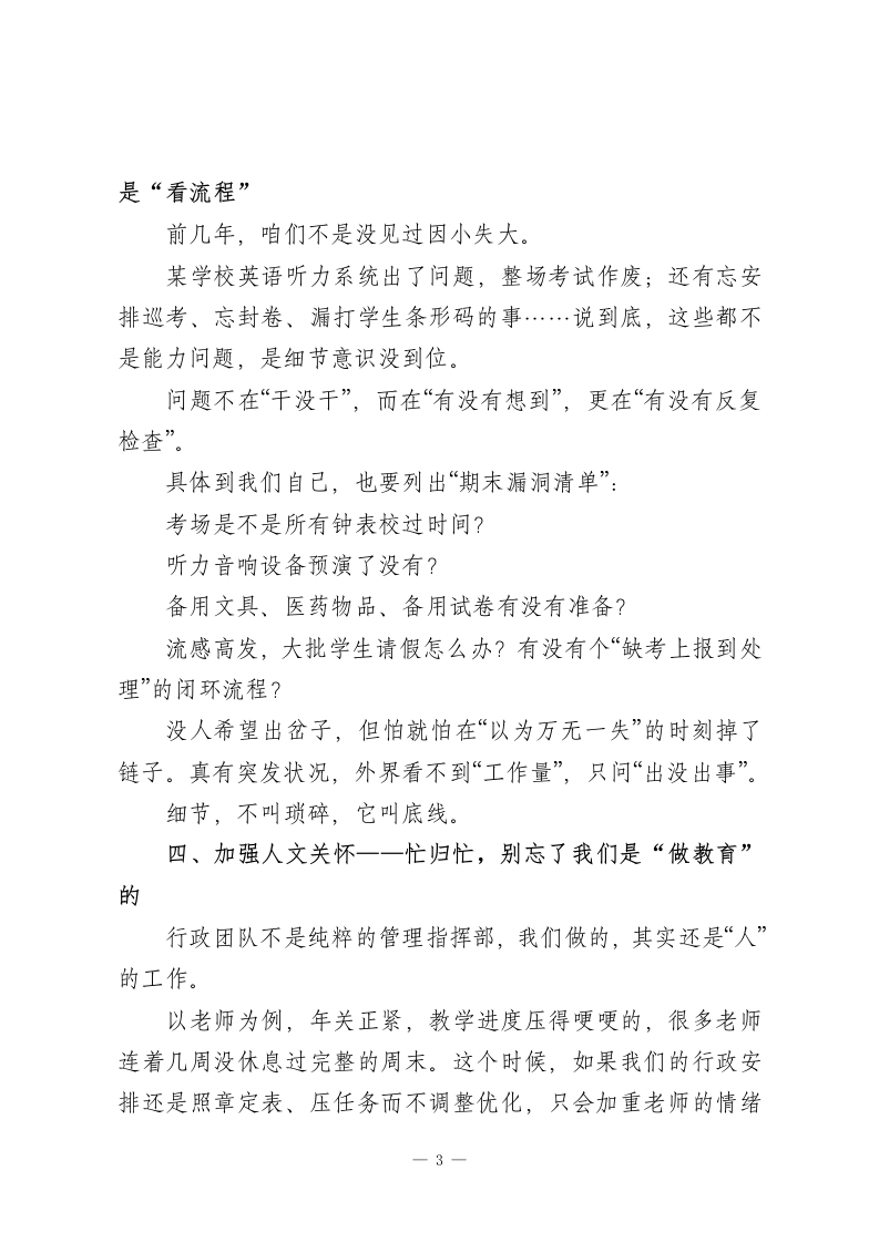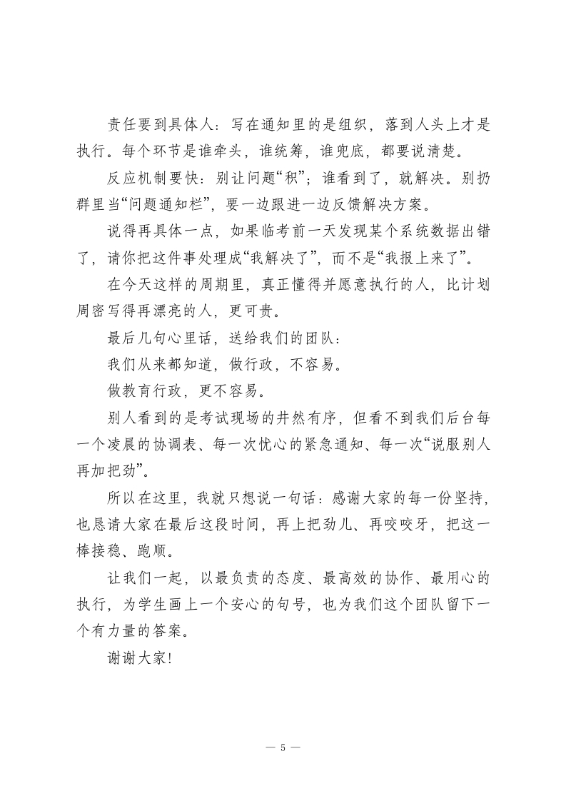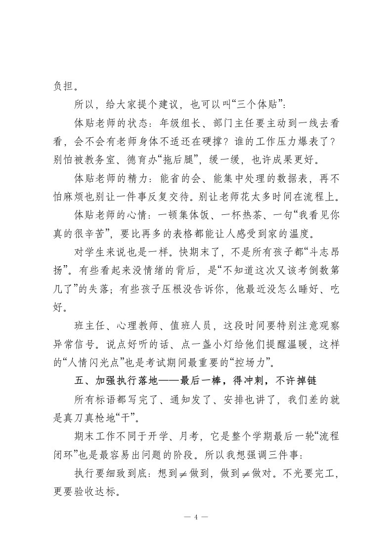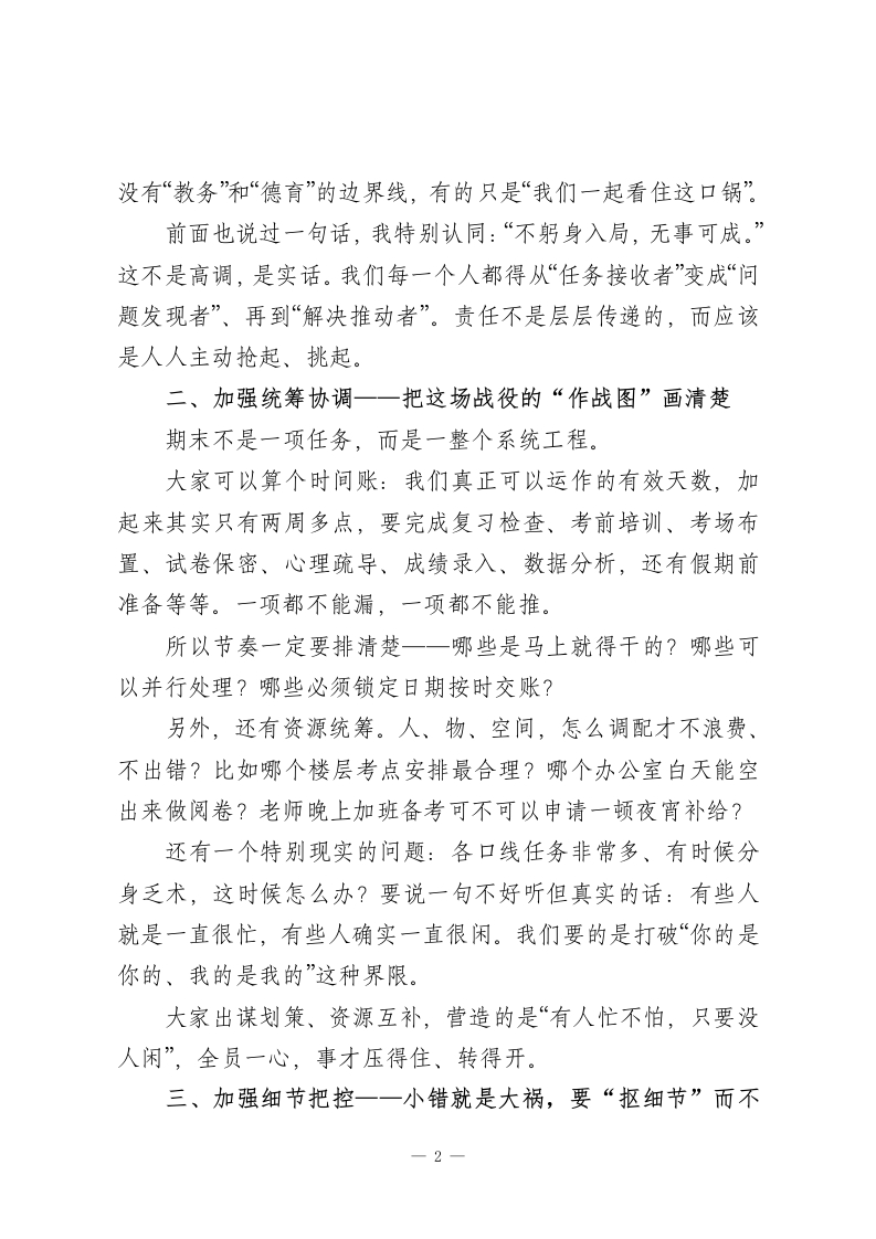 校长在期末备考行政班子会议讲话:打好期末收官之战,每个干部都责无旁贷刚刚跨过元旦的门槛,节日的热闹还没完全散去,我们已经回到忙碌的节奏中来了。欢迎大家调整状态,干劲归位。今天的会议很简单也很直接,就一个中心议题:准备迎战期末。一年之计在于春,一学期能不能高质量收官,就看这最后一段时间能不能稳、能不能紧、能不能干到位。现在,考试的倒计时已经开始,复习、考务、心理疏导、后勤保障…每一项都密密交织,而且牵一发而动全身。我们作为行政骨干,是指挥者、组织者,更是守门人。不多绕圈子,今天我想围绕“五个加强”,跟大家具体谈谈接下来的重点工作:一、加强责任意识一一期末不是“谁的活”,而是“我们的活”这段时间,任务多、情况杂、节奏快,是对我们责任感的一把放大镜。什么叫“有责任心”?不是你有没有做安排,而是你有没有在出现问题的第一时间反应过来,能不能把“我负责”的范围主动扩展一步。比如试卷忘打标签了、考场时间写错了,是不是能第一时间补救?别等着“让教务来协调”“让德育去通知”一学校的事,1