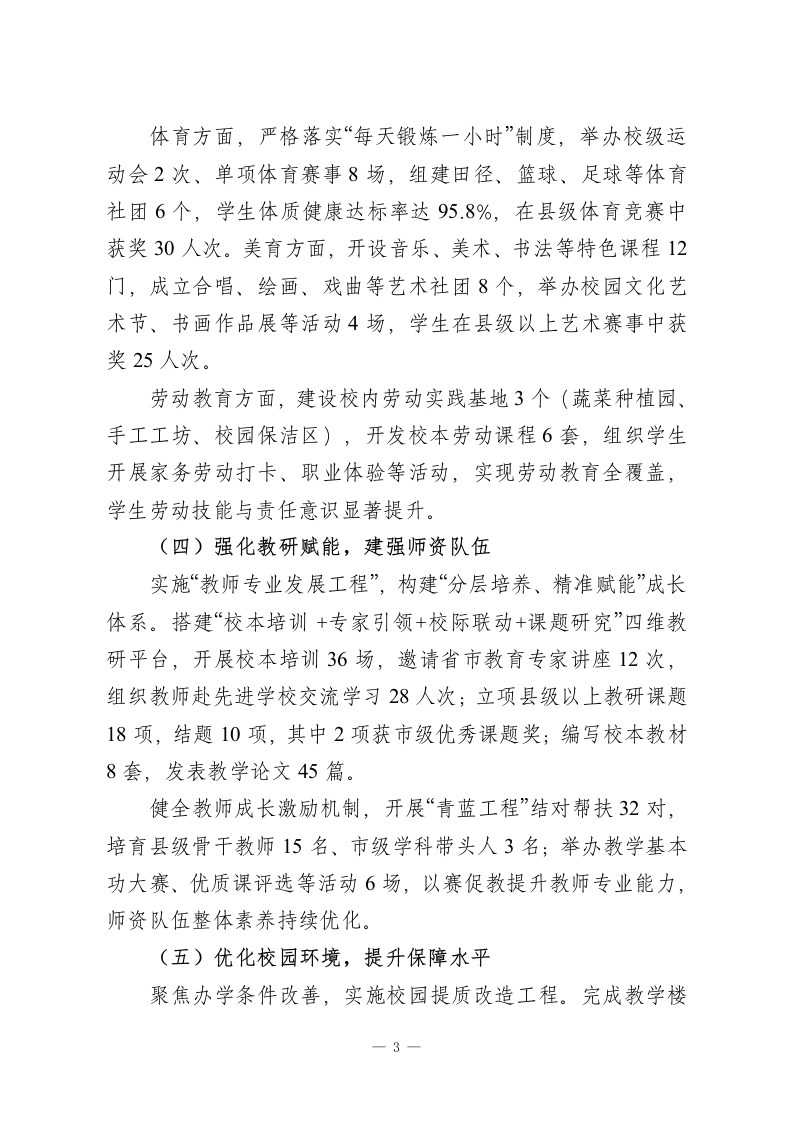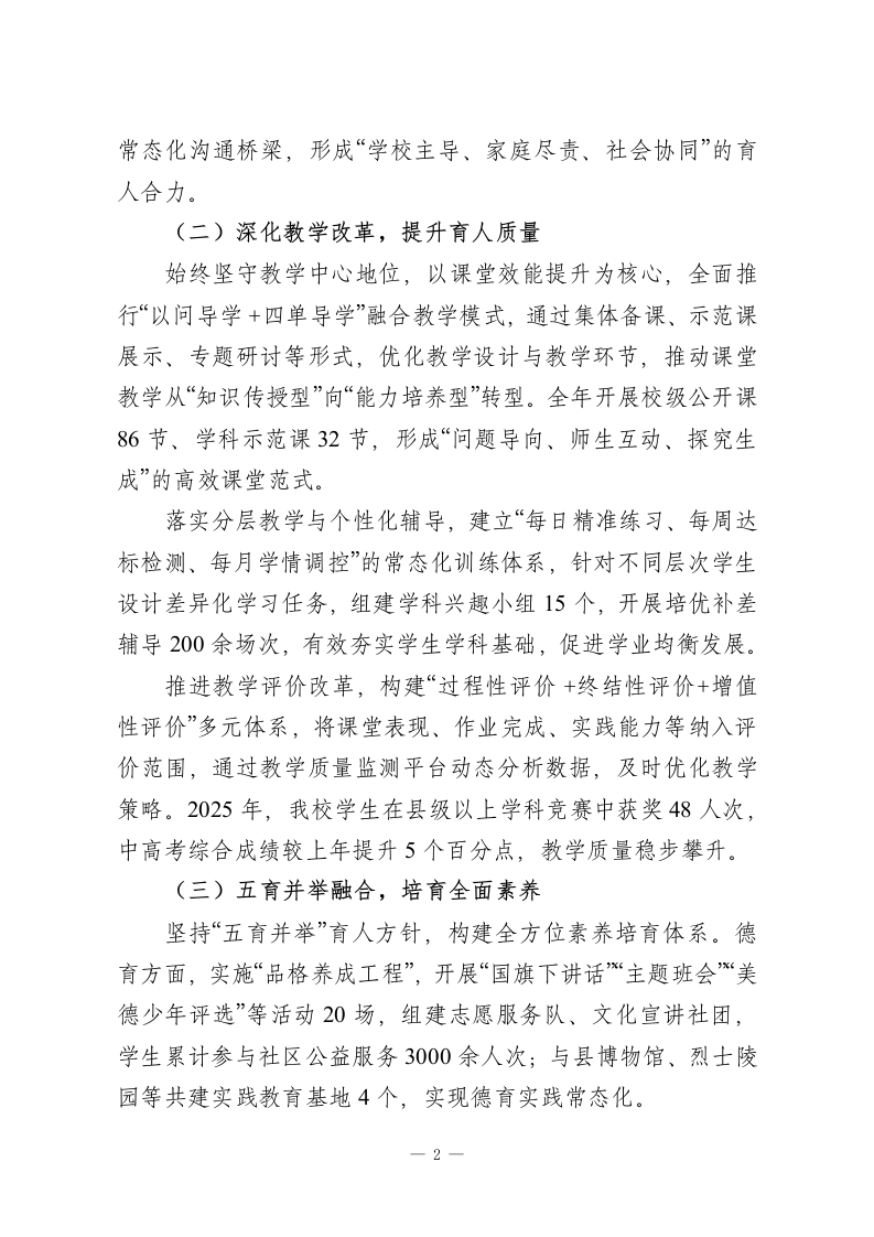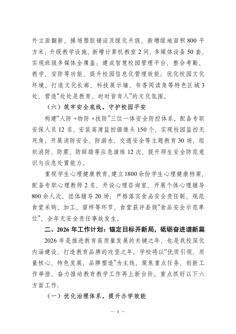 学校2025年工作回顾与2026年工作计划2025年,我校在上级教育行政部门的科学指导下,牢牢把握“立德树人”根本任务,以优质治理赋能发展、以教学质量为核心牵引、以改革创新破解难题、以安全稳定筑牢底线,统筹推进育人质量提升、师资队伍建设、校园环境优化等重点工作,在内涵发展与特色培育的道路上稳步前行,圆满完成年度既定目标,为办好人民满意的教育交出了扎实答卷。一、2025年工作回顾:守正创新谋发展,深耕细作结硕果(一)强化核心引领,完善治理体系2025年,学校坚持以规范管理为抓手,不断完善现代学校治理架构。修订学校章程与议事规则,健全重大事项集体决策机制,充分发挥教职工代表大会、家长委员会的民主参与和监督作用,构建起“统筹引领、行政执行、民主协同、社会参与”的多元治理体系,保障学校各项工作科学有序推进。聚焦思想引领与师德建设,搭建“专题学习+实践研讨+线上赋能”三维提升平台,组织教师开展职业素养提升活动12场,赴先进教育单位开展交流研学3次,推动理论学习与教育实践深度融合。实施“师德师风提升工程”,开展专题培训4场,组织全体教师签订职业行为承诺书,建立健全师德考核评价机制,将考核结果与评优评先、职称晋升、绩效分配直接挂钩,全年未发生违规失范行为。深化家校协同育人,组织全体教师开展“家校连心”走访行动,覆盖学生家庭1800余户,建立个性化家校共育档案,搭建1