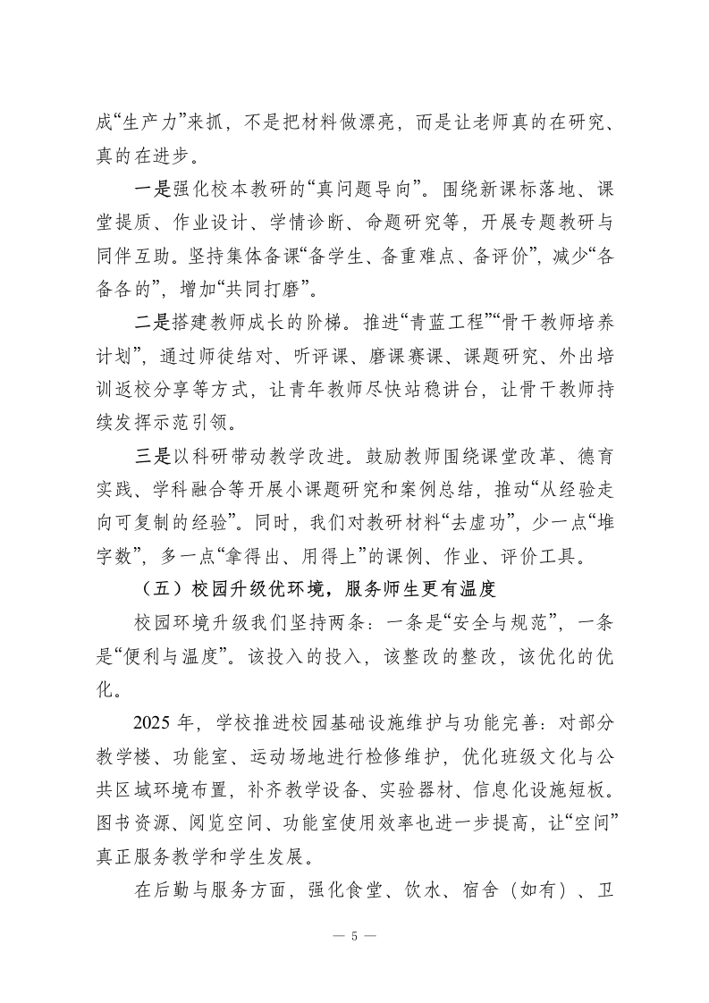 学校2025年工作回顾与2026年工作计划2025年,在上级教育行政部门的正确领导下,我们学校始终把“立德树人”这件大事抓在手上、放在心上、落到行动上。我们坚持用党建赋能治理,用质量统领发展,用改革破解难题,用安全筑牢底线,系统推进党建引领、教学提质、德育铸魂、教研赋能、校园升级等重点工作。说到底,就是一句话:把学校办得更像学校,把教育做得更像教育,把孩子培养得更像“未来的人”。这一年,学校各项目标任务总体圆满完成,内涵发展和特色建设稳步向前,向“人民满意的教育”交出了一份比较扎实的答卷。一、2025年工作回顾:守正创新谋发展,深耕细作结硕果(一)党建领航强根基,筑牢育人政治保障2025年,我们坚持把党建贯穿办学治校全过程,不是“墙上挂一挂、会议开一开”,而是真正把高质量党建转化为高质量育人、转化为学校治理能力。一方面,治理体系继续做“实”。学校健全完善“党组织领导下的校长负责制”,修订学校章程与议事规则,进一步规范“三政一大”决策程序,重要事项集体研究、依规决策。教代会、家委会也不再只是“走流程”,而是更有参与度、更有监督力。整体上,我们逐步形成了“党建引领、行政主导、民主协同、社会参与”的现代学校治理格局,学校该怎么管、谁来管、怎么更透明更有效,越来越清晰。另一方面,思想政治建设抓“深”和“活”。我们搭建了“理论1