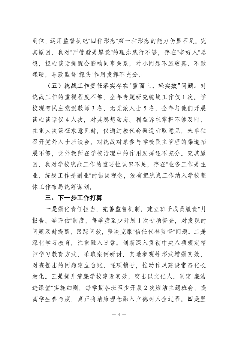 学校党委书记2025年落实全面从严治党主体责任述职报告2025年,我认真履行全面从严治党第一责任人职责,坚持以习近平新时代中国特色社会主义思想为指导,深入学习贯彻党的二十大和二十届二中、三中、四中全会精神,贯彻落实习近平总书记视察山东重要讲话和视察枣庄重要指示精神,落实区委十一届七次、八次、九次全会部署和区纪委五次全会精神,扎实开展深入贯彻中央八项规定精神学习教育,推动清廉学校建设。现将履责情况报告如下:一、主要做法及成效一是抓政治建设强引领。坚持把政治建设摆在首位,组织班子成员和全体党员学习党的二十届四中全会精神及习近平总书记视察山东重要讲话精神12次,开展"第一议题"学习18次。严格执行民主集中制,全年召开党支部委员会16次,"三重一大"事项全部集体研究决定。扎实开展深入贯彻中央八项规定精神学习教育,一体推进学查改,全体党员签订廉洁承诺书,组织观看警示教育片3部。二是抓责任落实促担当。对重要工作亲自部署、重大问题亲自过问,全年听取班子成员分管领域工作汇报8次,与班子成员开展谈心谈话26人次。制定党风廉政建设责任清单,逐项分解任务到人,每季度听取落实情况汇报。积极配合上级巡视巡察,对反馈的3个问题已全部整改到位。三是抓队伍建设固根本。严格落实新时代好干部标准,发展党员2名,培养入党积极分子4名。加强师德师风建设,开展师1
