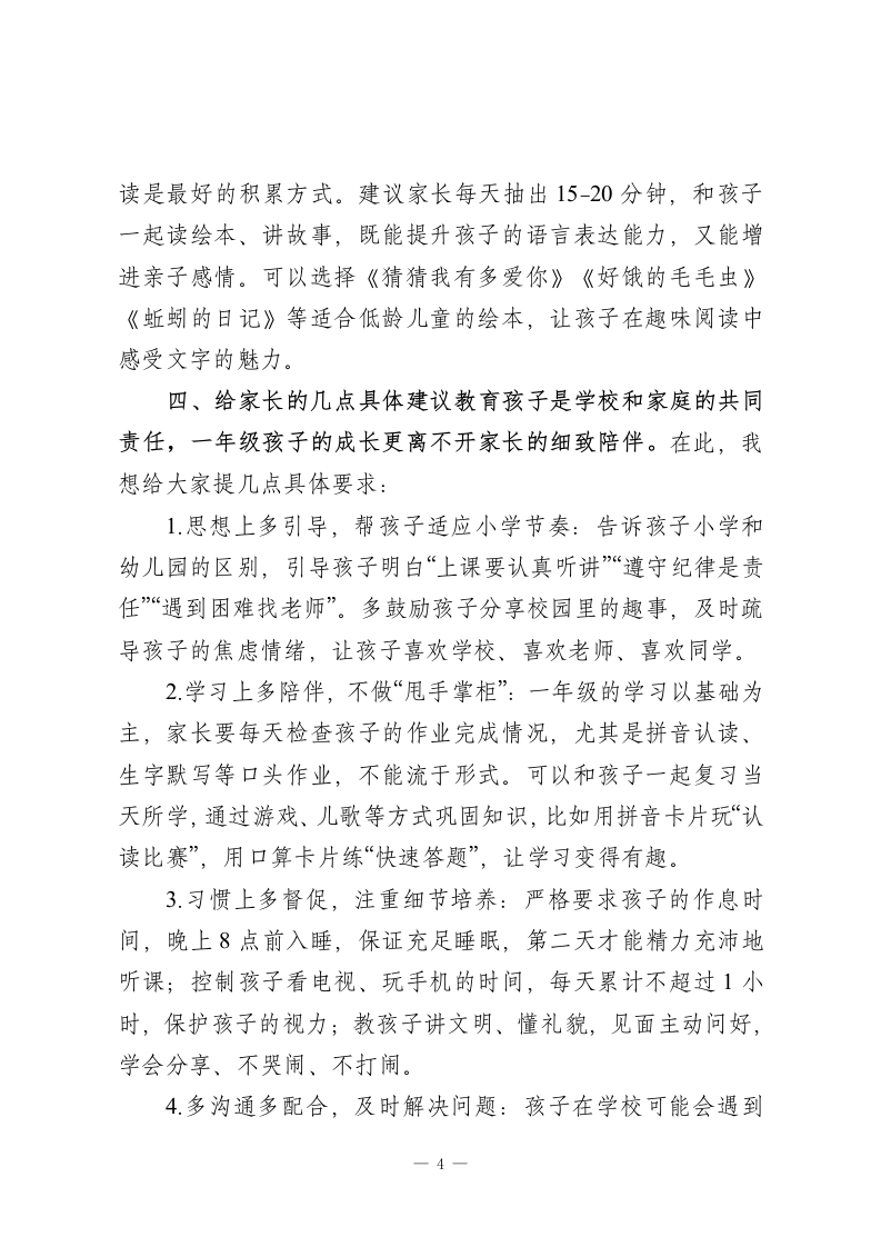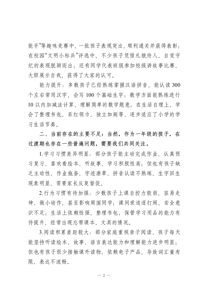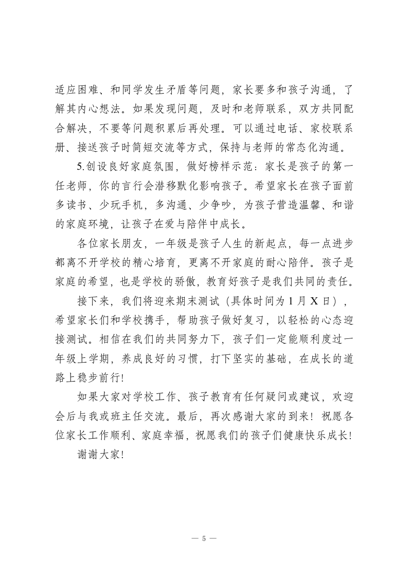 一年级上学期期末家长会校长讲话:家校携手,助力萌娃顺利启航各位家长朋友:晚上好!首先,我代表学校,向在百忙之中抽出宝贵时间参加今天家长会的各位,表示最热烈的欢迎和最衷心的感谢!感谢大家一直以来对学校、班级和老师们工作的理解、支持与配合。今天我们欢聚一堂,核心目的只有一个一一为了孩子的适应与成长、为了孩子的进步与未来,携手做好孩子入学后的第一份“护航答卷”。一年级是孩子从幼儿园到小学的关键过渡期,也是习惯养成、基础夯实的黄金期。回顾这一学期,孩子们的变化和进步让人欣喜:从刚入学时的懵懂好奇、哭闹想家,到现在能主动向老师同学问好、遵守课堂基本秩序;从上课注意力不集中、坐不住,到现在能静心听老师讲课15-20分钟,甚至主动举手发言;从不会整理书包、忘带学习用品,到现在能自己收拾文具、按时收发作业本,集体荣誉感也在慢慢增强。一、学期亮点与成长收获这一学期,孩子们在校园里收获了知识与快乐,也取得了不少亮眼成绩:班级荣誉:多个班级凭借良好的纪律表现、整洁的教室环境,多次获得“纪律优胜红旗“卫生优胜红旗”,成为校园里的榜样班级。个人成长:在学校组织的“拼音闯关”“识字小达人“口算小-1