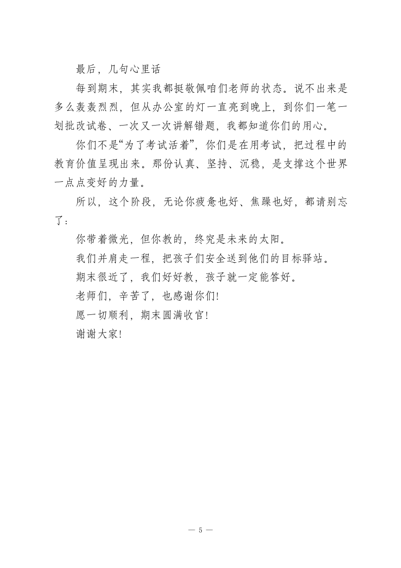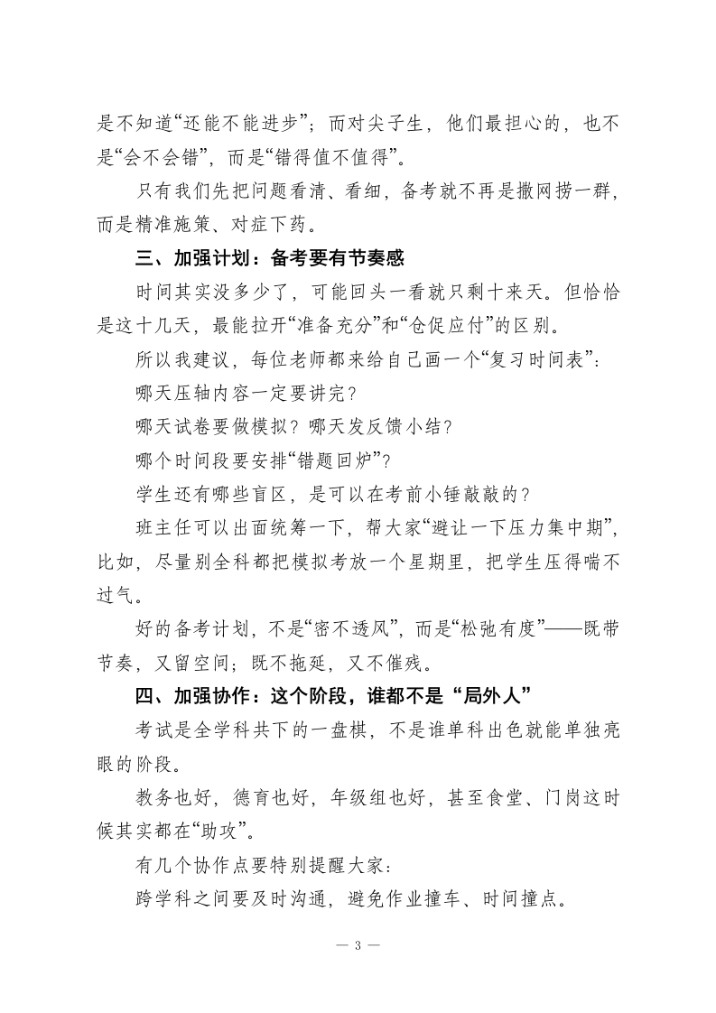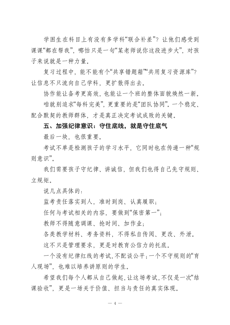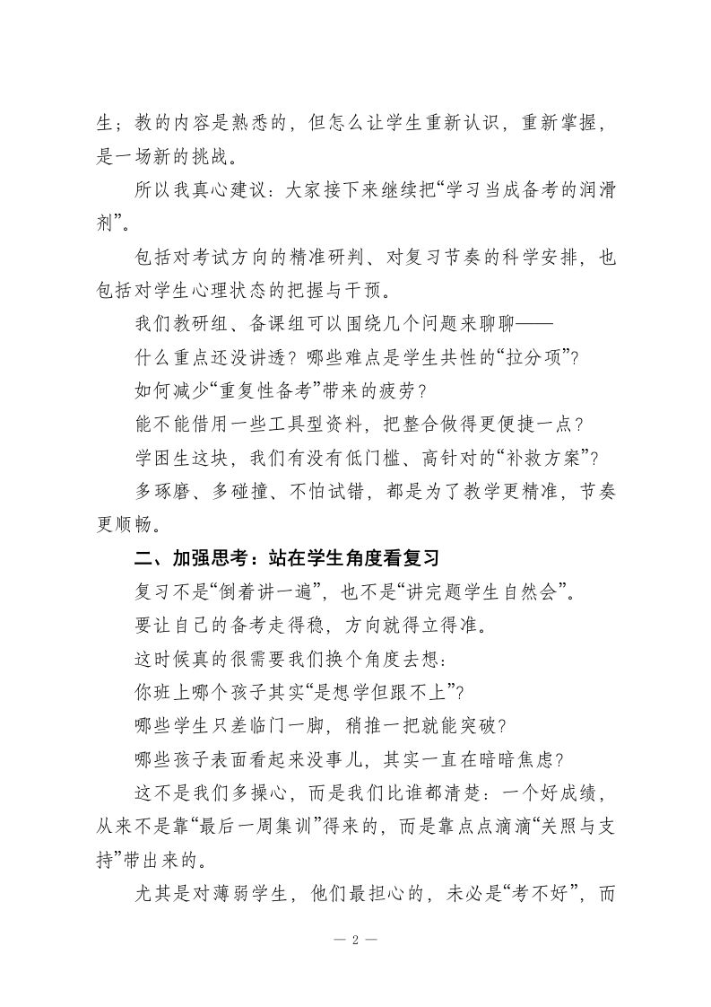 元旦返校,校长在全体教师会上讲话:“5个加强”扎实推进期末备考工作各位老师,大家上午好:元旦假期的热乎劲儿好像还没完全褪去,我们已经迅速回到了讲台。这就是教师的节奏一一节还没过完,心已经奔到了下一个节点。眼下最紧要的事,大家都心知肚明:期末考试近在眼前。这既是我们一学期教学成果的集中检阅,更是对我们作为教师的那份初心、专业度和责任感的又一次“期末答卷”。我知道,大家最近都很忙。课程进度要收尾,复习计划要推进,学生情绪要稳定。白天讲课、晚上备课、还要批改作业、诊断问题、调节状态.工作节奏是实打实地“实诚”,但成果可能没那么立刻、没那么耀眼。有人说,教育是一场“单向奔赴”。我想补一句:虽然是单向走去,但正因为我们的坚持,才有人走得更远。今天,我想围绕备考和期末阶段的“五个加强”,说点接地气的话,和大家共勉,也希望能为咱们这段关键期添些信心和方向。一、加强学习:找到备考发力点,少走弯路越临近考试,越不能只凭“老经验”,更不能陷入“凭感觉教学”的惯性思维。期末的复习课说简单也简单,无非是“回顾、总结、强化”;但说复杂也真复杂,因为面对的是“层次各异、状态不同”的学1