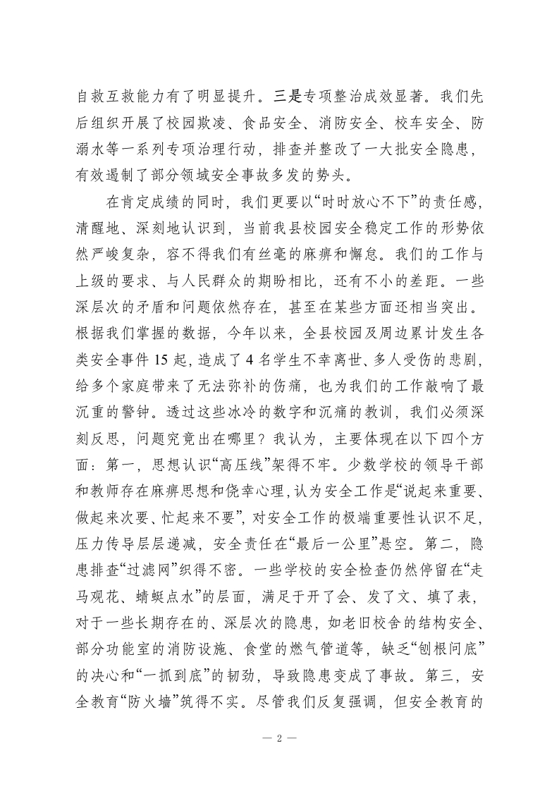 在2025年度全县校园稳定安全工作总结暨寒假期间安全工作部署会上的讲话同志们:今天,我们在这里召开全县校园稳定安全工作总结暨寒假期间安全工作部署会议,主要任务是深入贯彻落实上级关于校园安全稳定工作的系列指示精神,全面总结2025年度我县教育系统的安全工作,深刻分析当前我们面临的严峻形势与挑战,并对即将到来的寒假及明年春季开学期间的安全稳定工作进行再动员、再部署、再落实。刚才,相关同志已经就具体工作做了通报和安排,我都同意。下面,我再强调三点意见。一、回顾过去,正视成绩与不足,清醒认识校园安全工作的长期性与艰巨性2025年是极不平凡的一年,在县委、县政府的坚强领导和上级教育主管部门的有力指导下,全县教育系统广大干部职工、全体教职员工围绕“保稳定、促发展”的大局,兢兢业业,履职尽责,为维护教育系统的和谐稳定付出了巨大努力,取得了来之不易的成绩。回顾一年来的工作,我们主要有以下几个特点:一是责任体系不断健全。我们始终将安全工作置于首要位置,层层签订并严格落实安全工作责任书,明确了从局机关到各学校、从校长到每一位教职工的安全职责,“党政同责、‘一岗双责'齐抓共管、失职追责”的责任体系基本形成。二是预防工作扎实推进。全县各中小学、幼儿园普遍加强了人防、物防、技防建设,。组织开展了各类安全应急演练超过,师生的应急避险和—1