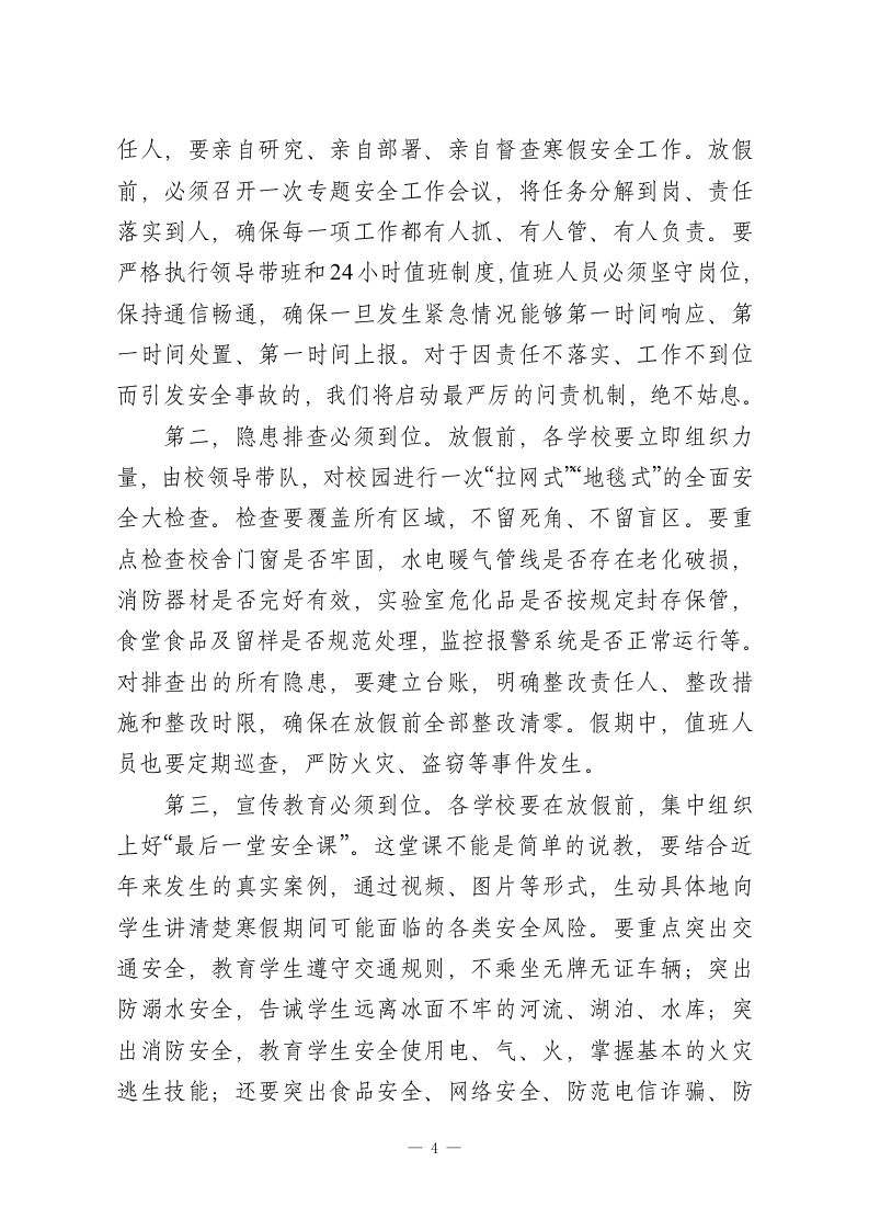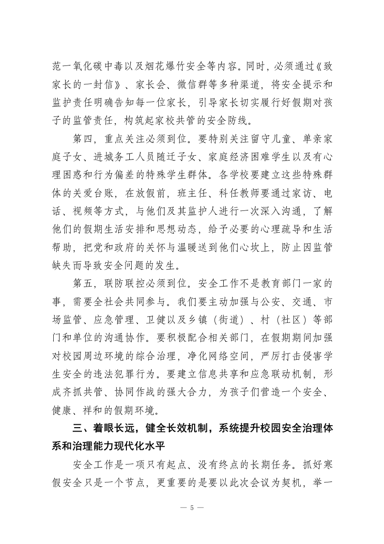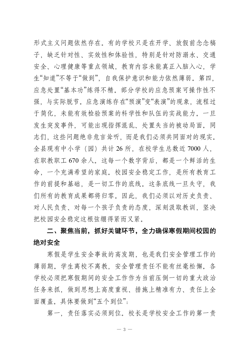 在2025年度全县校园稳定安全工作总结暨寒假期间安全工作部署会上的讲话同志们:今天,我们在这里召开全县校园稳定安全工作总结暨寒假期间安全工作部署会议,主要任务是深入贯彻落实上级关于校园安全稳定工作的系列指示精神,全面总结2025年度我县教育系统的安全工作,深刻分析当前我们面临的严峻形势与挑战,并对即将到来的寒假及明年春季开学期间的安全稳定工作进行再动员、再部署、再落实。刚才,相关同志已经就具体工作做了通报和安排,我都同意。下面,我再强调三点意见。一、回顾过去,正视成绩与不足,清醒认识校园安全工作的长期性与艰巨性2025年是极不平凡的一年,在县委、县政府的坚强领导和上级教育主管部门的有力指导下,全县教育系统广大干部职工、全体教职员工围绕“保稳定、促发展”的大局,兢兢业业,履职尽责,为维护教育系统的和谐稳定付出了巨大努力,取得了来之不易的成绩。回顾一年来的工作,我们主要有以下几个特点:一是责任体系不断健全。我们始终将安全工作置于首要位置,层层签订并严格落实安全工作责任书,明确了从局机关到各学校、从校长到每一位教职工的安全职责,“党政同责、‘一岗双责'齐抓共管、失职追责”的责任体系基本形成。二是预防工作扎实推进。全县各中小学、幼儿园普遍加强了人防、物防、技防建设,。组织开展了各类安全应急演练超过,师生的应急避险和—1