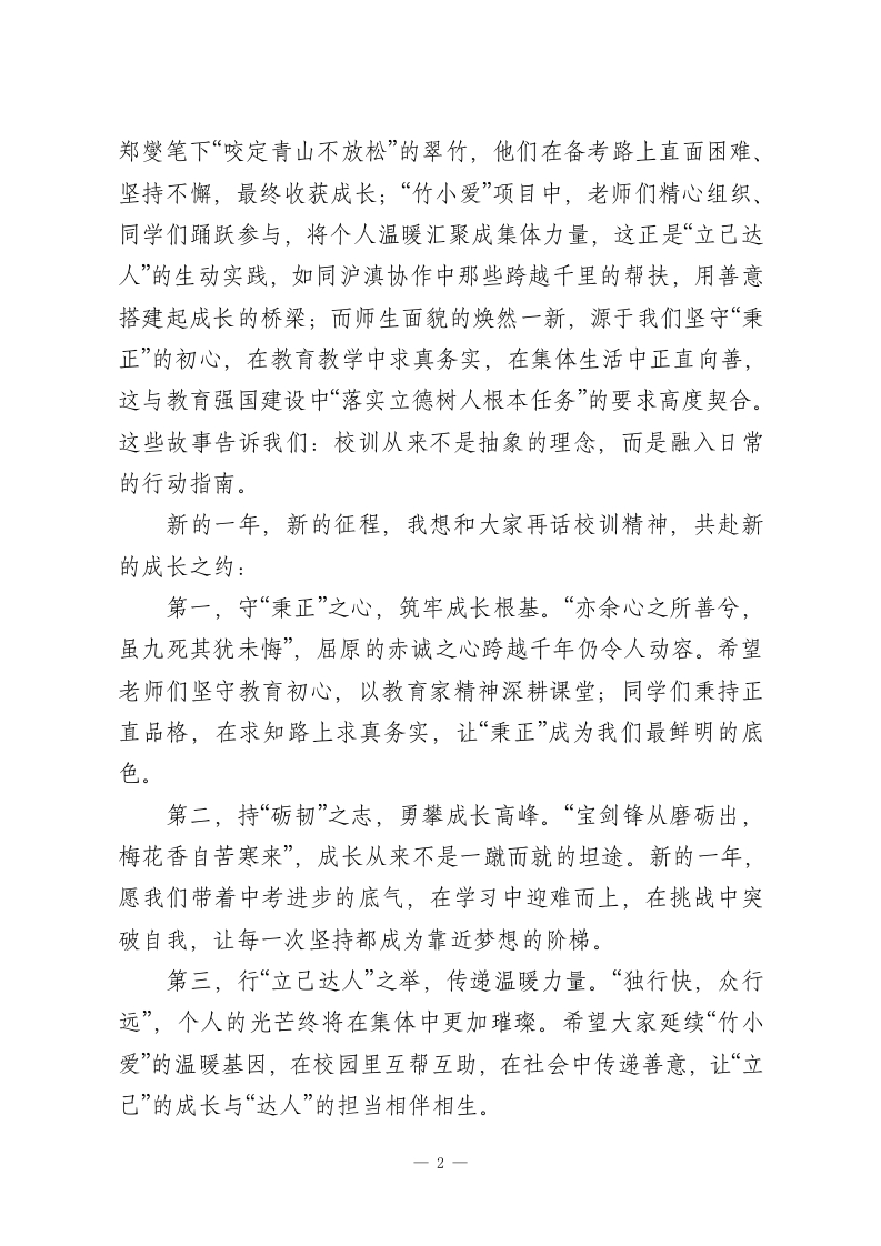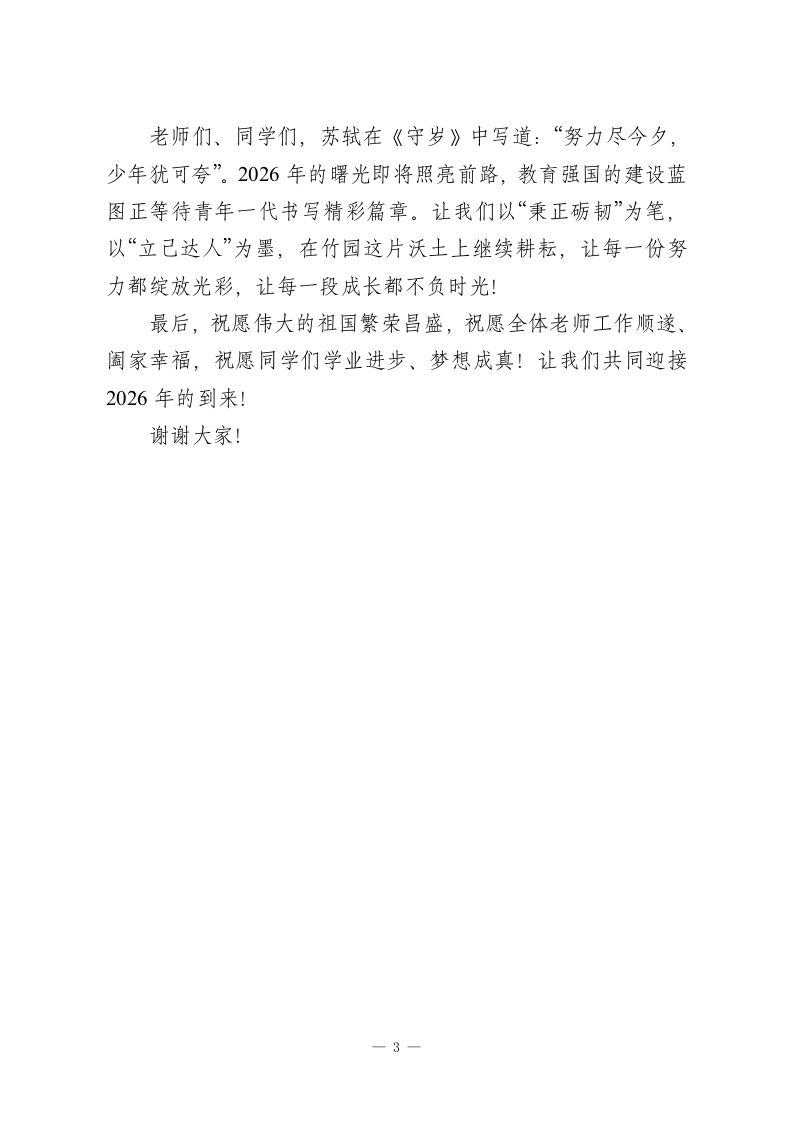 在xxx中学校园迎新活动上的致辞:秉正砺韧开新局,立己达人赴新程亲爱的老师们、同学们:大家下午好!岁聿云暮,新元肇启。当校园的翠竹抖落最后一片冬霜,当新年的钟声即将在耳畔回响,我们齐聚于此,挥别砥砺奋进的2025年,共赴充满希望的2026年新征程。正如孟浩然笔下“昨夜斗回北,今朝岁起东”,时光的年轮镌刻着我们的成长,也铺展着更壮阔的前行道路。回望2025年,国家发展的画卷波澜壮阔,竹园学子的成长步履铿锵。这一年,新中国成立76周年的荣光激荡人心,“十四五”规划圆满收官的捷报振奋全国,嫦娥六号月背采样、深中通道贯通等重大成就,彰显着中国“敢为人先、攻坚克难”的奋进姿态。而在竹园校园里,“秉正砺韧,立己达人”的校训不是墙上的文字,早已化作师生们的行动勋章。2025届学子用“千淘万漉虽辛苦”的韧劲,实现中考排名跃升近四十名的突破,每一分进步都镌刻着清晨的诵读、深夜的演算;“竹小爱”公益项目跨越山海,将温暖送往云南学子身边,这恰是沪滇协作中社会公益力量的生动缩影,从爱心捐助到文化交流,我们用行动诠释“立已达人”的深意;更令人欣喜的是,课堂上的探究更深入、活动中的协作更默契,师生们的精神面貌如春风拂过的竹园,焕发着蓬勃生机。站在新年的门槛回望,那些闪光的瞬间,都离不开校训精神的滋养。2025届学子的进步,是“砺韧”的最佳注脚一一正如1