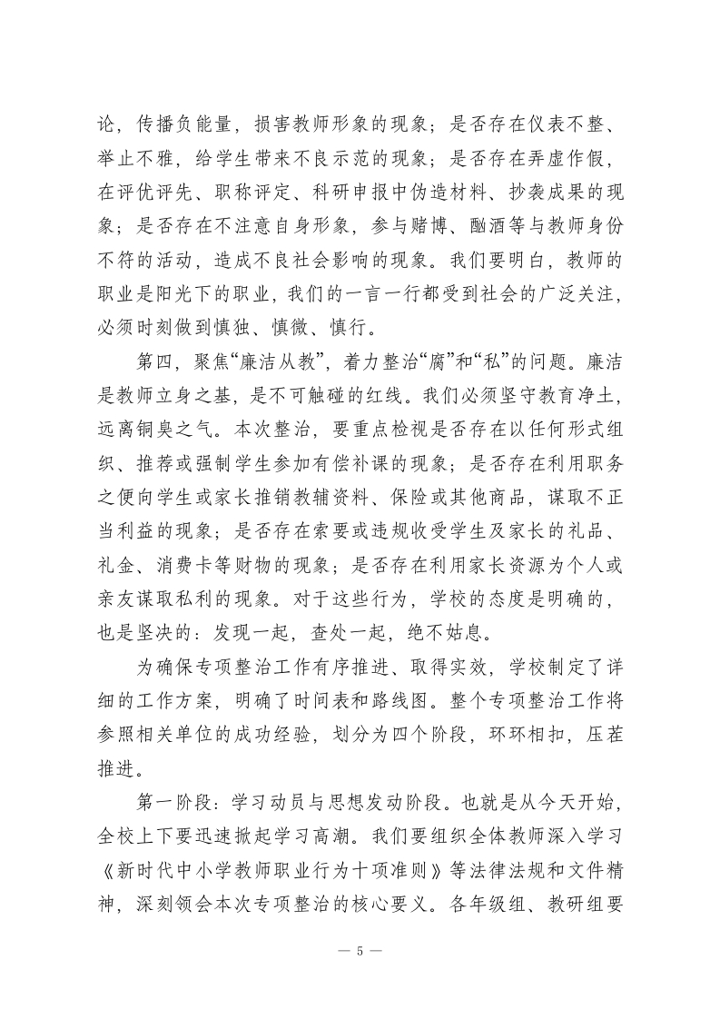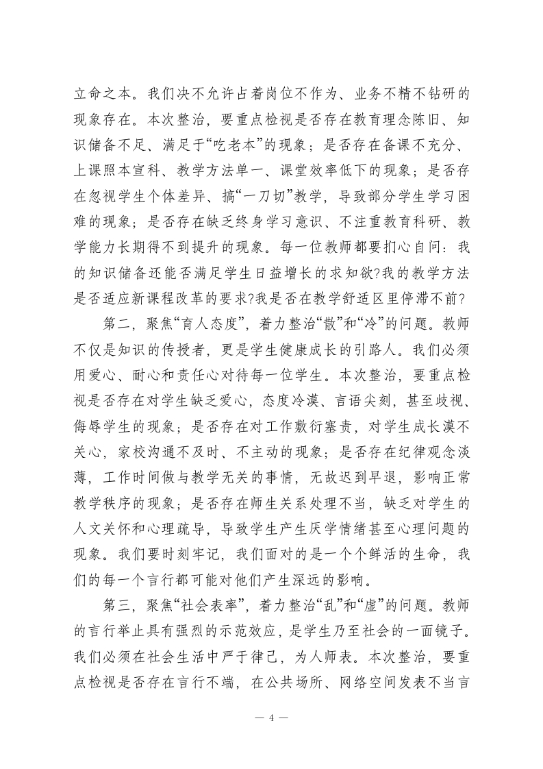 在XX市XX区XX小学全体教师师德师风专项整治会议上的讲话各位老师,同志们:大家好」今天,我们在这里召开全体教师师德师风专项整治会议,这既是一次深刻的思想动员会,也是一次严肃的工作部署会。在当前教育改革向纵深推进、社会对优质教育期盼日益增长的关键时期,我们召开这样一次会议,其目的十分明确,就是要进一步统一思想、凝聚共识,正视问题、刮骨疗毒,以最坚决的态度、最务实的举措,全面加强我校的师德师风建设,努力打造一支让党放心、让人民满意、让学生爱戴的高素质专业化教师队伍。今天的会议,我们不讲客套话,直面主题,深入剖析,希望每一位同志都能认真听、用心记,将会议精神内化于心、外化于行。下面,我围绕本次专项整治工作,讲三个方面的意见。一、提高站位,深刻认识新时代加强师德师风建设的极端重要性与现实紧迫性国将兴,必贵师而重傅。教师是立教之本、兴教之源,承担着为党育人、为国育才的神圣使命。党的十八大以来,以习近平同志为核心的党中央高度重视教师队伍建设,将师德师风作为评价教师队伍素质的第一标准,提出了一系列新思想、新论断、新要求,为我们加强师德师风建设指明了前进方向,提供了根本遵循。我们必须深刻认识到,加强师德师风建设,是1