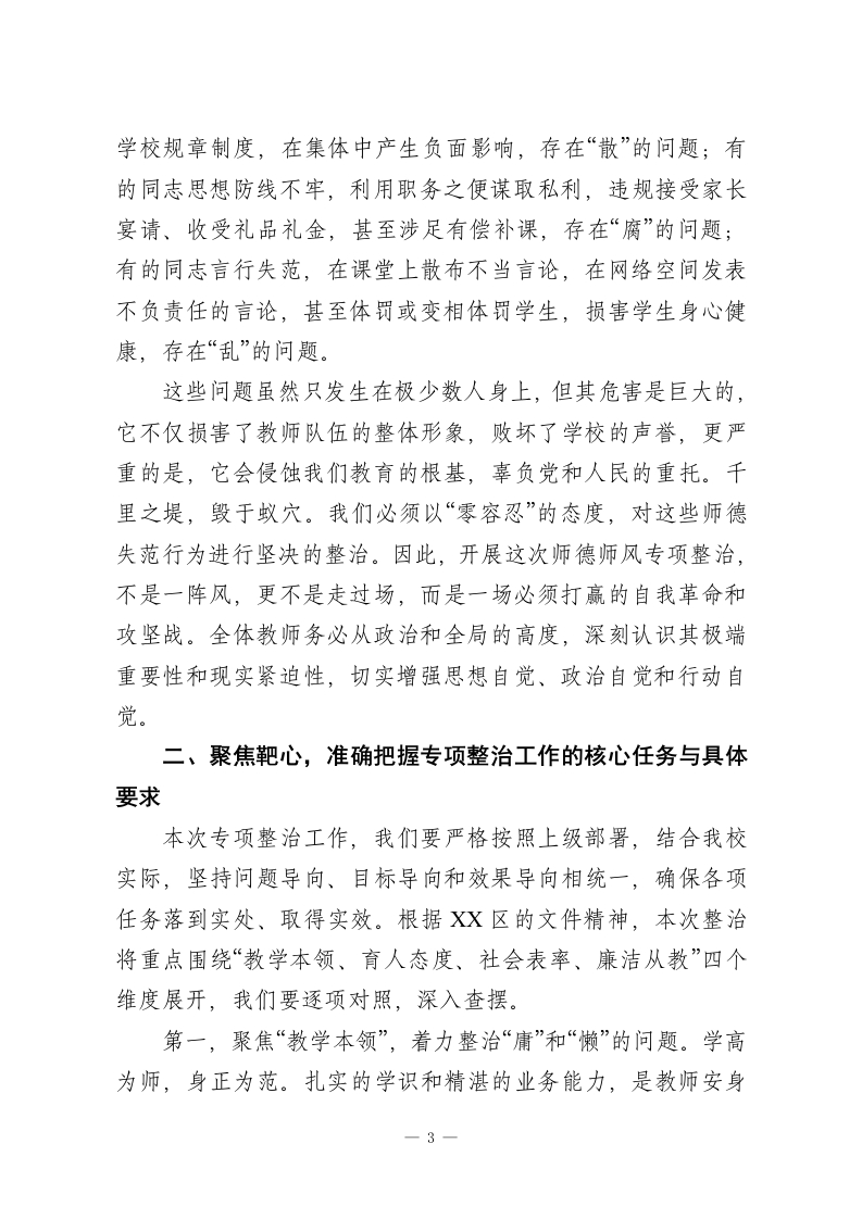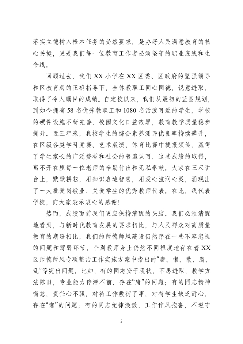 在XX市XX区XX小学全体教师师德师风专项整治会议上的讲话各位老师,同志们:大家好」今天,我们在这里召开全体教师师德师风专项整治会议,这既是一次深刻的思想动员会,也是一次严肃的工作部署会。在当前教育改革向纵深推进、社会对优质教育期盼日益增长的关键时期,我们召开这样一次会议,其目的十分明确,就是要进一步统一思想、凝聚共识,正视问题、刮骨疗毒,以最坚决的态度、最务实的举措,全面加强我校的师德师风建设,努力打造一支让党放心、让人民满意、让学生爱戴的高素质专业化教师队伍。今天的会议,我们不讲客套话,直面主题,深入剖析,希望每一位同志都能认真听、用心记,将会议精神内化于心、外化于行。下面,我围绕本次专项整治工作,讲三个方面的意见。一、提高站位,深刻认识新时代加强师德师风建设的极端重要性与现实紧迫性国将兴,必贵师而重傅。教师是立教之本、兴教之源,承担着为党育人、为国育才的神圣使命。党的十八大以来,以习近平同志为核心的党中央高度重视教师队伍建设,将师德师风作为评价教师队伍素质的第一标准,提出了一系列新思想、新论断、新要求,为我们加强师德师风建设指明了前进方向,提供了根本遵循。我们必须深刻认识到,加强师德师风建设,是1