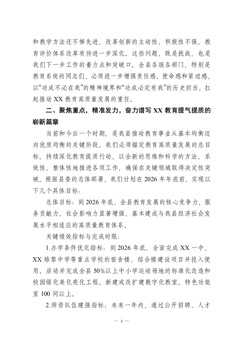 在XX县教育提质行动推进会议上的讲话同志们:今天,我们在这里召开全县教育提质行动推进会议,主要任务是深入贯彻落实中央和省、市关于教育工作的决策部署,总结前一阶段我县教育提质行动的成效,分析当前面临的形势和挑战,安排部署下一阶段的重点工作,动员全县上下进一步统一思想、凝聚共识、加压奋进,全力推动XX教育事业迈上新台阶、实现新跨越。会前,我和国杰同志以及几位县领导,一同前往XX三中和XX一中进行了实地调研。我们看到了塔吊林立、热火朝天的项目建设现场,也看到了窗明几净、书声琅琅的教学环境;我们听取了学校负责同志关于教育教学、安全管理等方面的工作汇报,也与一线教师进行了亲切交流。总的来看,近年来,特别是教育提质行动启动以来,全县教育系统广大干部职工和教职员工付出了巨大努力,各项工作取得了显著成效,教育事业呈现出蓬勃发展的良好态势。在此,我代表县委、县政府,向辛勤工作在教育战线上的全体同志们,表示衷心的感谢和崇高的敬意!下面,我讲三点意见。一、肯定成绩,正视差距,深刻认识推进教育提气提质的极端重要性百年大计,教育为本。县委、县政府始终坚持教育优先发展战略,将“教育提质行动”作为全县八大行动之一重点推进,1