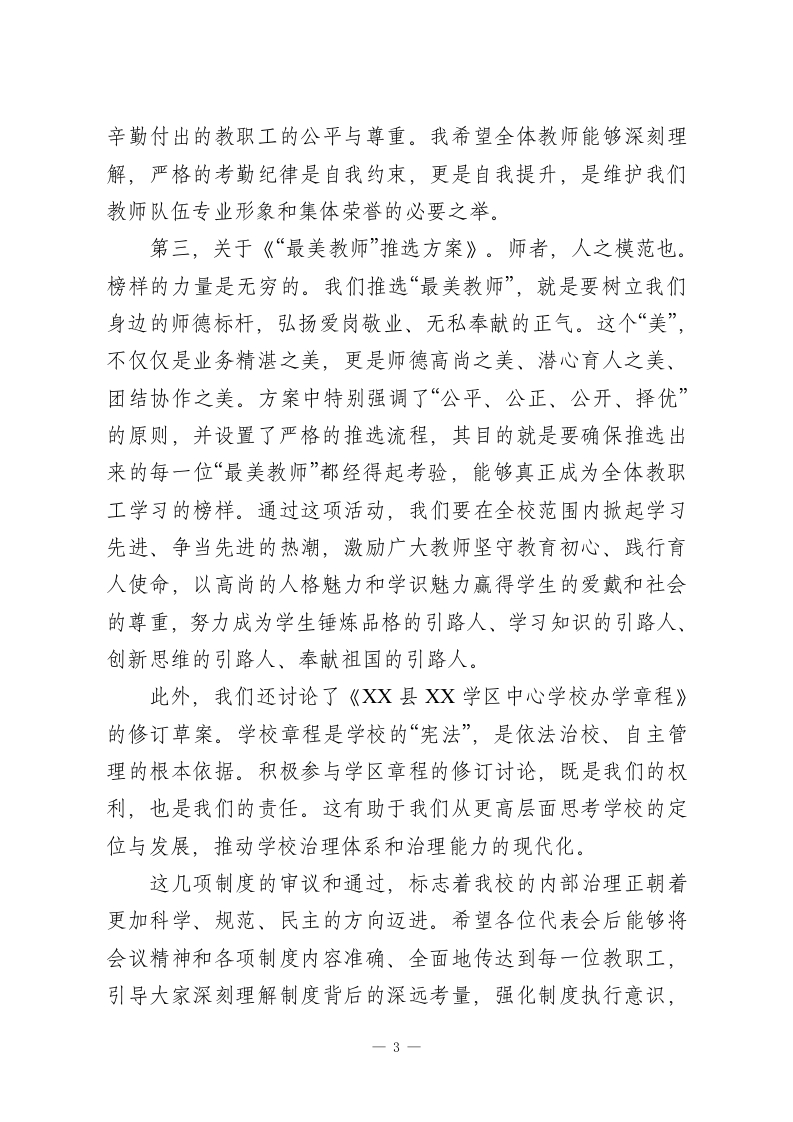 在XX镇XX小学第九届教职工代表大会第四次会议上的总结讲话各位代表、同志们:大家好!今天,我们在这里隆重举行XX镇XX小学第九届教职工代表大会第四次会议。冬日虽寒,但会场内民主、热烈的气氛让我们倍感温暖,也让我们对学校的未来充满了信心和力量。在全体代表的共同努力下,本次大会圆满完成了预定的各项议程,即将胜利闭幕。在此,我谨代表学校领导班子,向各位代表的辛勤付出和高度负责的精神表示衷心的感谢!本次会议是一次凝心聚力、共谋发展的大会,是一次发扬民主、科学决策的大会,更是一次团结奋进、开启新程的大会。会议期间,代表们以饱满的政治热情和强烈的主人翁精神,认真听取并审议了《X镇XX小学公假代课实施方案》《XX镇XX小学教师考勤随机抽查方案》和《XX镇XX小学“最美教师”推选方案》,并对《XX县XX学区中心学校办学章程》草案进行了深入的讨论。大家着眼于学校发展的全局,立足于广大教职工的根本利益,畅所欲言,建言献策,提出了许多富有建设性的意见和建议。这充分体现了我们XX小学教职工队伍同心同德、共担使命的卓越品质,也充分彰显了教职工代表大会制度在学校治理体系中的重要作用。借此机会,我想就本次会议审议通过的几项重要制度和学校未来的发展,谈三点看法,与各位代表和全体同仁共勉。一1