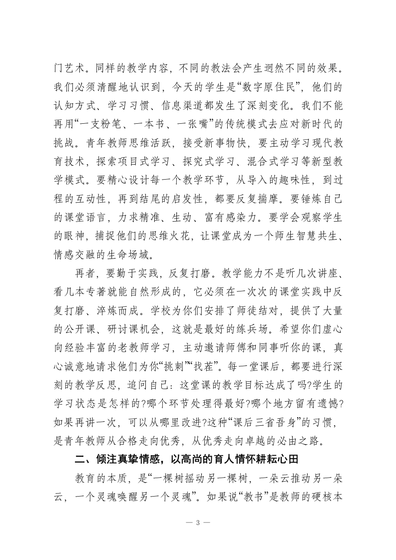 在XX中学2025年青年教师座谈会上的讲话各位青年教师,同志们:大家好」今天,我们齐聚一堂,举行这次以“选择了教师,选择一种生活方式”为主题的青年教师座谈会,意义非凡。刚才,我们认真听取了XX老师和XX老师两位青年教师代表的精彩发言,他们结合自身的教学实践和班级管理工作,分享了初为人师的感悟与成长,言辞恳切,思考深入,让我们看到了青年一代教育工作者的热情与担当。XX等几位校领导也分别从不同角度,对青年教师的常规工作提出了中肯的意见,对未来的发展寄予了殷切的期望。整个座谈会气氛热烈、交流深入,思想的火花在碰撞,成长的共识在凝聚。我能深切地感受到,在座的每一位青年教师身上,都洋溢着蓬勃的朝气、昂扬的锐气和对教育事业最纯粹的热爱。选择成为一名教师,不仅仅是选择了一份职业,更是选择了一种独特而厚重的生活方式。这种生活方式,意味着与书香为伴,与青春同行;意味着在传道授业中实现自我价值,在立德树人中感受生命成长;更意味着将个人的理想追求,融入到国家发展和民族复兴的伟大事业之中。我们XX中学教育集团XX校区,作为一所承载着社会广泛关注和深切厚望的学校,从诞生之日起,就立志于打造一个高起点、高标准、高质量的教育高地。你们能够从激烈的竞争中脱颖而出,加入我们这个大1