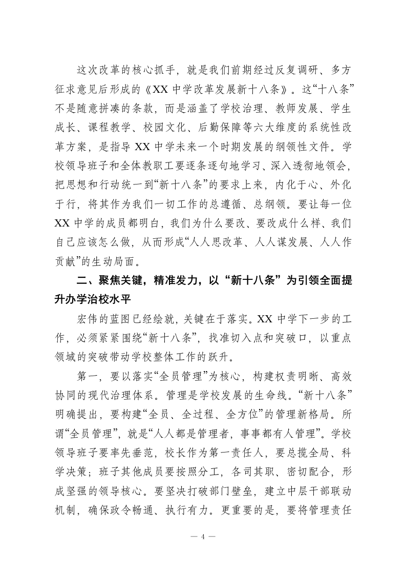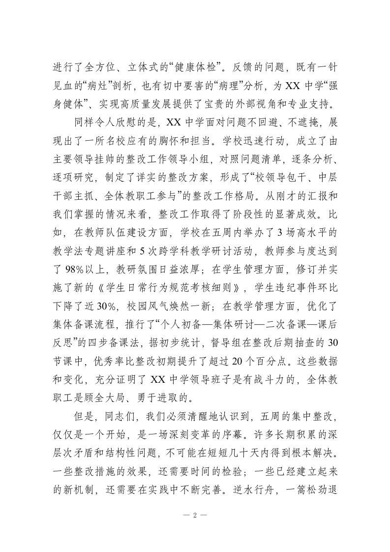 在市教育局督查XX中学办学情况反馈问题整改工作汇报会上的讲话同志们:今天,我们在这里召开市教育局督查XX中学办学情况反馈问题整改工作汇报会,主要目的有两个:一是全面总结过去五周专项督导工作的成果与经验,检验XX中学针对反馈问题所开展的整改工作成效;二是深入分析当前学校发展面临的新形势、新挑战,共同擘画XX中学未来发展的蓝图,进一步统一思想、凝聚共识、压实责任,确保各项改革措施落地生根、开花结果。刚才,XX校长代表学校领导班子,就前期整改工作情况和下一步的工作规划作了详尽的汇报,态度诚恳、措施具体、思路清晰。各个督导组的组长也结合各自的督导领域,提出了非常中肯、具有很强操作性的意见和建议。这充分说明,我们的督导工作是扎实的,XX中学的整改工作是认真的。在此,我代表市委教育工委、市教育局,对不辞辛劳、深入一线的督导组全体同志表示衷心的感谢!对XX中学领导班子和全体教职员工在整改期间付出的努力和取得的初步成效,给予充分的肯定!过去的五周,是XX中学历史上一次深刻的自我审视和集中会诊。市教育局派出的督导组,本着对XX中学负责、对XX市教育事业负责、对广大学生和家长负责的高度责任感,通过听课、座谈、查阅资料、问卷调查等多种形式,对学校的办学理念、管理机制、师资队伍、课程教学、学生发展等方方面面1