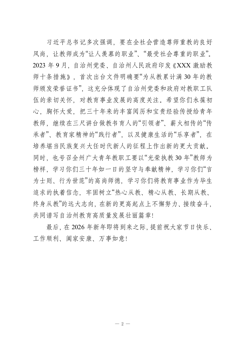 在元旦春节送温暖行动启动仪式暨慰问“光荣执教30年”一线教职工活动上的讲话各位老师,同志们:岁序更迭,华章日新。在即将迎来2026年新春佳节之际,我们相聚在XXX第三中学,举行XXX教育工会元旦春节送温暖行动启动仪式暨“情系教育三十载温暖关怀传真情”集中慰问“光荣执教30年”一线教职工活动。首先,我谨代表XXX教育工会,向所有默默躬耕教坛30年、为XXX教育事业发展奉献毕生心血的广大教职工,致以最诚挚的问候和最崇高的敬意!从事教育职业是光荣的,能坚守三十年更是难能可贵。三十年对于教师,意味着一万一千个日日夜夜的执着坚守,意味着从青丝到华发的不变初心,意味着对教育事业的极致专注与无限热爱。三十载春华秋实,你们把知识的种子播撒进无数稚嫩的心田;三十载风雨兼程,你们用智慧的明灯照亮学子前行的道路;三十载呕心沥血,你们以崇高的师德诠释了“大先生“教育家”精神的深刻内涵。三十年光荣执教路,三十年深耕育新人。你们是XXX教育发展的亲历者、见证者和推动者,是青年教师学习的榜样和楷模,更是昌吉教育战线上最宝贵的财富;你们用行动书写忠诚,用汗水浇灌希望,用平凡成就伟大,在XXX教育发展历程中每一份亮眼的成绩单,都深深烙刻着你们的心血与汗水。为你们的默默坚守点赞!为你们的辛勤付出点赞!