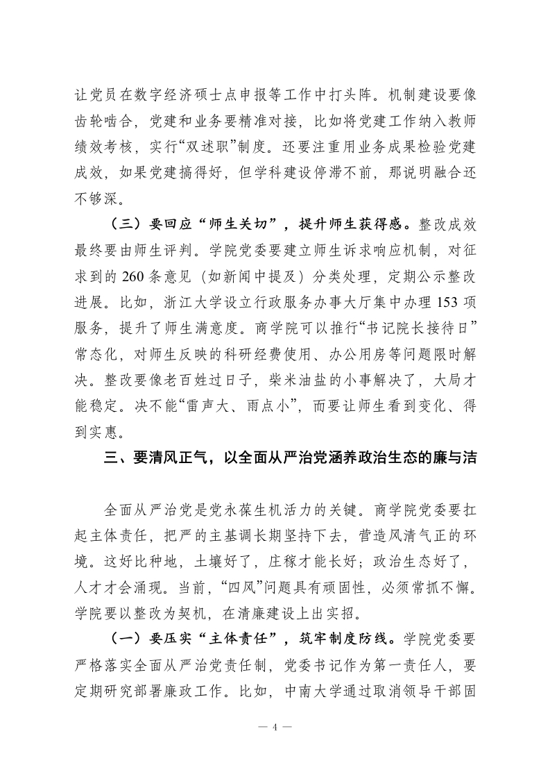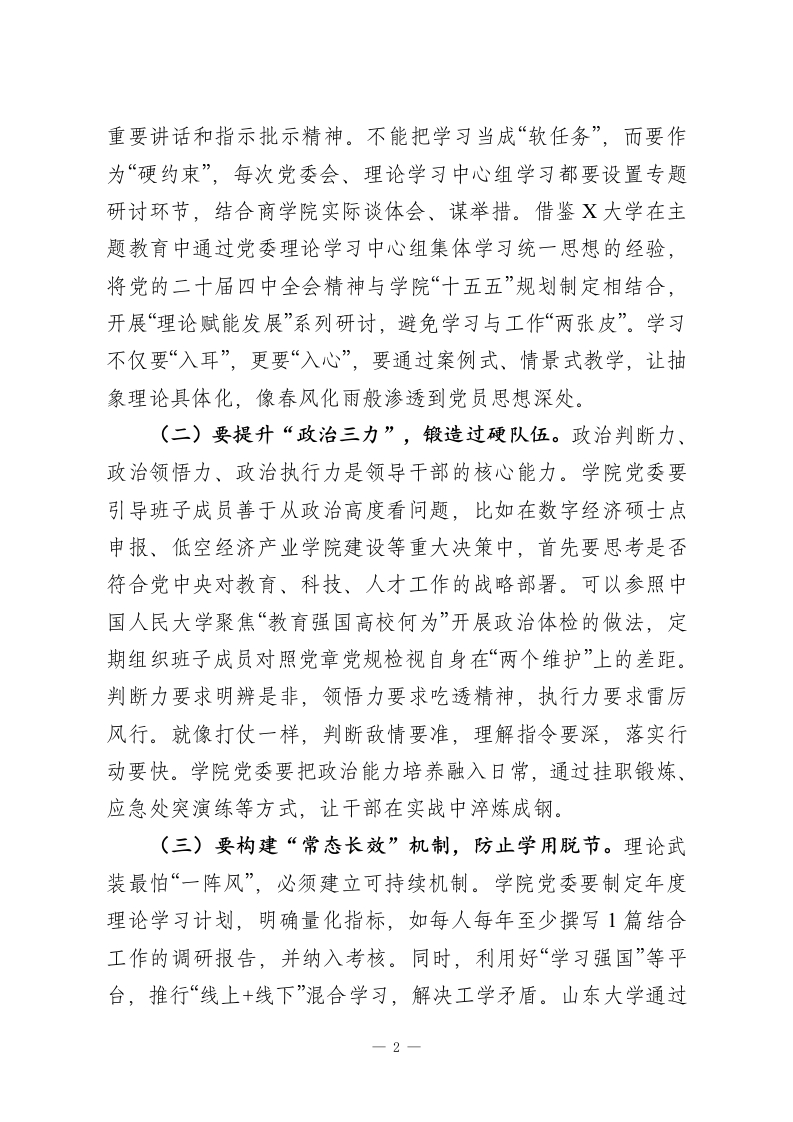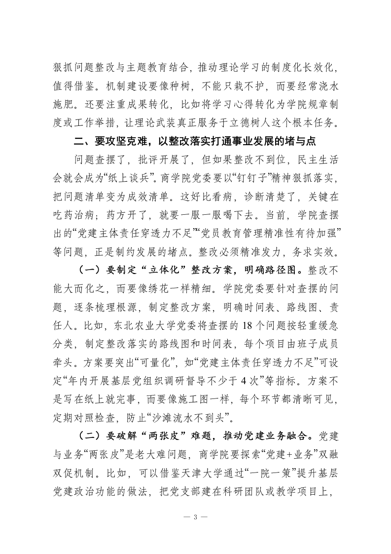 学校党委副书记在参加所属党委2025年度民主生活会上的点评讲话同志们:刚才,X代表商学院党委通报了本次民主生活会的准备情况和前期整改成效,班子成员逐一作了对照检查,并开展了严肃认真的批评与自我批评。大家准备充分,严肃认真,检视问题不遮掩不回避,相互批评坦诚相见,整改措施具体务实,充分反映出学院党委领导班子风清气正、严肃团结的良好氛围,进一步淬炼了党性,达到了增进团结、改进工作、担当使命的效果。这次民主生活会不是终点,而是新起点。学院党委要以此次民主生活会为契机,使整改过程成为扎实贯彻习近平总书记重要指示精神和党中央决策部署的过程,下面,我在谈四点意见。一、要铸魂固本,以理论武装筑牢政治忠诚的根与魂理论是行动的先导,思想是实践的灯塔。商学院党委要始终把政治建设摆在首位,让理论武装成为推动事业发展的内生动力。这就好比盖房子,地基不牢,地动山摇;只有根基扎实,高楼才能屹立不倒。当前,国内外形势复杂多变,高校作为意识形态前沿阵地,必须通过强化理论武装,确保学院发展不偏航、不掉队。这部分,我强调三个关键点。(一)要深化“第一议题”制度,把稳思想之舵。学院党委要把学习贯彻习近平新时代中国特色社会主义思想作为首要政治任务,坚持“第一议题”制度,及时跟进习近平总书记最新1