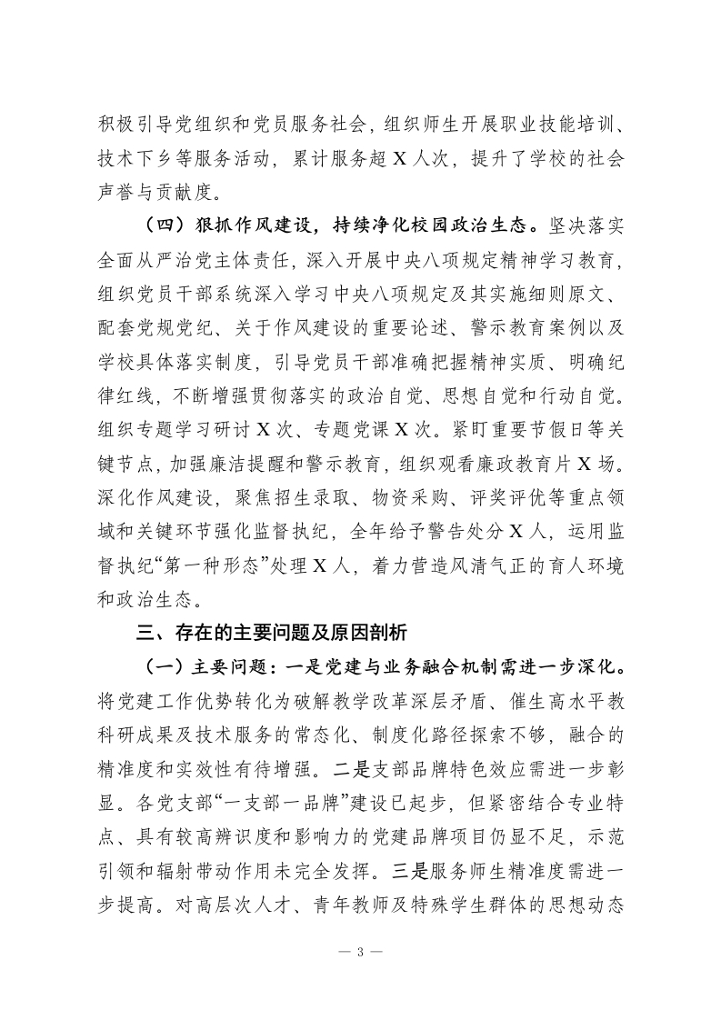 学校党委书记2025年度抓基层党建工作述职报告根据上级统一安排,现将本人2025年度履行抓基层党建工作第一责任人职责情况汇报如下。一、上年度问题整改落实情况针对上年度市教育工委抓基层党建工作述职评议会中自查发现的X个问题及点评指出的X个问题,本人牵头制定整改方案,明确责任与时限。通过强化政治理论学习、创新党建工作载体、夯实党务工作队伍基础等措施,截至目前,所有问题均已按计划完成整改,并建立了相应长效机制,巩固整改成效。二、2025年度履职主要情况(一)强化政治引领,牢牢把握社会主义办学方向。始终将政治建设置于首位,坚决履行第一责任人职责和“一岗双责”。全年主持召开党委会X次,其中专题研究党建工作X次,确保党中央各项决策部署及上级工作要求在学校不折不扣贯彻落实。严格落实意识形态工作责任制,主持召开分析研判会X次,加强对课堂教学、教材选用、网络平台及各类宣传思想文化阵地的建设与管理,组织教材专项审读X次,切实维护意识形态安全。持续深化理论武装,组织党员干部深入学习贯彻党的二十大精神及党章党规党纪,教育引导广大党员不断提升政治判断力、政治领悟力、政治执行力。(二)夯实组织基础,着力建强基层战斗堡垒。严格规范组织生活,全年组织召开支部党员大会X次、支委会X次、党1