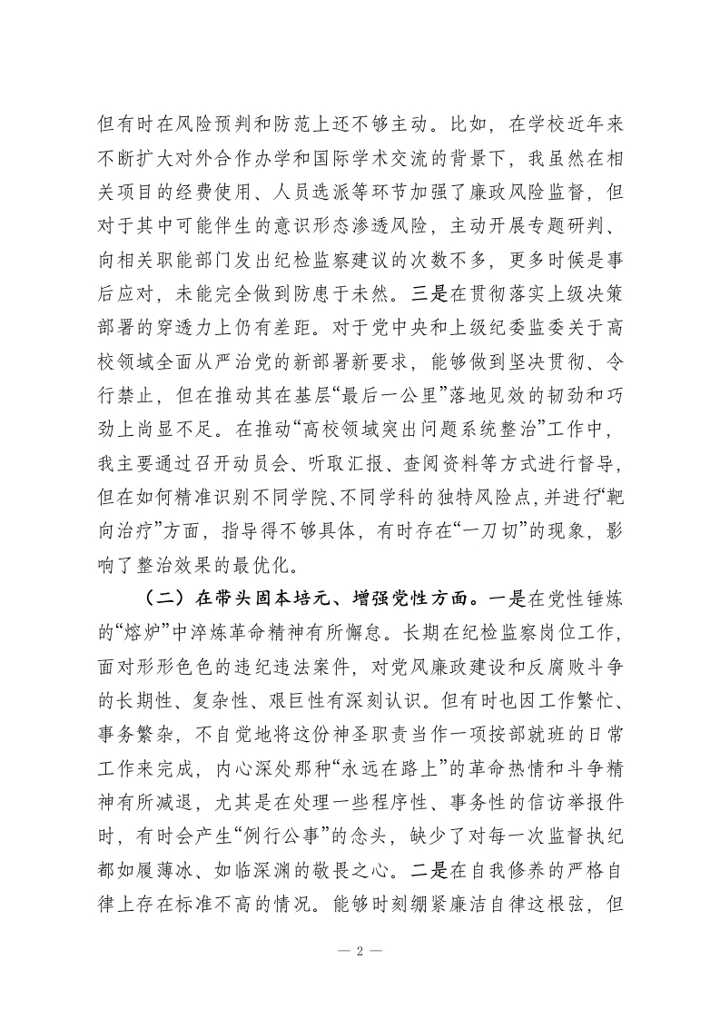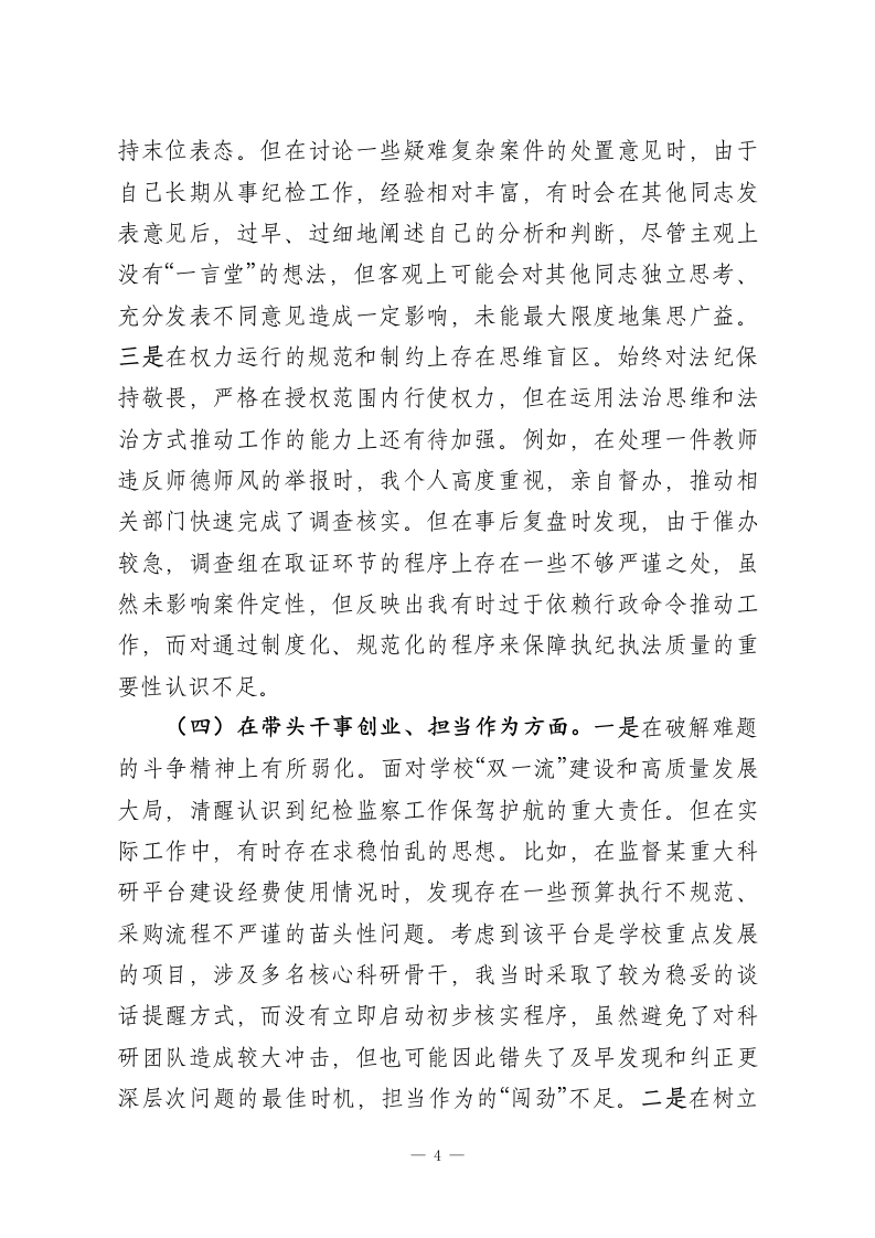 学校纪委书记2025年度民主生活会个人对照检查材料(五个带头)根据校党委关于召开2025年度民主生活会的统一部署和要求,我紧扣本次民主生活会主题,在深入学习领会习近平新时代中国特色社会主义思想,全面贯彻党的二十届三中、四中全会精神,以及持续深化中央八项规定精神学习教育的基础上,通过与班子成员、分管领域同志深入开展谈心谈话,并广泛征求意见建议,对照“带头强化政治忠诚、提高政治能力”等五个方面,深入查摆了自身存在的问题,深刻剖析了问题产生的根源,明确了今后的努力方向和整改措施。现将个人对照检查情况报告如下。一、存在的主要问题(一)在带头强化政治忠诚、提高政治能力方面。一是在将政治理论学习成果转化为政治能力的深度上仍有欠缺。虽然能够积极参加校党委理论学习中心组的各项学习活动,并坚持个人自学,但在“深化、内化、转化”上做得还不够。例如,在学习党的二十届四中全会关于完善党的自我革命制度规范体系的新论断新要求时,满足于学过了、理解了,但在如何结合学校纪检监察工作实际,创造性地构建符合我校特点的“大监督”格局方面,思考得不够系统、谋划得不够深远,导致提出的部分工作举措仍然沿袭过往思路,缺乏前瞻性和创新性。二是在运用政治眼光观察分析问题的敏锐性上仍有不足。作为纪委书记,对校园内的政治风险和意识形态领域的复杂性有清醒认识,1
