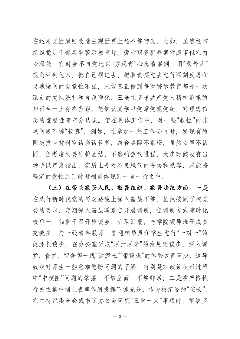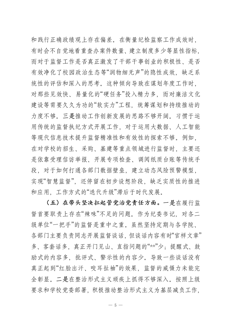 学校纪委书记2025年度民主生活会个人对照检查材料(五个带头)根据校党委关于召开2025年度民主生活会的统一部署和要求,我紧扣本次民主生活会主题,在深入学习领会习近平新时代中国特色社会主义思想,全面贯彻党的二十届三中、四中全会精神,以及持续深化中央八项规定精神学习教育的基础上,通过与班子成员、分管领域同志深入开展谈心谈话,并广泛征求意见建议,对照“带头强化政治忠诚、提高政治能力”等五个方面,深入查摆了自身存在的问题,深刻剖析了问题产生的根源,明确了今后的努力方向和整改措施。现将个人对照检查情况报告如下。一、存在的主要问题(一)在带头强化政治忠诚、提高政治能力方面。一是在将政治理论学习成果转化为政治能力的深度上仍有欠缺。虽然能够积极参加校党委理论学习中心组的各项学习活动,并坚持个人自学,但在“深化、内化、转化”上做得还不够。例如,在学习党的二十届四中全会关于完善党的自我革命制度规范体系的新论断新要求时,满足于学过了、理解了,但在如何结合学校纪检监察工作实际,创造性地构建符合我校特点的“大监督”格局方面,思考得不够系统、谋划得不够深远,导致提出的部分工作举措仍然沿袭过往思路,缺乏前瞻性和创新性。二是在运用政治眼光观察分析问题的敏锐性上仍有不足。作为纪委书记,对校园内的政治风险和意识形态领域的复杂性有清醒认识,1