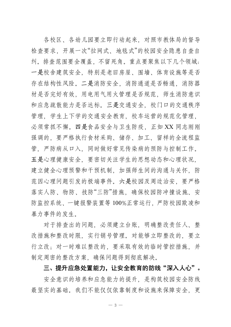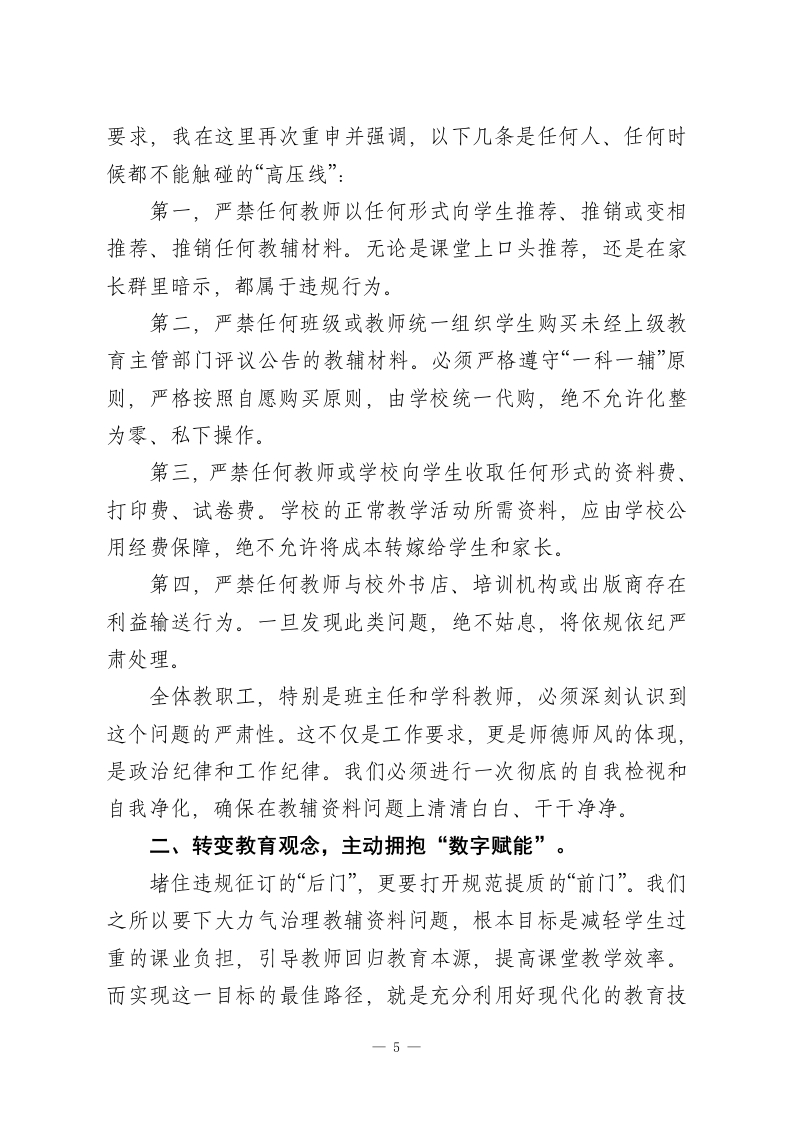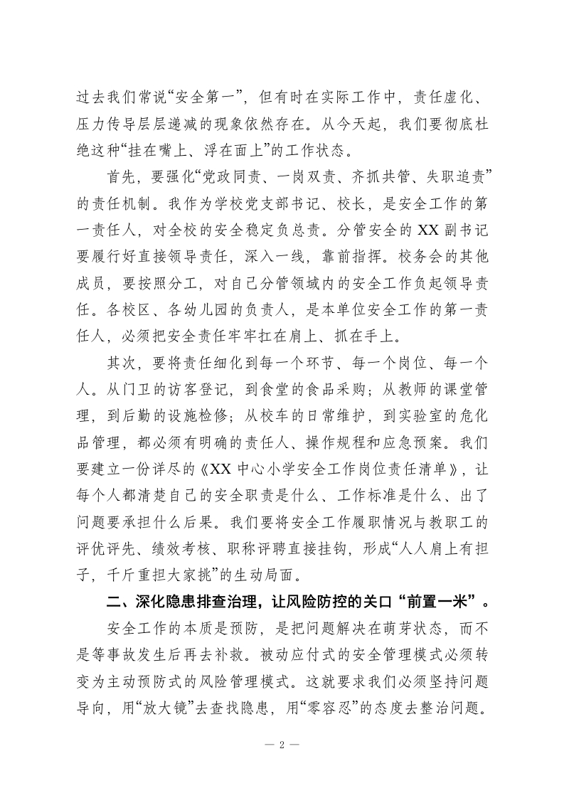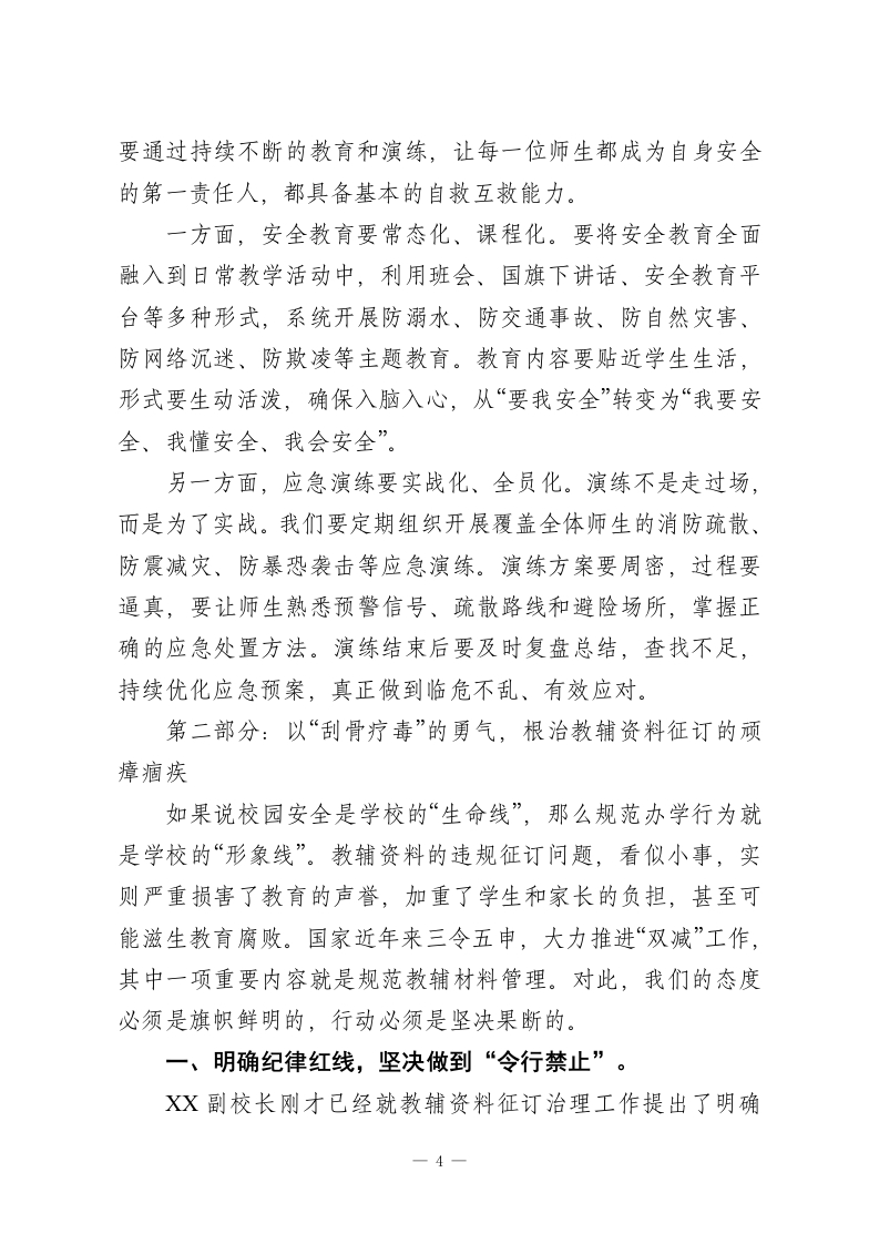 在XX中心小学召开校园安全稳定暨教辅资料征订专项治理工作推进会上的讲话同志们:今天,我们在这里召开XX中心小学年度首次、也是至关重要的一次工作推进会,主题聚焦于两项核心工作:校园安全稳定与教辅资料征订专项治理。这两项工作,前者是学校生存与发展的基石,是不可逾越的红线;后者则关乎教育公平、师德师风与学生家长的切身利益,是规范办学行为的底线。我们必须以最清醒的头脑、最坚决的态度、最务实的作风,深刻领会今天的会议精神,并将其不折不扣地转化为行动自觉,确保我们的校园成为最阳光、最安全的地方。下面,我将围绕这两项重点工作,讲几点意见。第一部分:以“万无一失”的决心,筑牢校园安全稳定的铜墙铁壁安全是1,其他所有工作都是后面的0。没有了安全这个1,再多的0都毫无意义。就在近期,XX市教体局专门下发了《关于开展全市校园安全工作督导检查的通知》,这既是对我们工作的全面检阅,更是对我们提出的更高要求。我们必须提高政治站位,深刻认识到抓好校园安全工作,不仅是办好人民满意教育的基本前提,更是维护社会和谐稳定的重要基石。结合文件精神与我校实际,我强调以下四个方面:一、全面压实责任体系,让安全管理的链条“环环相扣”。安全工作,人人有责,但责任必须明确到人、具体到岗。1