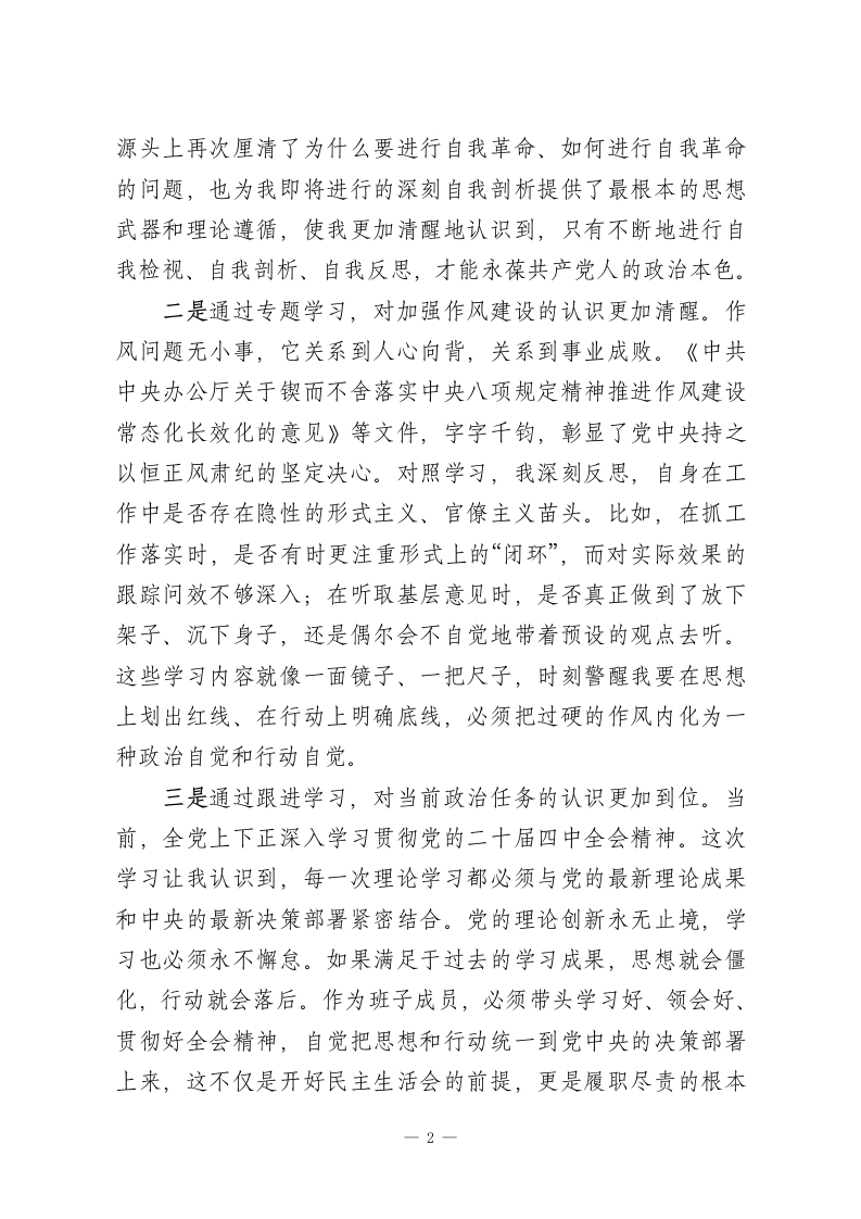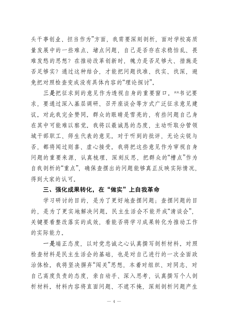 在学校民主生活会专题学习会上研讨发言材料同志们:根据单位安排,今天我们召开这次专题学习会,主要目的是为即将召开的2025年度党员领导干部民主生活会打牢思想基础。刚才,我们共同学习了指定内容,几位同志也作了很好的发言。下面,结合我的学习和思考,从个人角度谈三点不成熟的体会,以期与大家共同深化认识、凝聚共识,为开好一次高质量的民主生活会做好充分的思想准备。一、深化理论武装,在“学懂”上固本培元思想是行动的先导,理论是实践的指南。民主生活会既是一次严格的组织生活,更是一次深刻的党性洗礼和思想检视。会前的学习,就是一次思想上的“加油”和精神上的“补钙”。通过重温《习近平总书记关于党的建设的重要思想概论》《习近平关于加强党的作风建设的论述摘编》等重要内容,我感到收获很大,思想认识也得到进一步提升。一是通过系统学习,对党的自我革命的认识更加深刻。习近平总书记关于党的建设的重要思想,深刻回答了“建设什么样的长期执政的马克思主义政党、怎样建设长期执政的马克思主义政党”的重大时代课题。其中,自我革命是贯穿始终的一条鲜明主线。我深刻体会到,作为一名党员领导干部,自我革命绝不是一句空洞的口号,而是具体的、实践的。它要求我必须具备刀刃向内的勇气和刮骨疗毒的自觉。此次学习,让我从理论1-