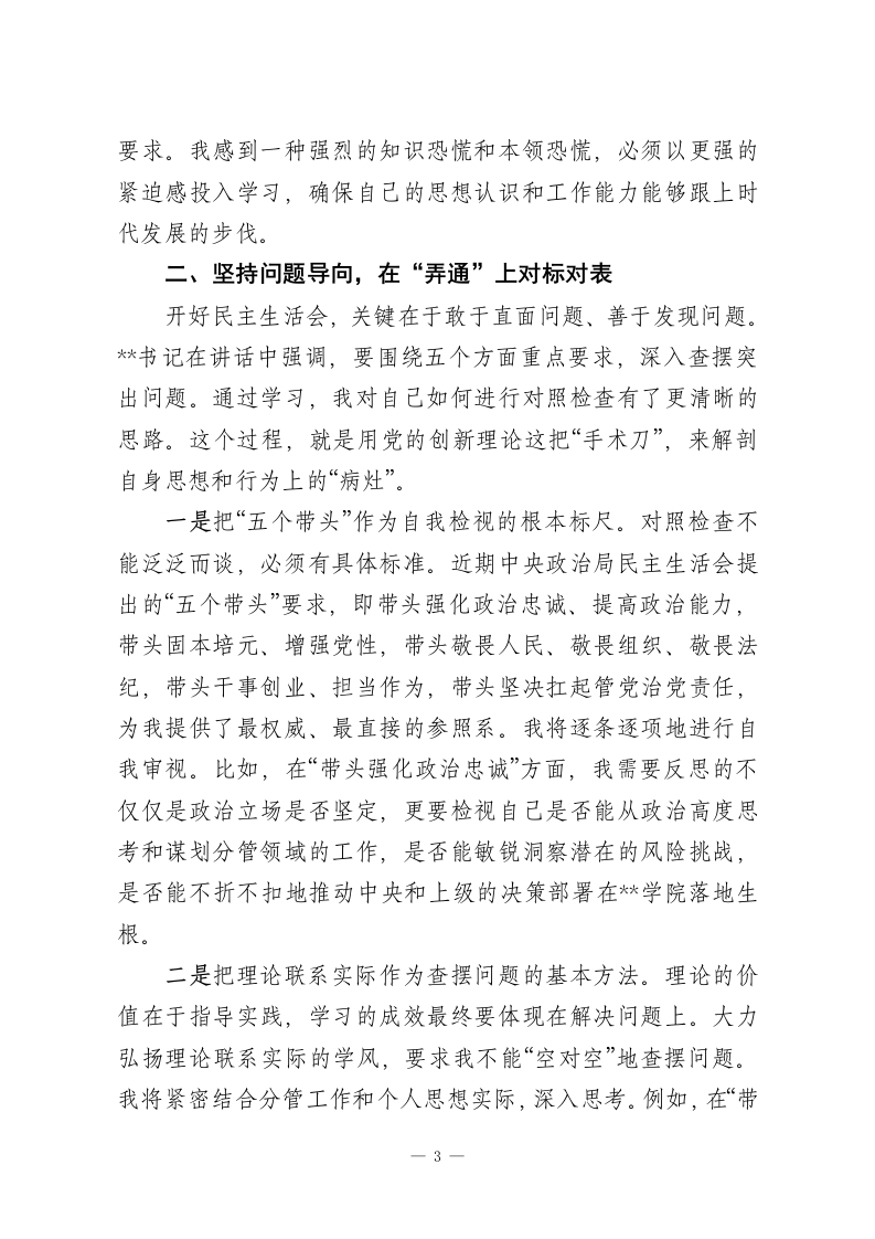 在学校民主生活会专题学习会上研讨发言材料同志们:根据单位安排,今天我们召开这次专题学习会,主要目的是为即将召开的2025年度党员领导干部民主生活会打牢思想基础。刚才,我们共同学习了指定内容,几位同志也作了很好的发言。下面,结合我的学习和思考,从个人角度谈三点不成熟的体会,以期与大家共同深化认识、凝聚共识,为开好一次高质量的民主生活会做好充分的思想准备。一、深化理论武装,在“学懂”上固本培元思想是行动的先导,理论是实践的指南。民主生活会既是一次严格的组织生活,更是一次深刻的党性洗礼和思想检视。会前的学习,就是一次思想上的“加油”和精神上的“补钙”。通过重温《习近平总书记关于党的建设的重要思想概论》《习近平关于加强党的作风建设的论述摘编》等重要内容,我感到收获很大,思想认识也得到进一步提升。一是通过系统学习,对党的自我革命的认识更加深刻。习近平总书记关于党的建设的重要思想,深刻回答了“建设什么样的长期执政的马克思主义政党、怎样建设长期执政的马克思主义政党”的重大时代课题。其中,自我革命是贯穿始终的一条鲜明主线。我深刻体会到,作为一名党员领导干部,自我革命绝不是一句空洞的口号,而是具体的、实践的。它要求我必须具备刀刃向内的勇气和刮骨疗毒的自觉。此次学习,让我从理论1-