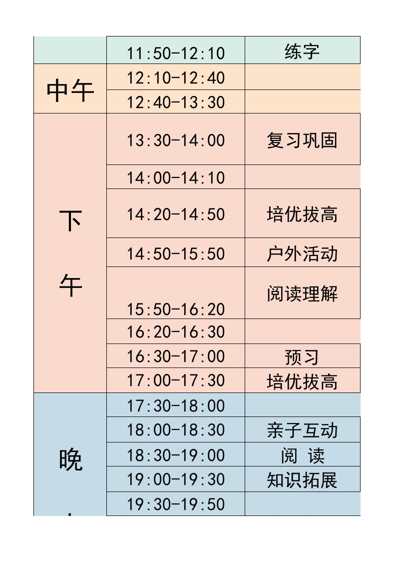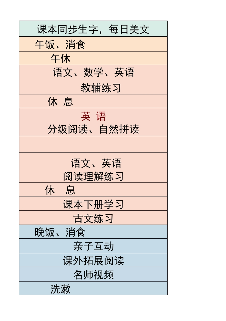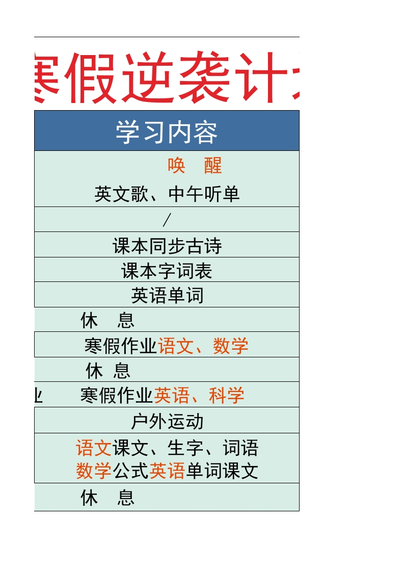 六年级-寒假衔接逆袭计划表tangqi888小时前发布关注私信15.42KB12页0319 第1页 / 共12页 第2页 / 共12页 第3页 / 共12页 第4页 / 共12页 第5页 / 共12页 试读已结束,还剩7页,您可下载完整版后进行离线阅读 六年级-寒假衔接逆袭计划表此内容为付费资源,请付费后查看¥9.9¥19.9VIP会员免费立即购买您当前未登录!建议登陆后购买,可保存购买订单付费资源© 版权声明本站是一个信息分享及获取的平台,不确保部分用户上传资料的来源及知识产权归属,资料由老师投稿,公开渠道整理,网友上传,如果侵犯到您的权益,请联系客服删除THE END教师资料 文本预览 2026版美时间任务上8:00-8:30起床8:30-9:00午早餐9:00-9:30晨读9:30-9:409:40-10:10塞假作业10:10-10:2010:30-10:50寒假作型10:50-11:10运动健身11:10-11:40预习11:40-11:50 查看更多 收起部分 喜欢就支持一下吧点赞9 分享QQ空间微博QQ好友海报分享复制链接收藏
