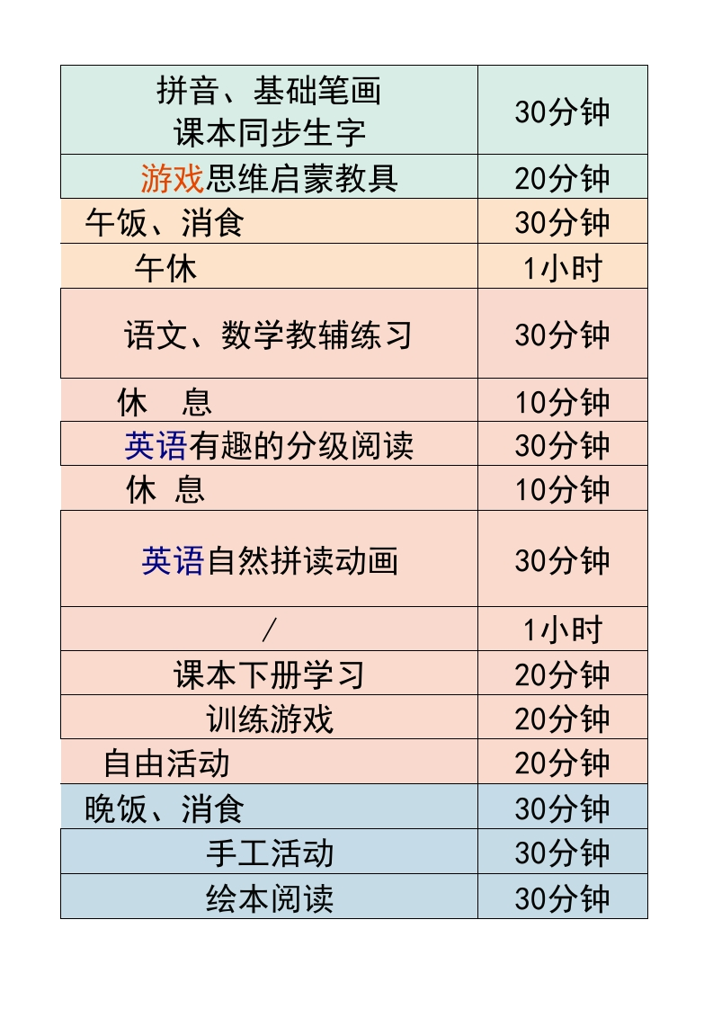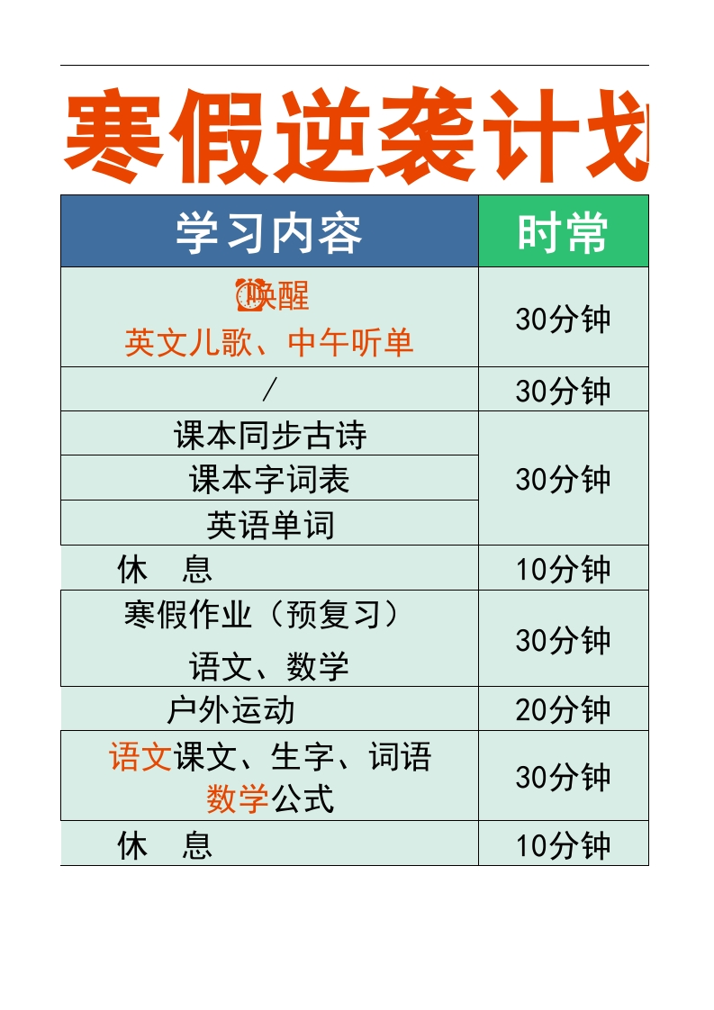 一年级-寒假衔接逆袭计划表tangqi889小时前发布关注私信15.62KB12页04514 第1页 / 共12页 第2页 / 共12页 第3页 / 共12页 第4页 / 共12页 第5页 / 共12页 试读已结束,还剩7页,您可下载完整版后进行离线阅读 一年级-寒假衔接逆袭计划表此内容为付费资源,请付费后查看¥9.9¥19.9VIP会员免费立即购买您当前未登录!建议登陆后购买,可保存购买订单付费资源© 版权声明本站是一个信息分享及获取的平台,不确保部分用户上传资料的来源及知识产权归属,资料由老师投稿,公开渠道整理,网友上传,如果侵犯到您的权益,请联系客服删除THE END教师资料 文本预览 2026版时间任务8:00-8:30起床8:30-9:00早餐上9:00-9:30晨读9:30-9:40午9:40-10:10塞假作业10:10-10:30运动健身10:30-11:00预习11:00-11:10 查看更多 收起部分 喜欢就支持一下吧点赞14 分享QQ空间微博QQ好友海报分享复制链接收藏
