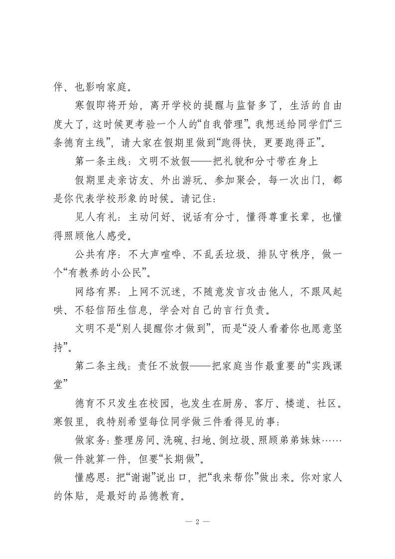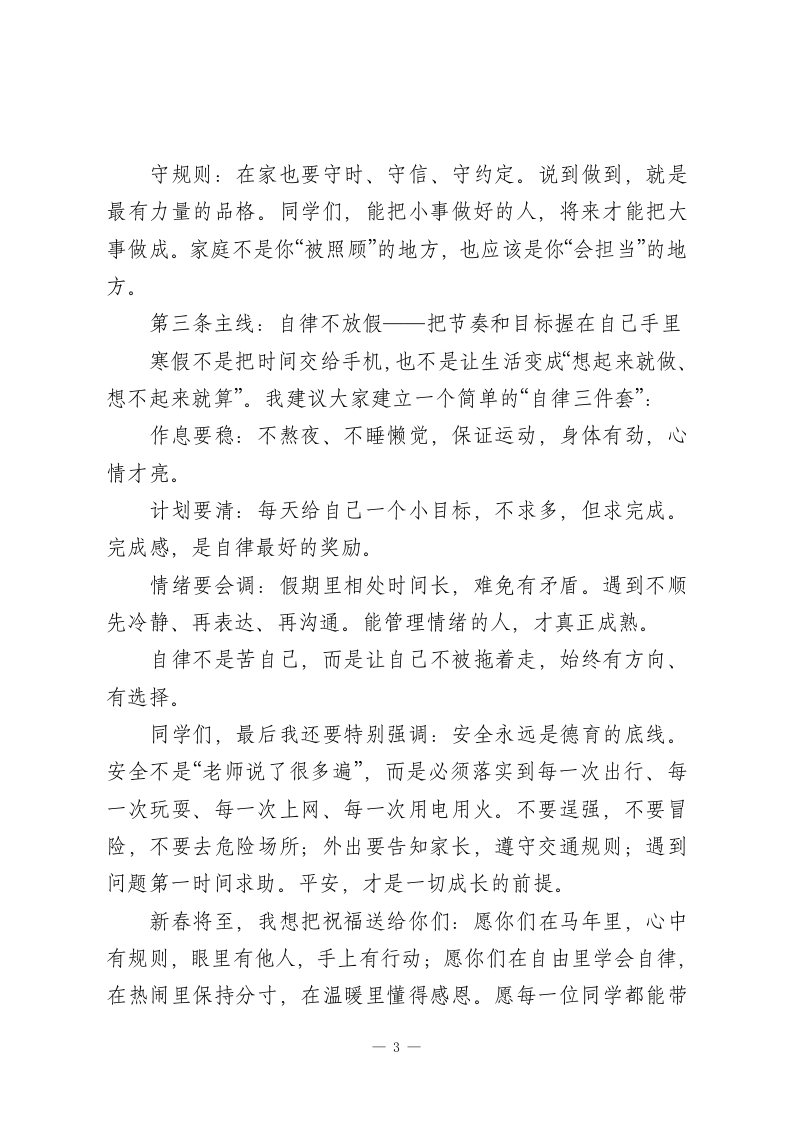 26年散学典礼德育主任讲话稿骐骥驰骋,势不可挡各位领导、各位老师,亲爱的同学们:大家上午好!今天,我们在这里举行马年寒假散学典礼。一个学期结束了,课堂的铃声暂时停下,但成长不会暂停。德育工作说到底,就是帮助同学们把“应该成为怎样的人”这件事,做得更清楚、更坚定、更有行动。借今天这个机会,我想从德育的角度,和大家说几句“假期一定要带回家”的话。我们这学期在学校里反复强调一个词一一习惯。德育不是几句口号,而是每天都能看见的举手投足;不是写在纸上的要求,而是你在走廊里会不会轻声慢步、在课堂上会不会认真守纪、在和同学相处时会不会懂得尊重与体谅。很多同学做得越来越好:见到老师会问好、排队更整齐了、教室卫生更干净了、值日更主动了、同伴之间更愿意帮一把了。这些变化很细,但特别珍贵,因为它们说明:你们正在把“文明”变成一种自然的表达,把“规则”变成一种自觉的选择。今天的主题是“骐骥驰骋,势不可挡”。从德育的角度看,真正的“势不可挡”,不是靠一时的冲劲,而是靠内心的底线和定力:有底线的人,知道什么事不能做;有定力的人,知道该做的事愿意坚持:有担当的人,知道自己的一言一行,会影响班级、影响同1